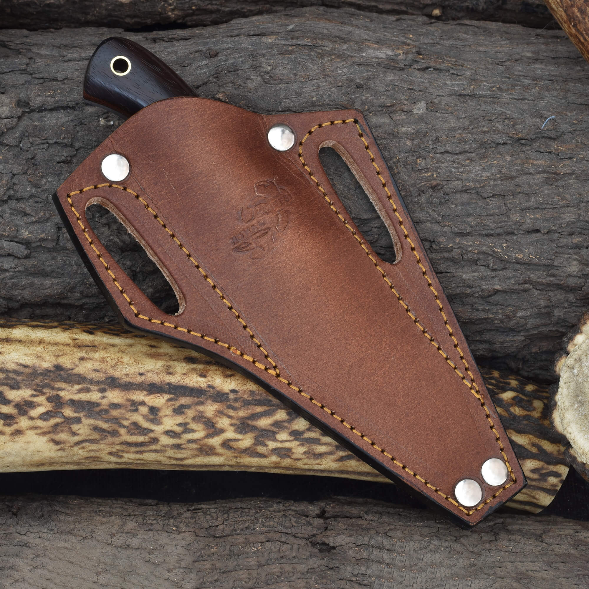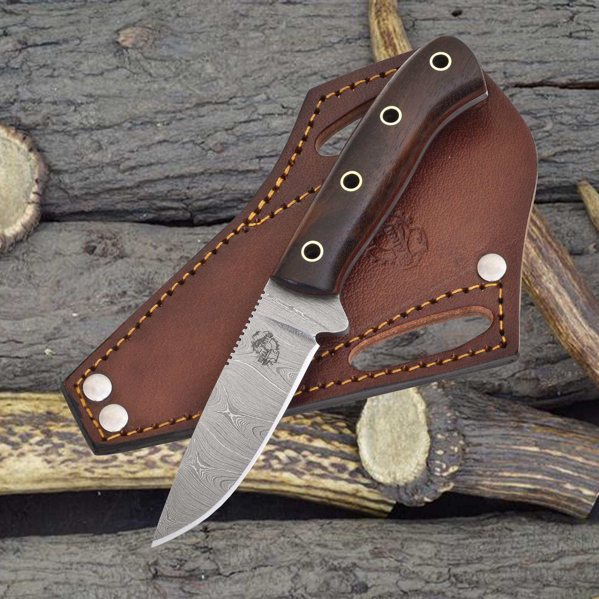 Enhance your daily carry with the Knives Ranch Damascus EDC Knife, featuring a 3.5" blade forged from premium Damascus steel for exceptional sharpness and strength. Designed for versatility, this compact knife excels at everyday tasks while offering lasting durability. The rosewood handle with fiber liner ensures a secure, comfortable grip. The Vegetable-Tanned Leather sheath features a 45-degree pancake design, ensuring convenient and stylish carry.