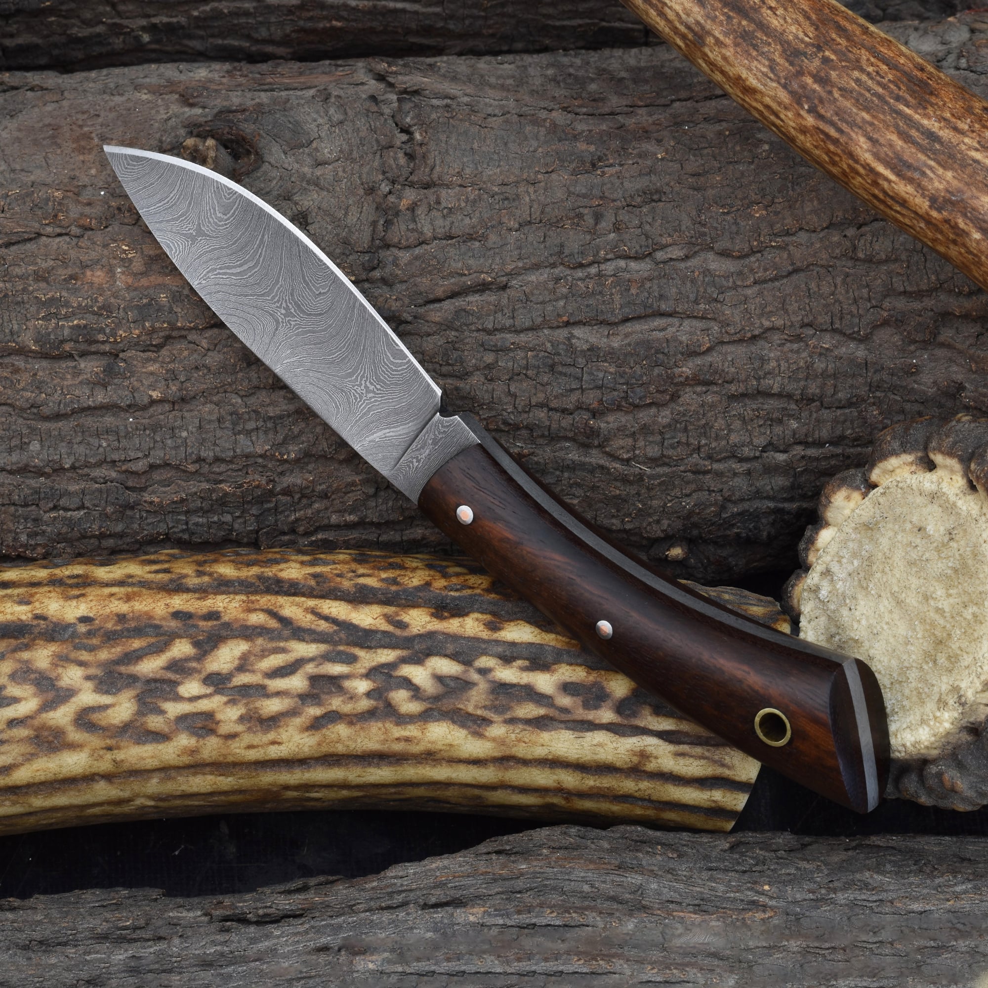 Achieve precision and durability with the Knives Ranch Damascus EDC Skinning Knife, featuring a 3-1/4" blade forged from premium Damascus steel. Perfectly designed for efficient skinning and detailed fieldwork, this knife ensures sharpness and edge retention. The rosewood handle with fiber liner offers a comfortable, secure grip, while the Vegetable Tanned Leather sheath with horizontal and vertical belt loops provides versatile carry options for every hunter.