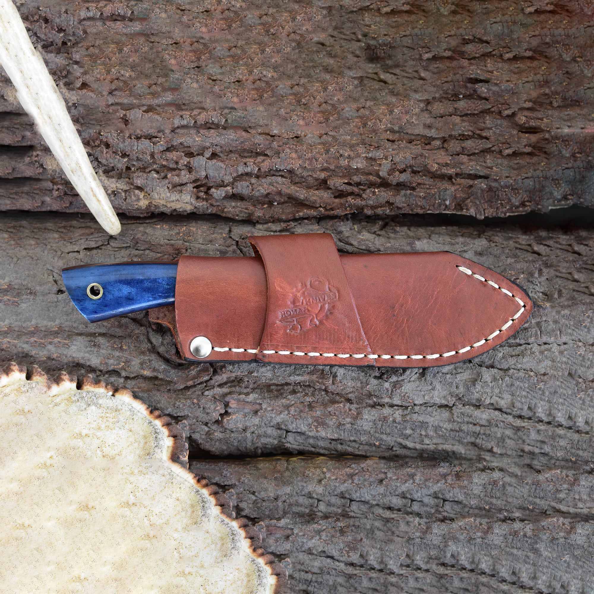 Elevate your hunting precision with the Knives Ranch Damascus Skinning Knife, featuring a 3-1/8" blade and 2-9/16" cutting edge crafted from exclusive Knives Ranch Damascus Steel (5160/4340). This knife offers exceptional sharpness and durability for detailed skinning tasks. The unique blue colored cattle bone handle with fiber liner provides a secure, comfortable grip and a one-of-a-kind look, as color saturation varies with each piece. The Vegetable Tanned Leather horizontal cowboy sheath with an extra vertical belt loop ensures versatile and convenient carry options.