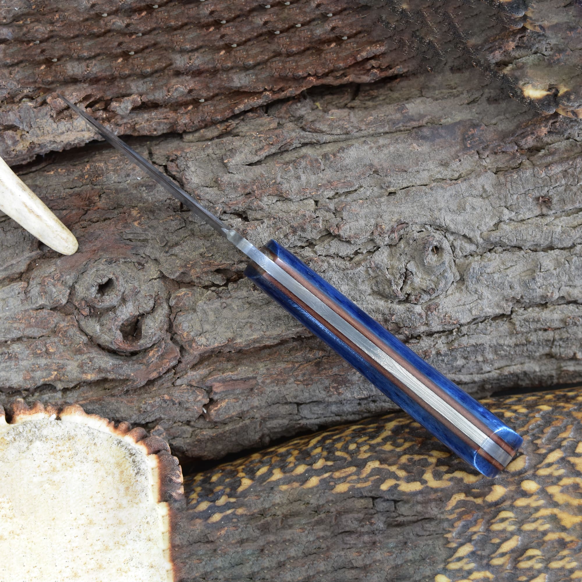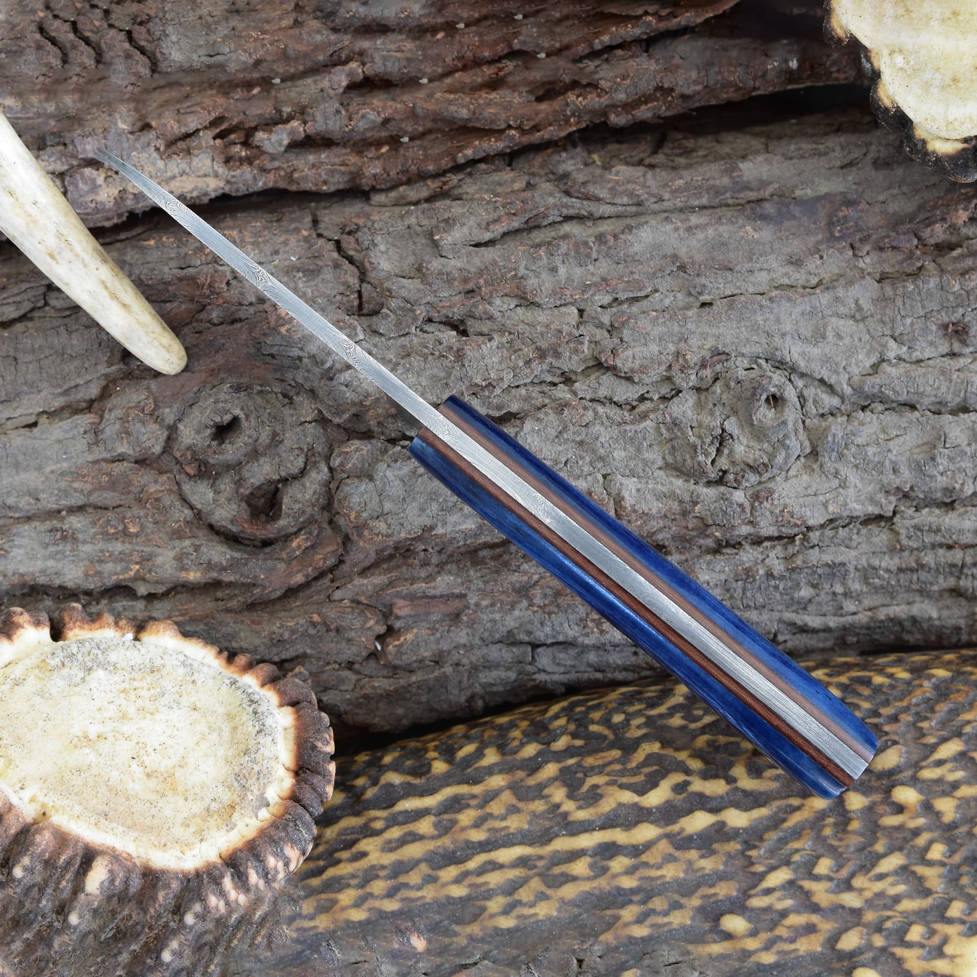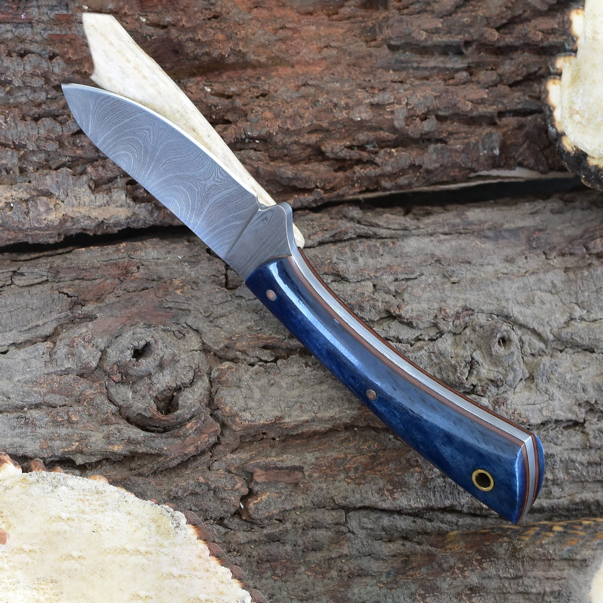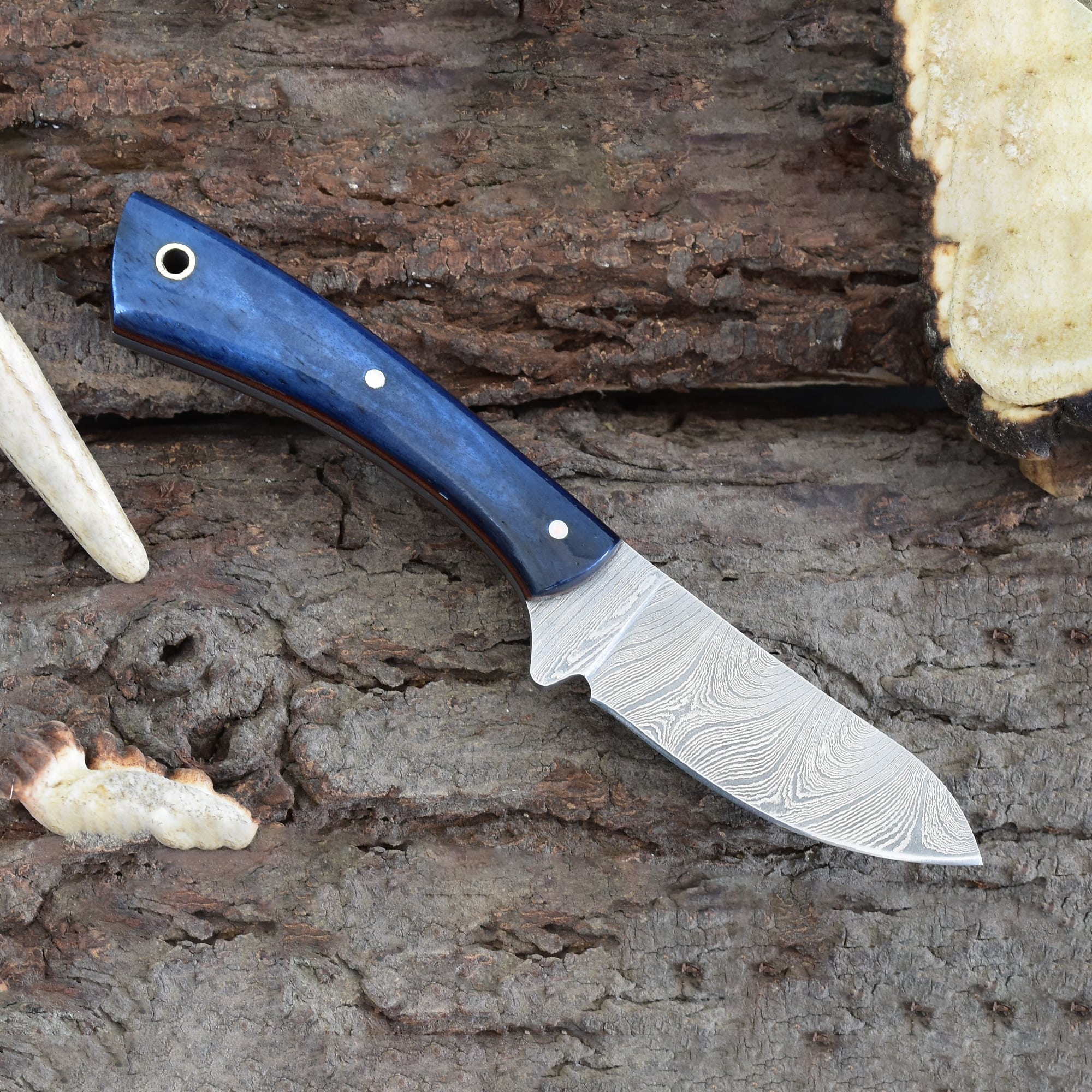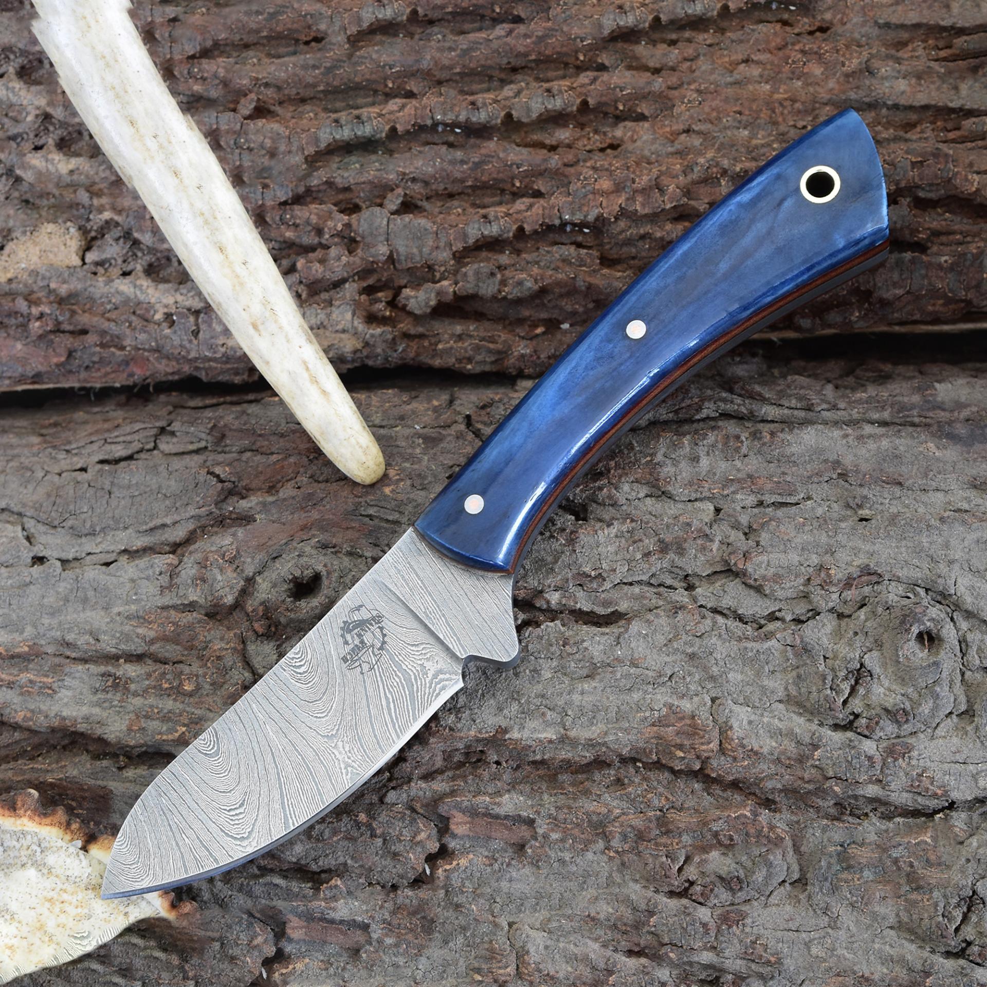 Knives Ranch Damascus Skinning Knife with Blue Colored Cattle Bone Handle and Fiber Liner
