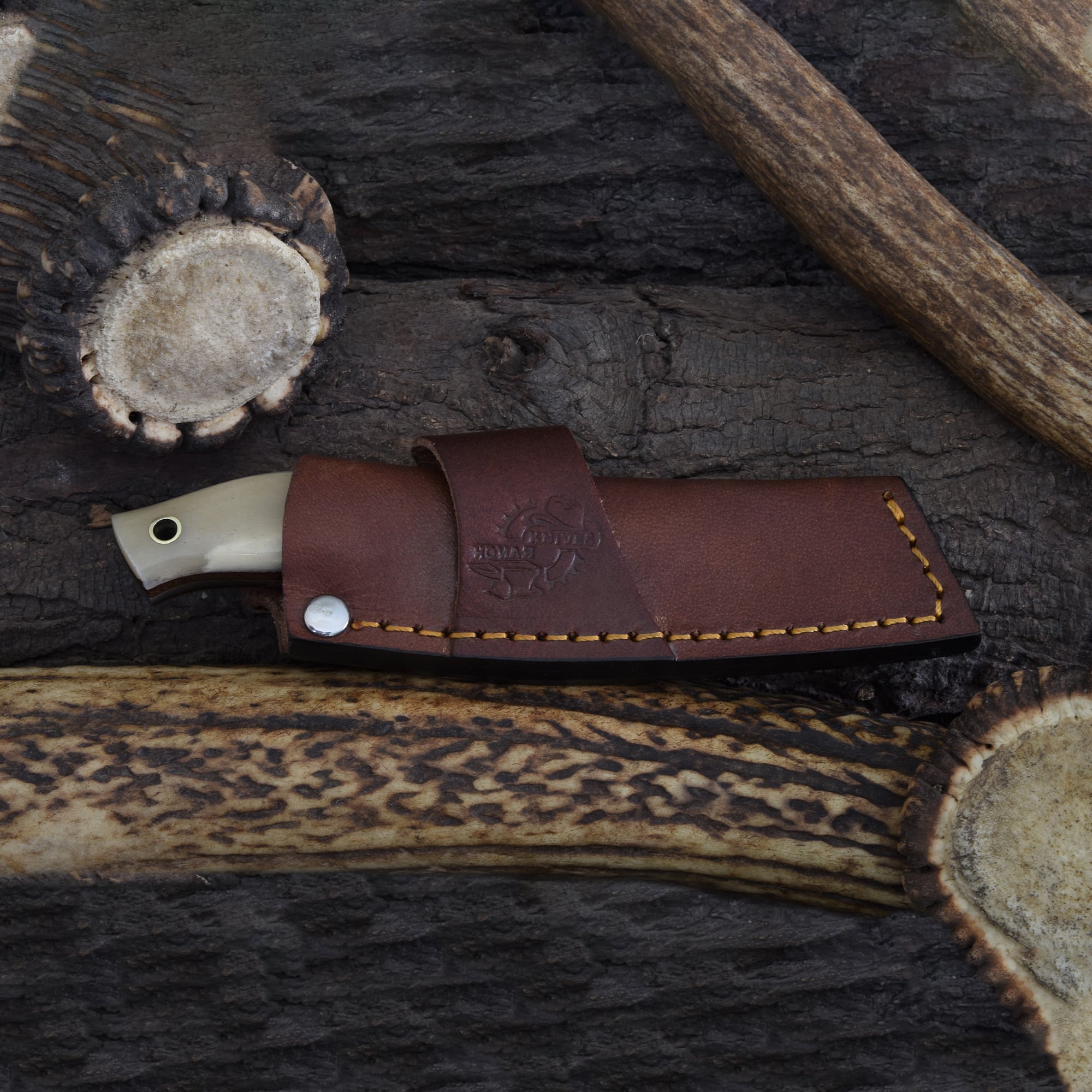 Discover the perfect blend of tradition and functionality with the Knives Ranch Damascus EDC Knife. This compact knife features a 3" blade forged from premium Damascus steel, offering exceptional sharpness and durability for everyday cutting needs. The bone handle with fiber liner provides a classic look and a secure, comfortable grip. It's a vegetable-tanned leather sheath with a dual carry design that supports both horizontal and vertical belt loops, ensuring versatile and convenient carry options.