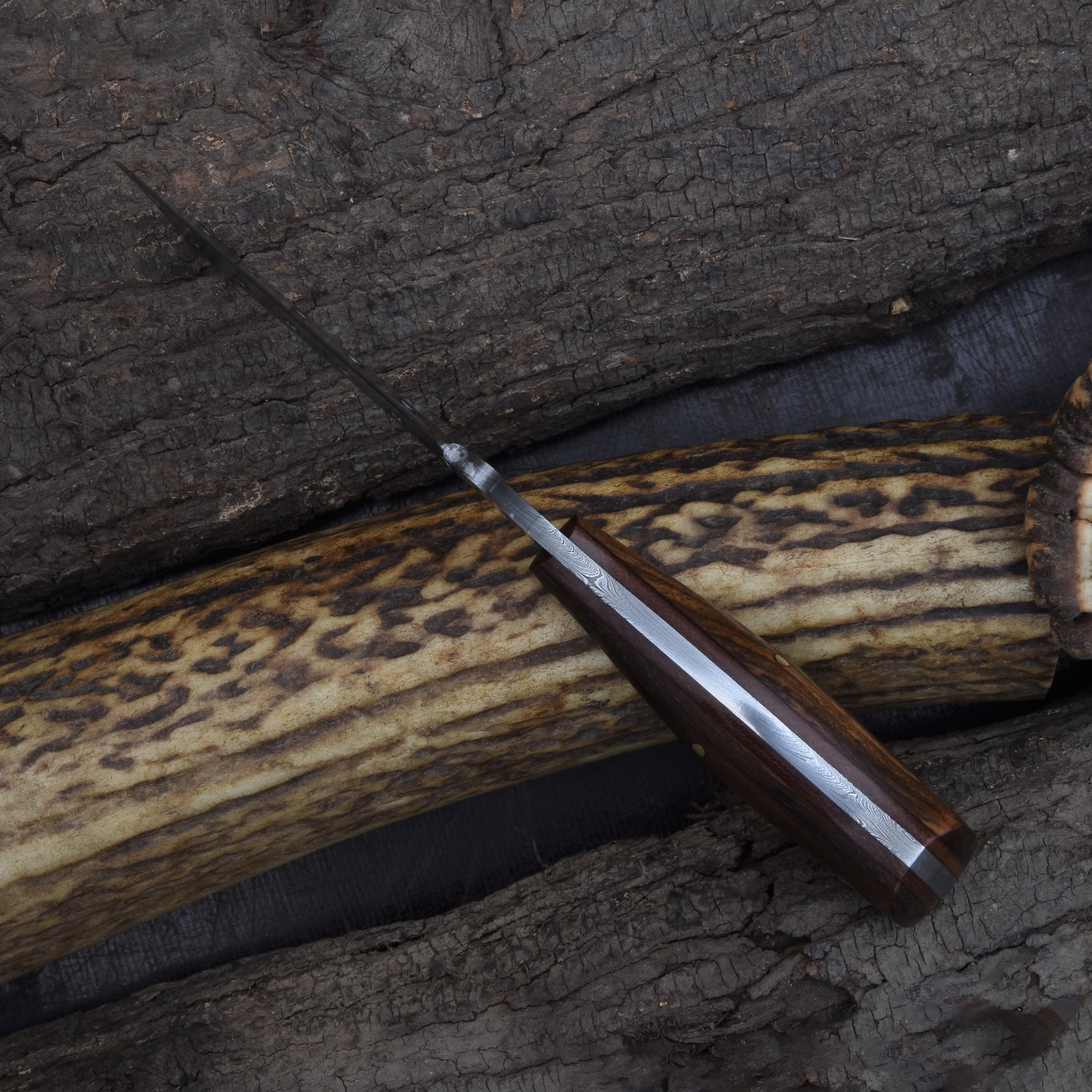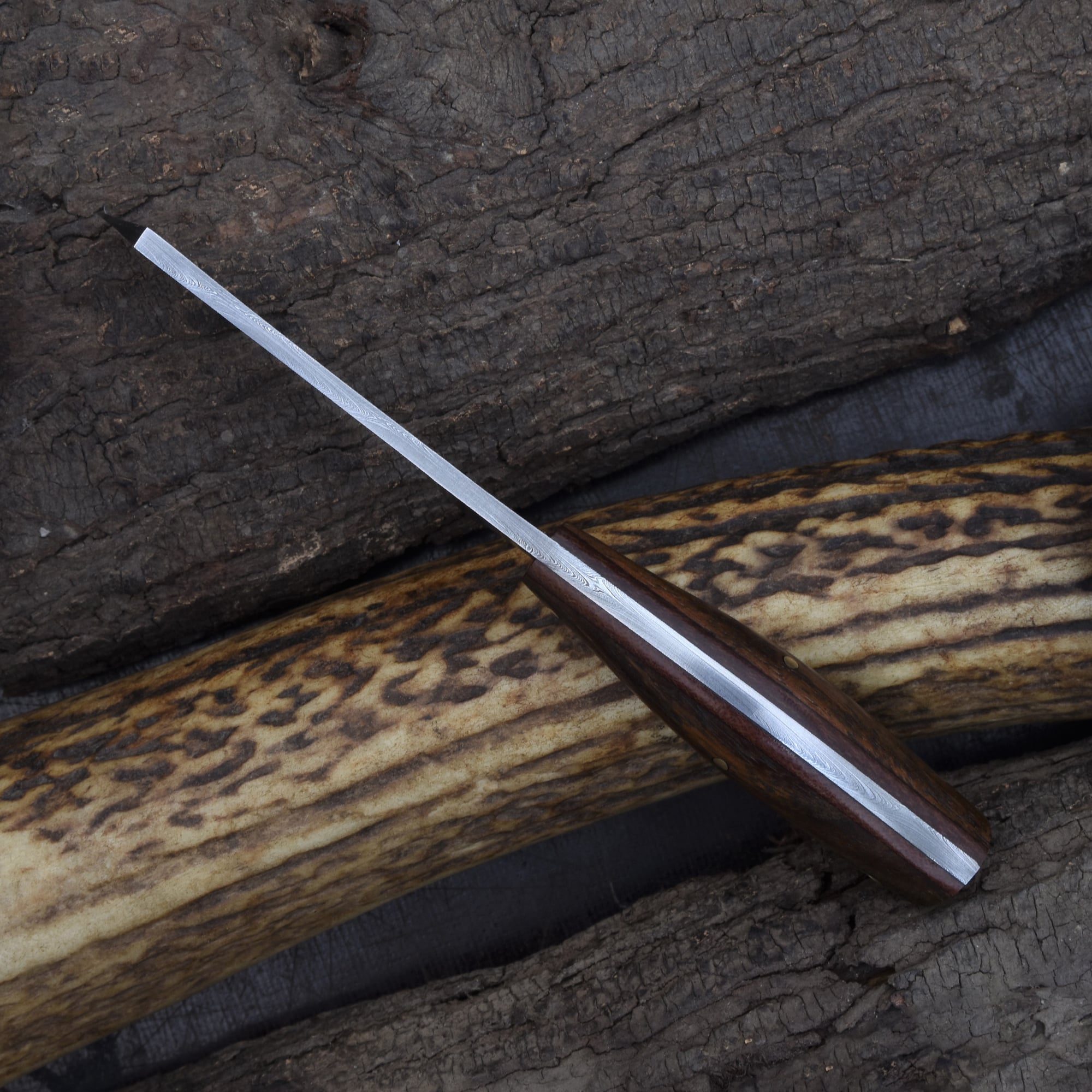 Enhance your daily carry with the Knives Ranch Damascus EDC Knife, featuring a 3" blade forged from premium Damascus steel for exceptional sharpness and strength. Designed for versatility, this compact knife excels at everyday tasks while offering lasting durability. The rosewood handle with fiber liner ensures a secure, comfortable grip, and the dual carry Vegetable Tanned Leather sheath allows both horizontal and vertical belt loop options for convenient and flexible carry.