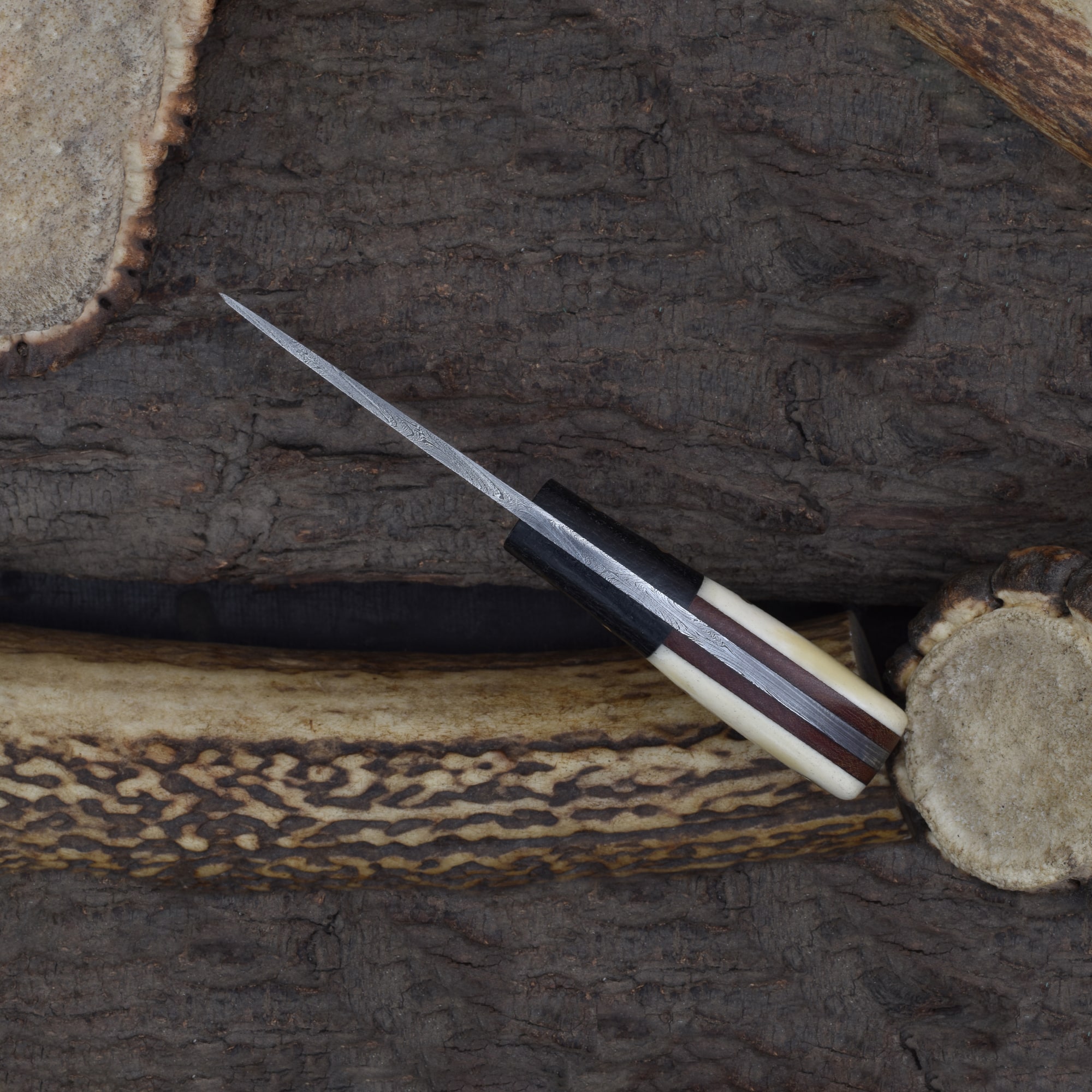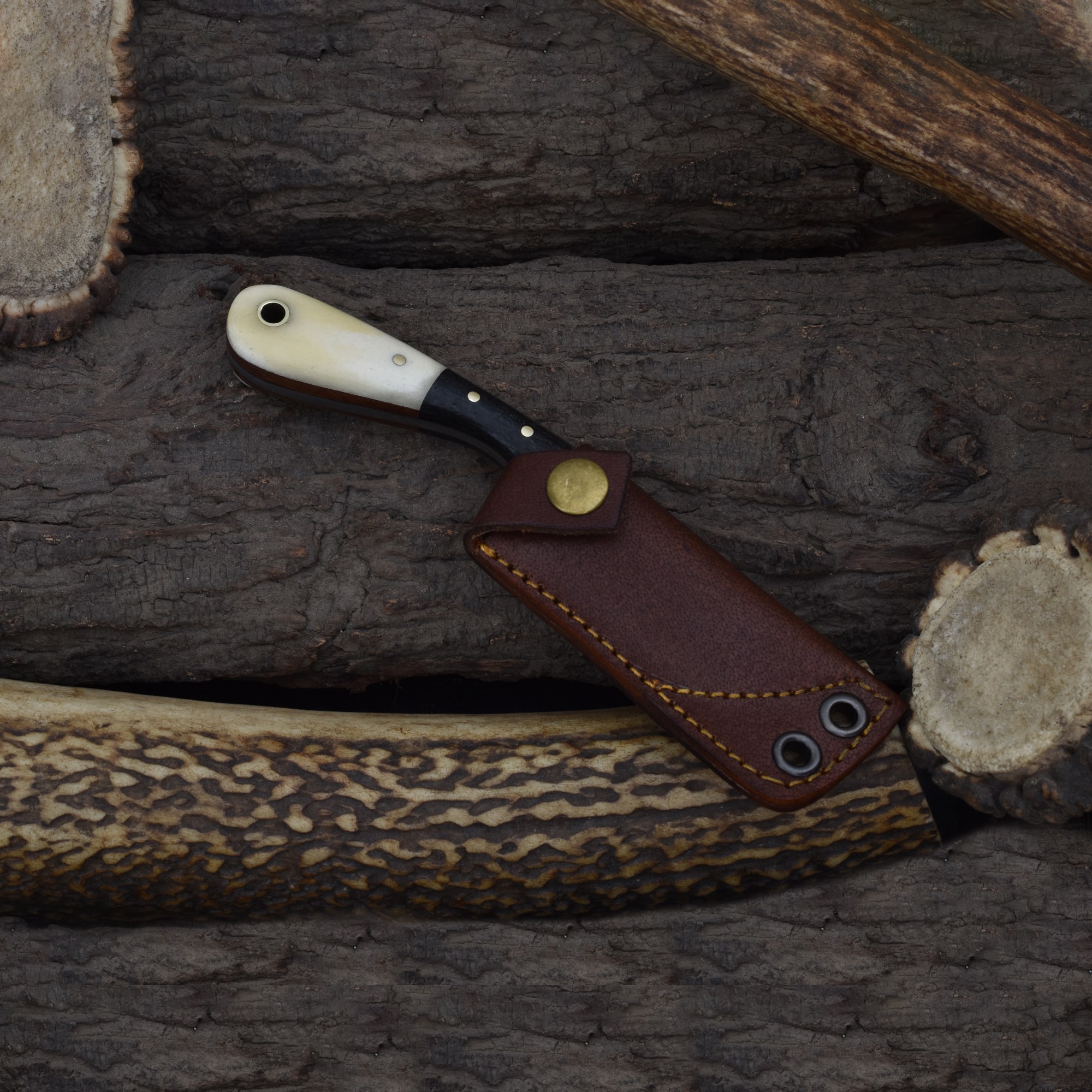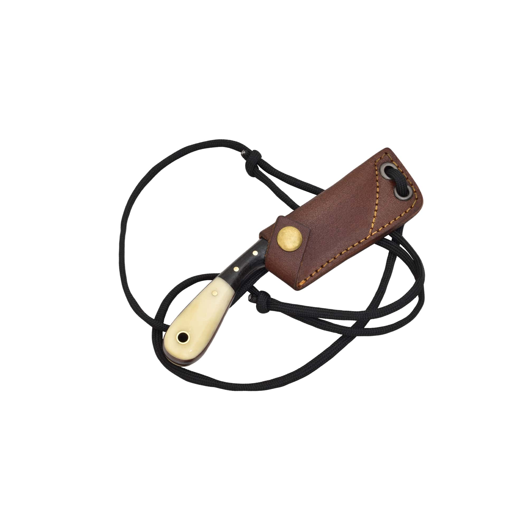 Introducing the Knives Ranch Damascus Neck Knife, a sleek and compact blade designed for easy carry and reliable performance. The 2-1/2" Damascus steel blade offers excellent edge retention, strength, and the unique layered patterns Damascus is known for. Its handle, crafted from polished bone with a fiber liner, provides a comfortable and secure grip while adding a touch of classic elegance. Paired with a handcrafted Vegetable Tanned Leather neck sheath with string, this knife is perfect for everyday carry or outdoor adventures.