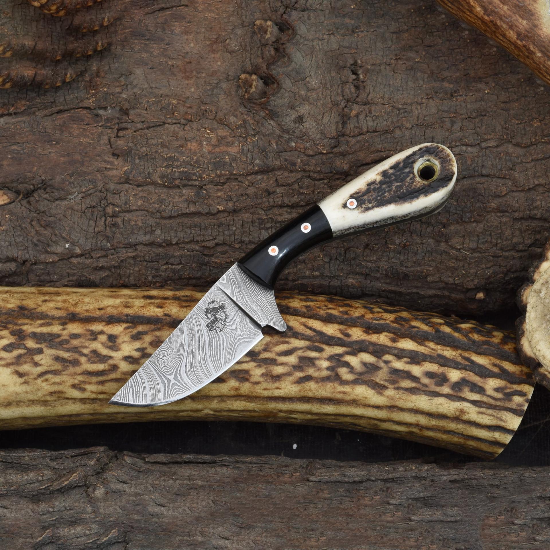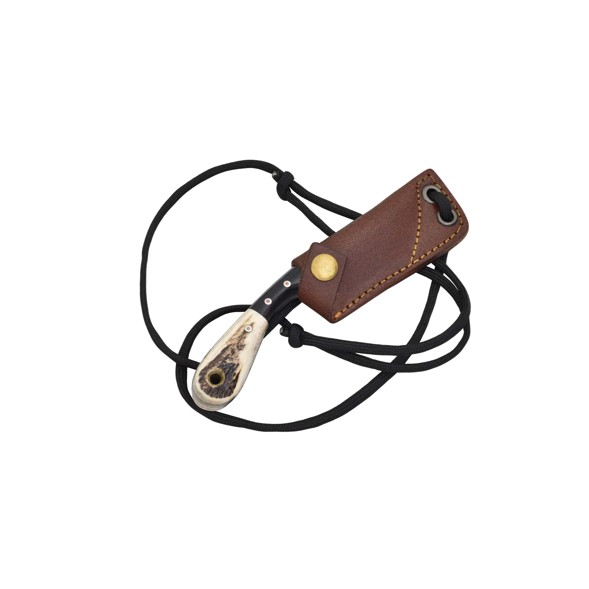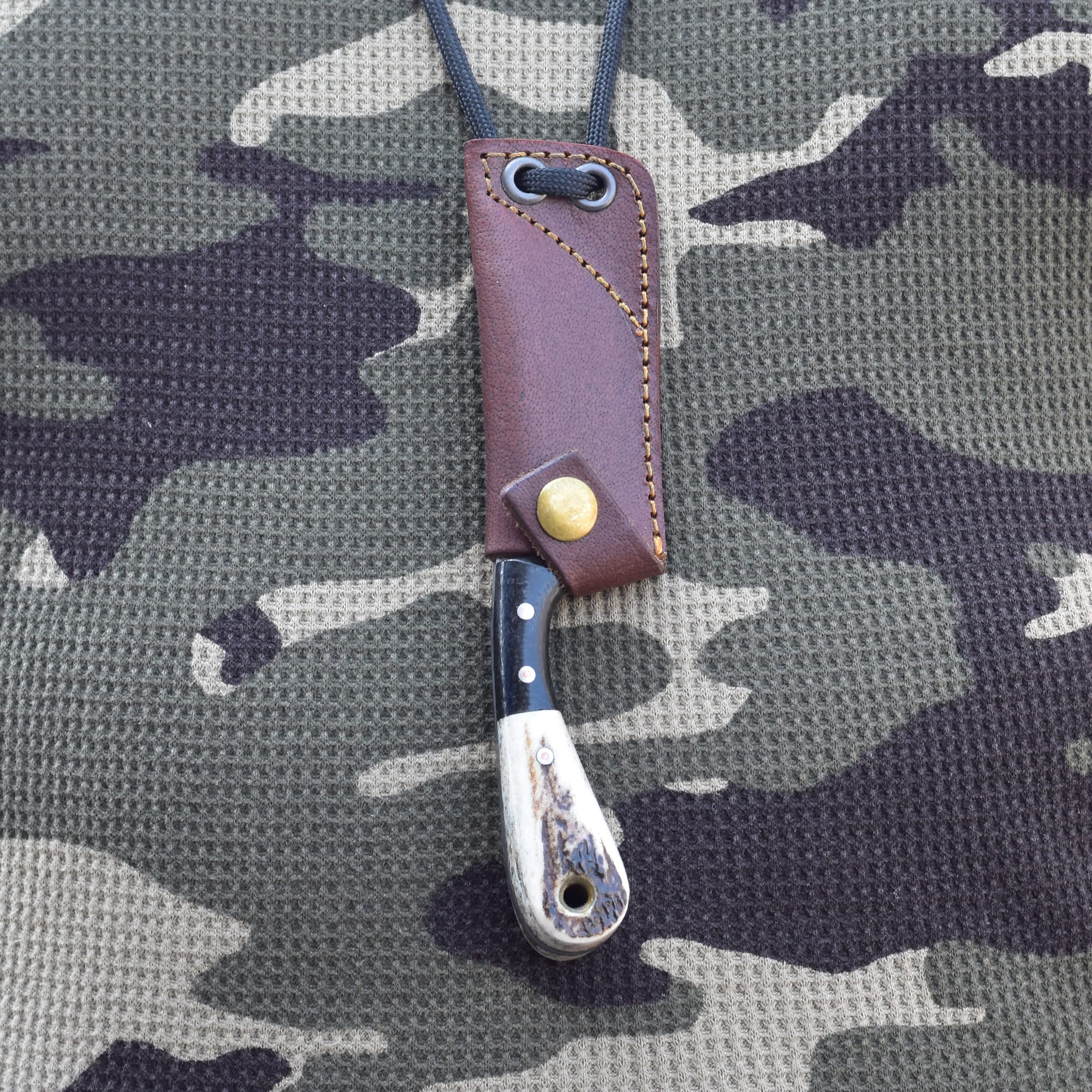 Introducing the Knives Ranch Damascus Neck Knife, a compact yet powerful tool designed for everyday carry and outdoor use. Featuring a 2-1/2" Damascus steel blade, it offers exceptional sharpness, strength, and the signature layered beauty of Damascus. The handle is crafted from genuine deer antler combined with black burlap micarta, providing a unique, comfortable, and secure grip. This neck knife comes with a durable Vegetable Tanned Leather sheath equipped with a string, allowing for convenient and stylish neck carry wherever your adventures take you.