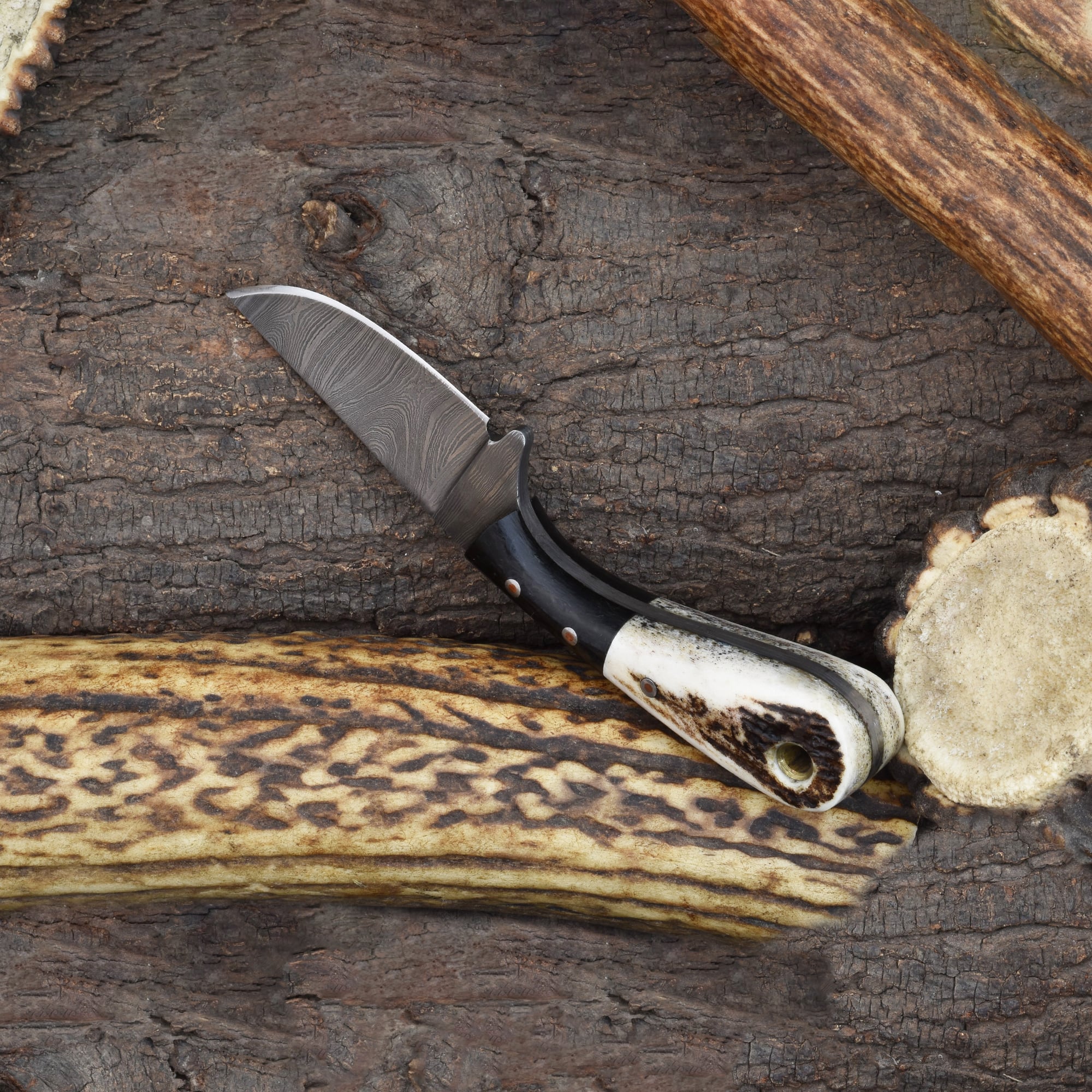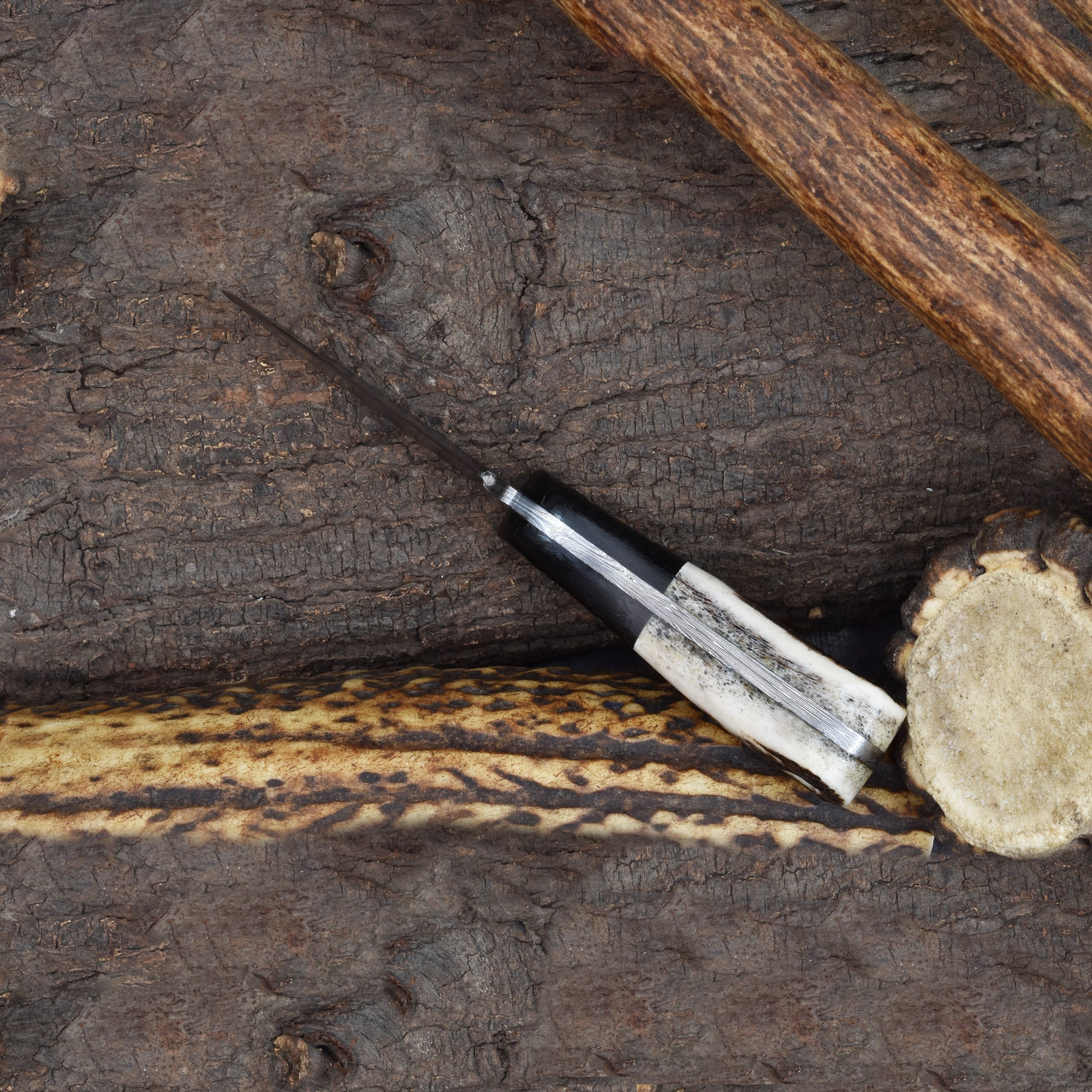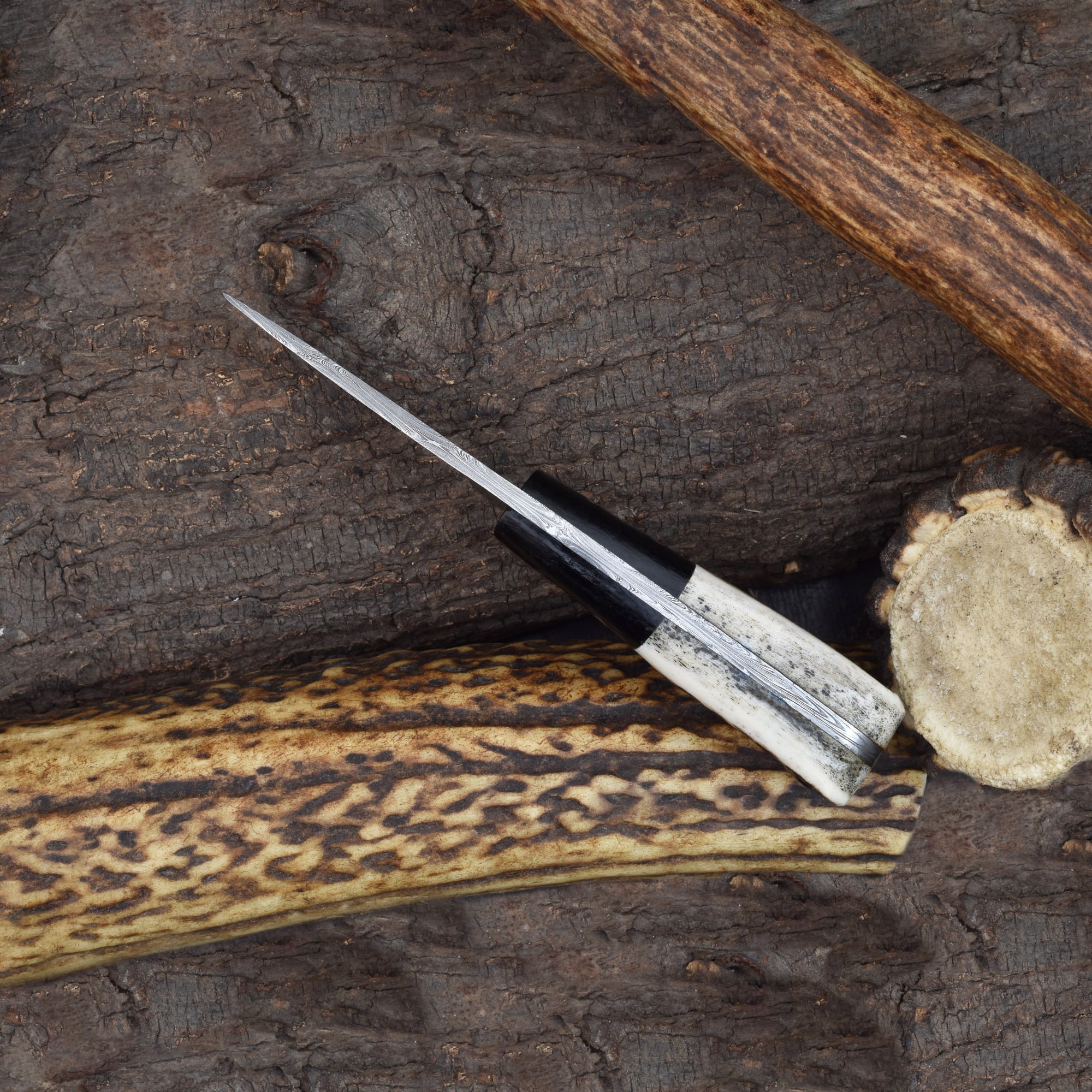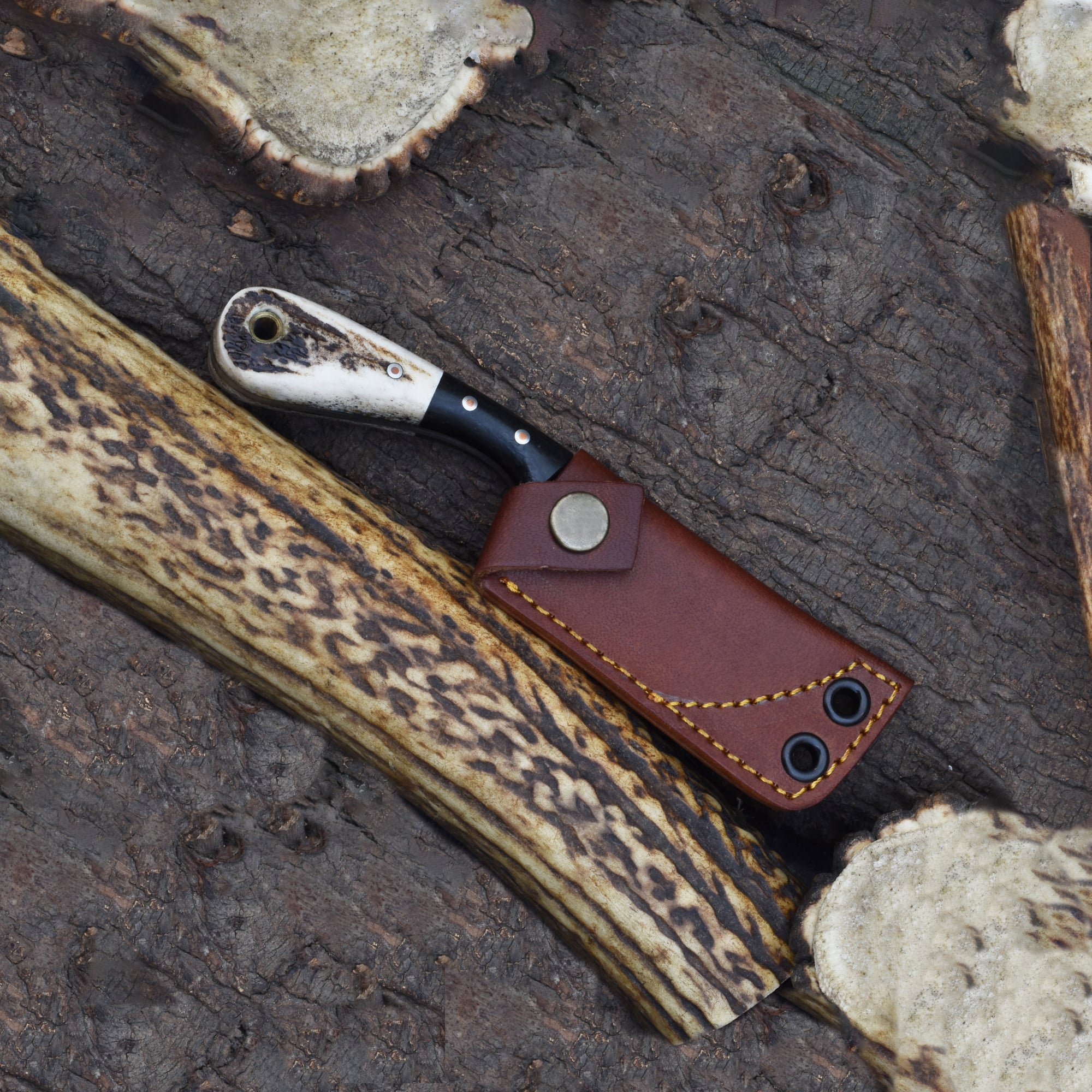 Introducing the Knives Ranch Damascus Neck Knife, a compact yet powerful tool designed for everyday carry and outdoor use. Featuring a 2-1/2" Damascus steel blade, it offers exceptional sharpness, strength, and the signature layered beauty of Damascus. The handle is crafted from genuine deer antler combined with black burlap micarta, providing a unique, comfortable, and secure grip. This neck knife comes with a durable Vegetable Tanned Leather sheath equipped with a string, allowing for convenient and stylish neck carry wherever your adventures take you.