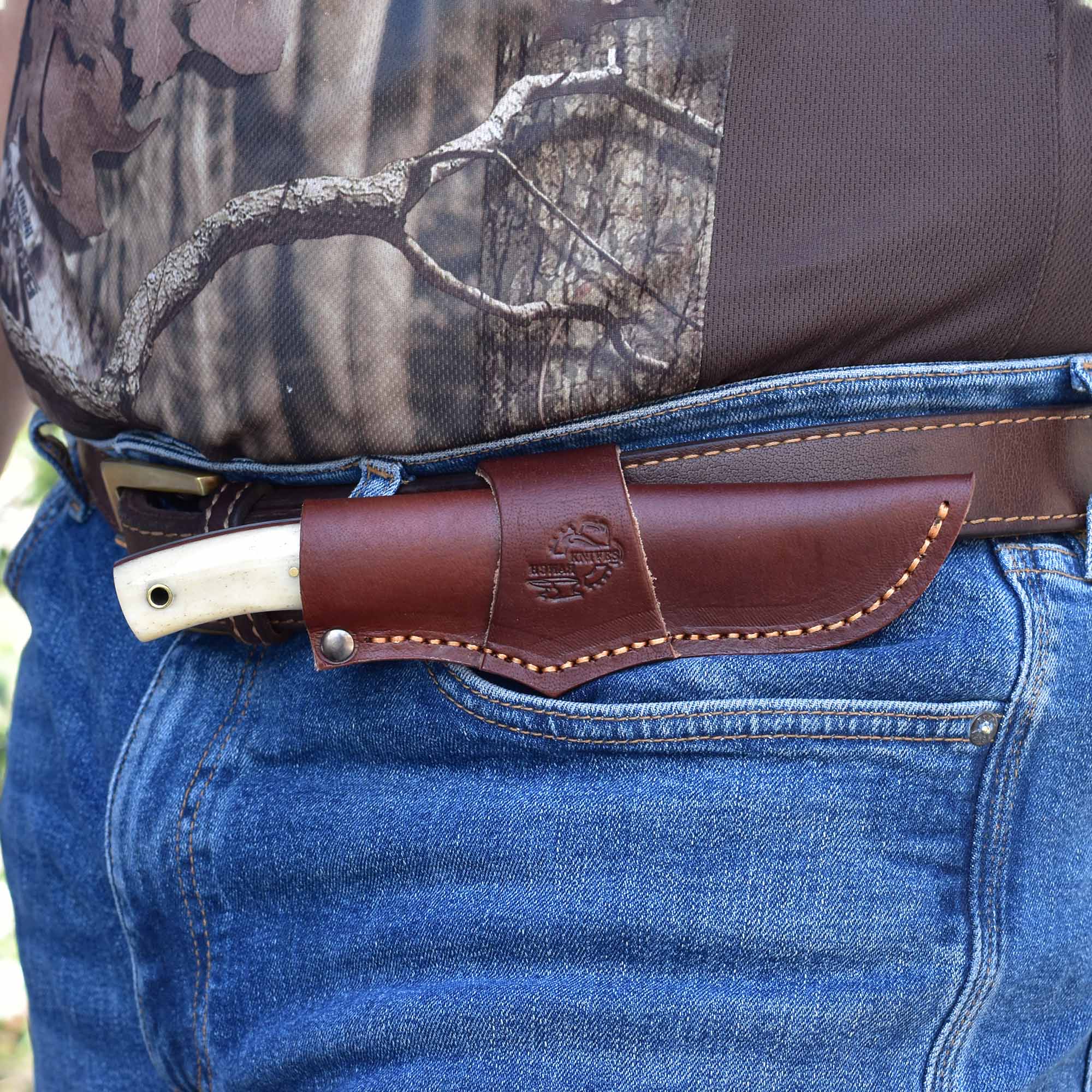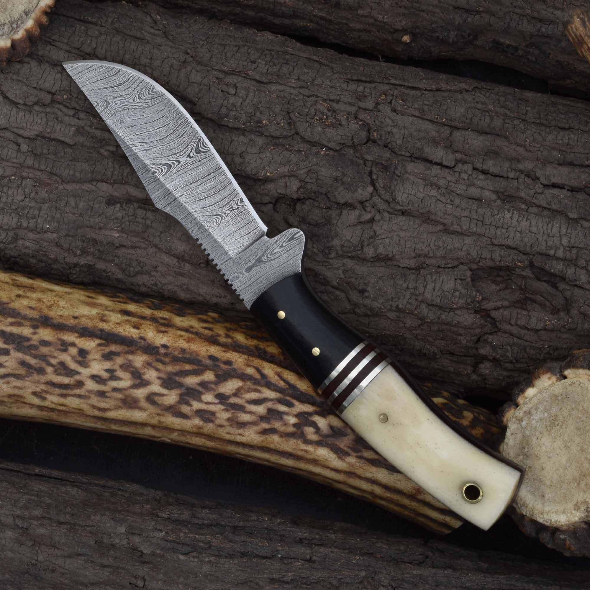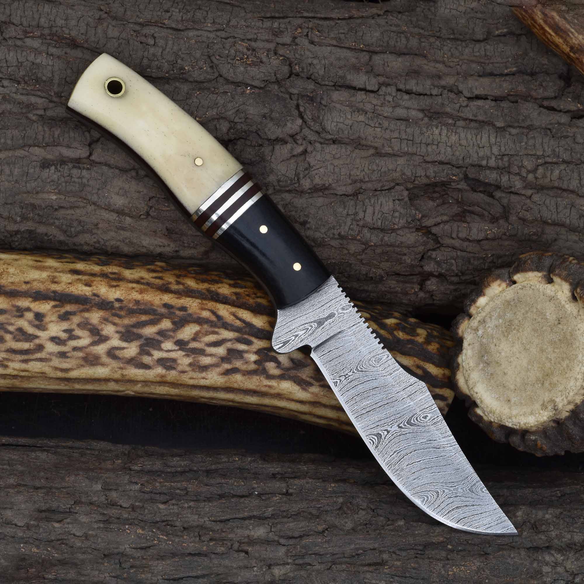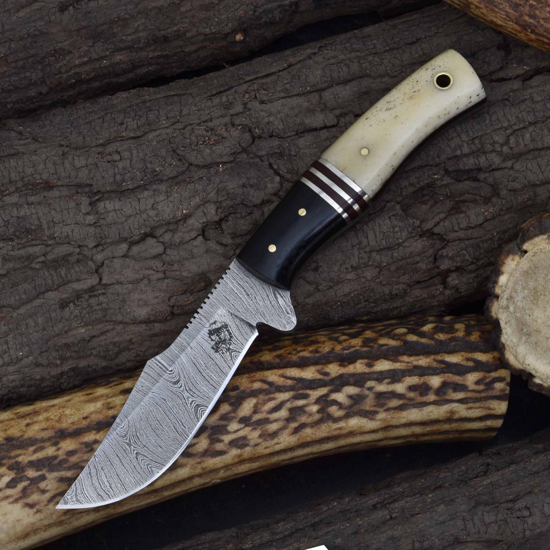 Beautiful Damascus layering extends the full length of the hilt. Blade is 4.6 mm. wide full tang. Comes extremely sharp. Very heavy, sturdy and well balanced. Heavy sheath protects the blade well and fits my 1 1/2 inch belt well.