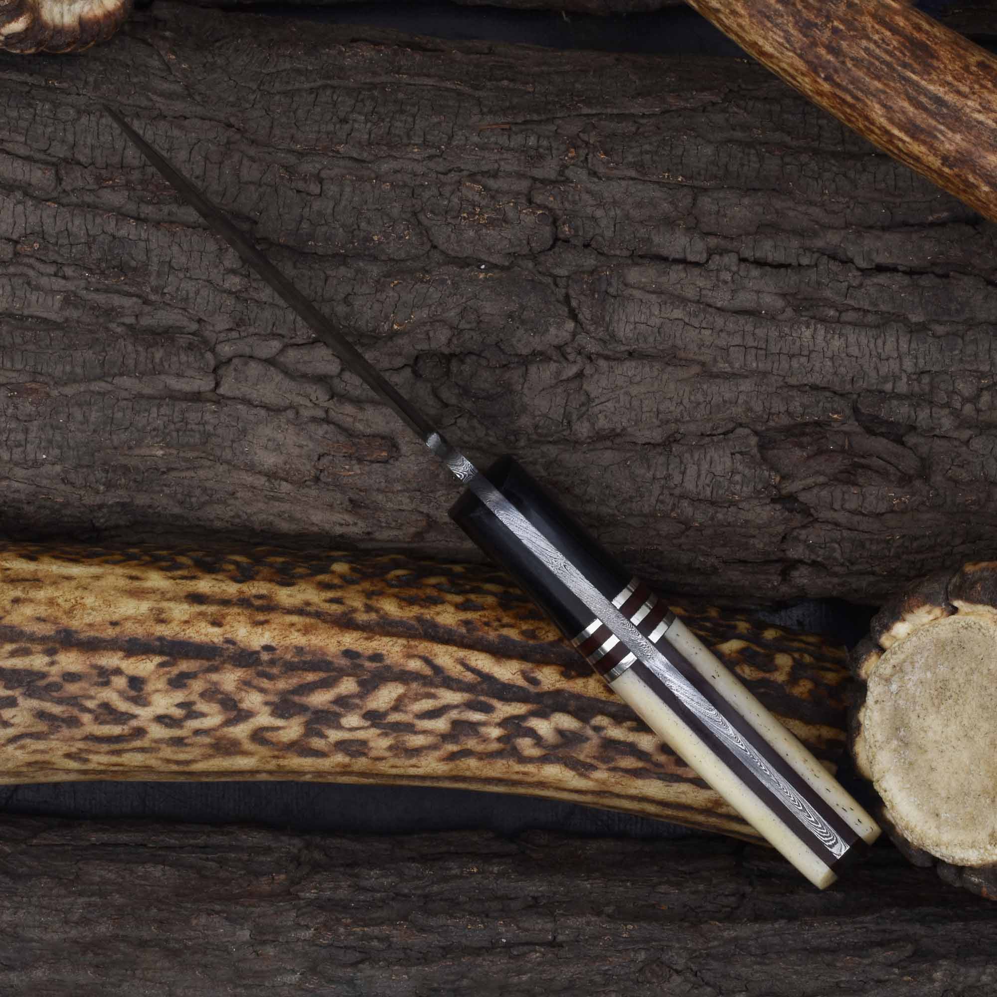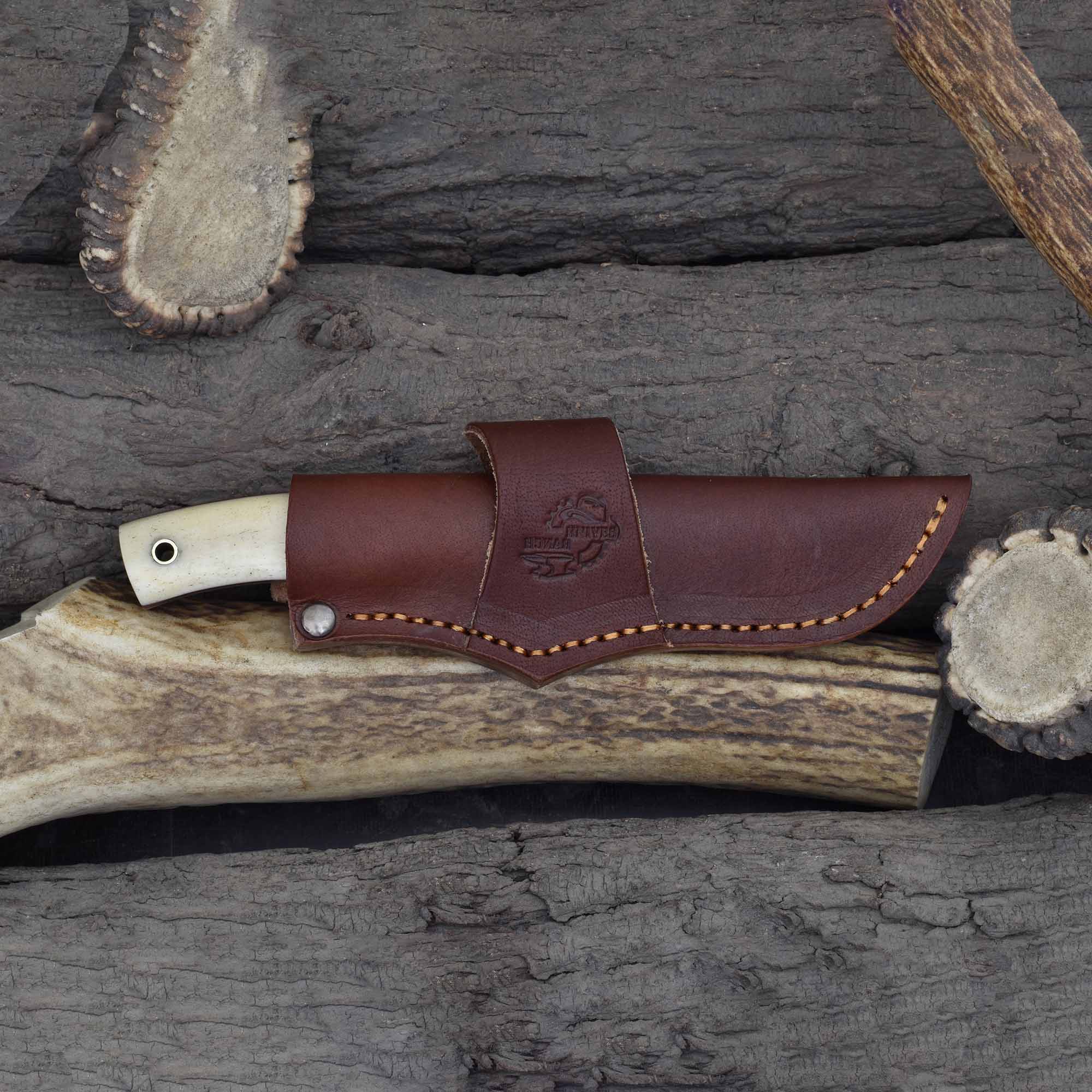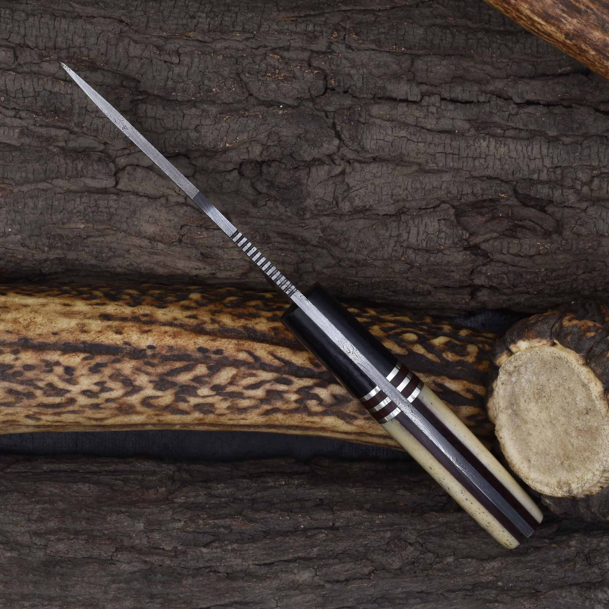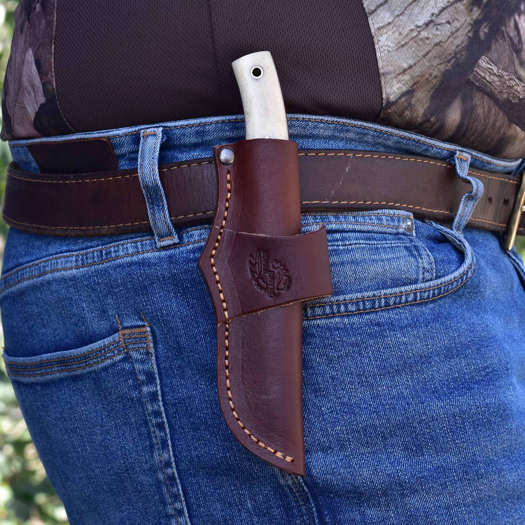 Beautiful Damascus layering extends the full length of the hilt. Blade is 4.6 mm. wide full tang. Comes extremely sharp. Very heavy, sturdy and well balanced. Heavy sheath protects the blade well and fits my 1 1/2 inch belt well.