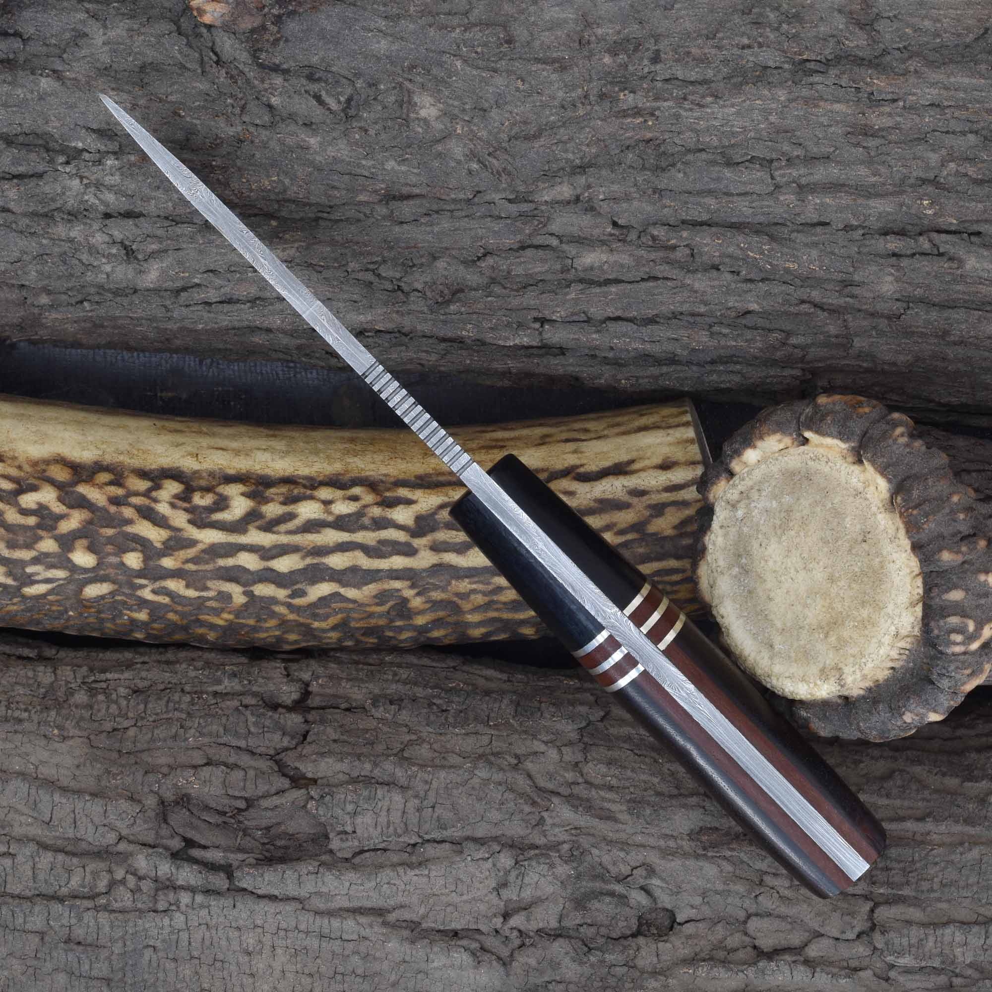 Experience rugged elegance and precise performance with the Knives Ranch Damascus hunting knife with Micarta and rosewood handle. Crafted for serious outdoorsmen and collectors, this knife features a hand-forged Damascus steel blade that offers excellent edge retention and cutting power. The unique combination of black burlap Micarta and rosewood, accented with nickel silver and fiber inserts, delivers a secure grip and refined aesthetic.
