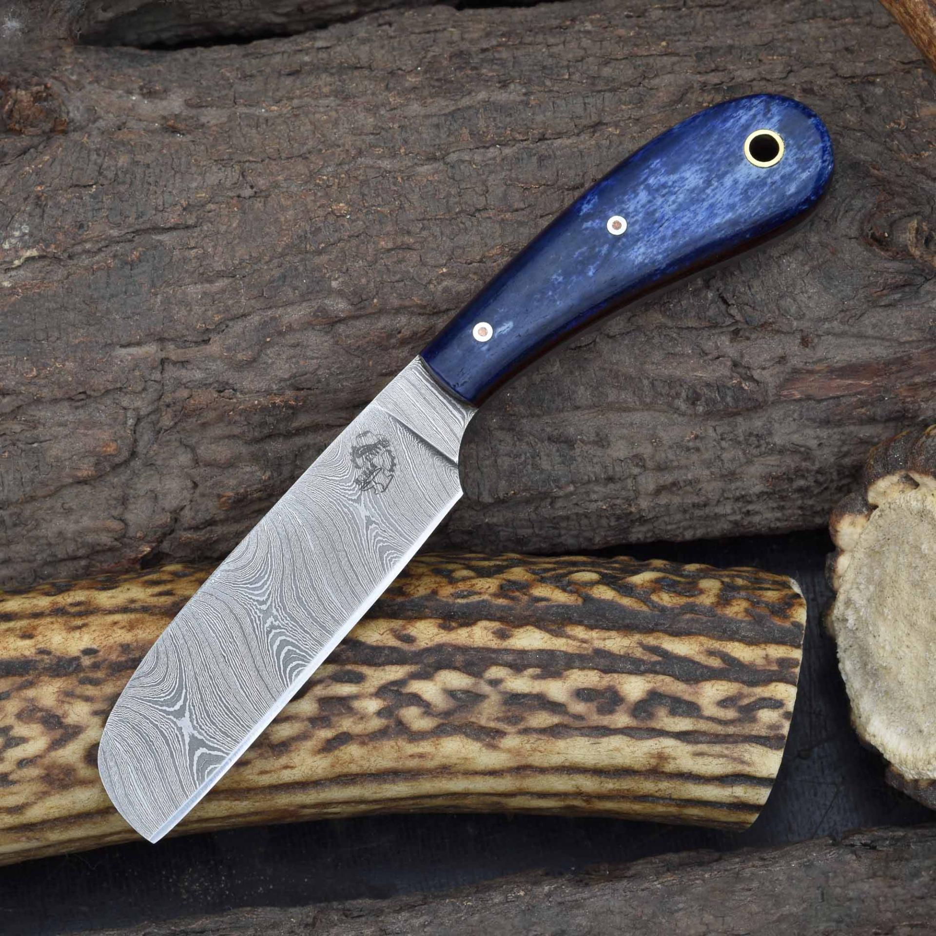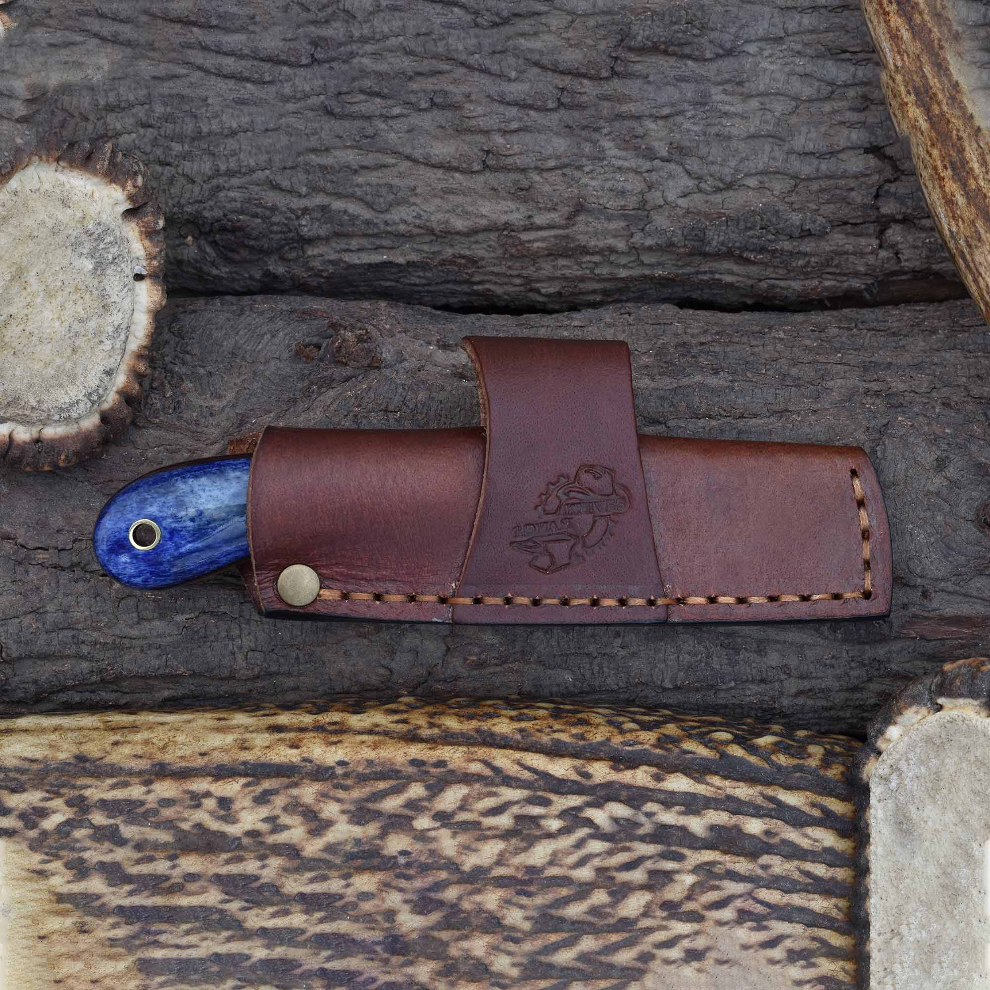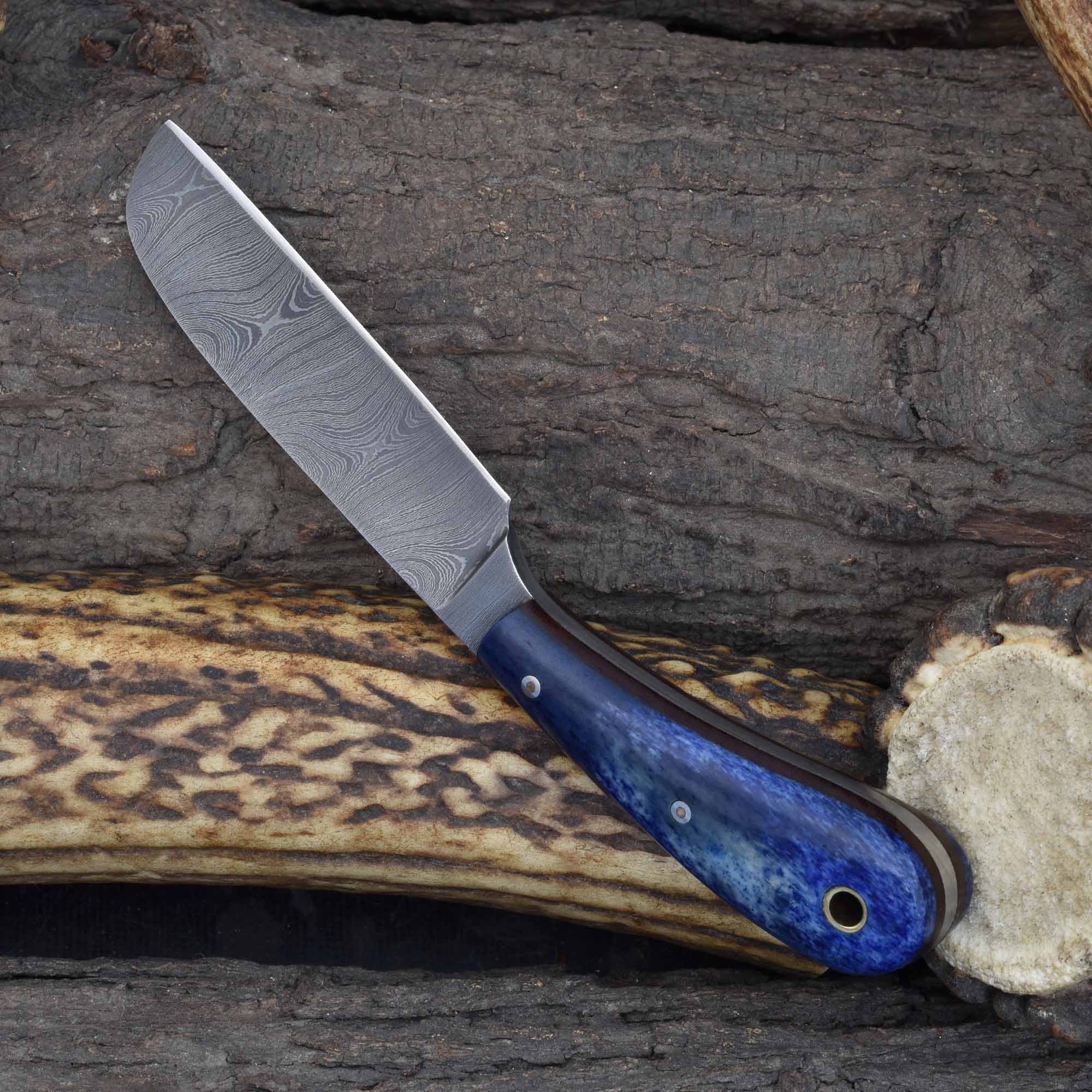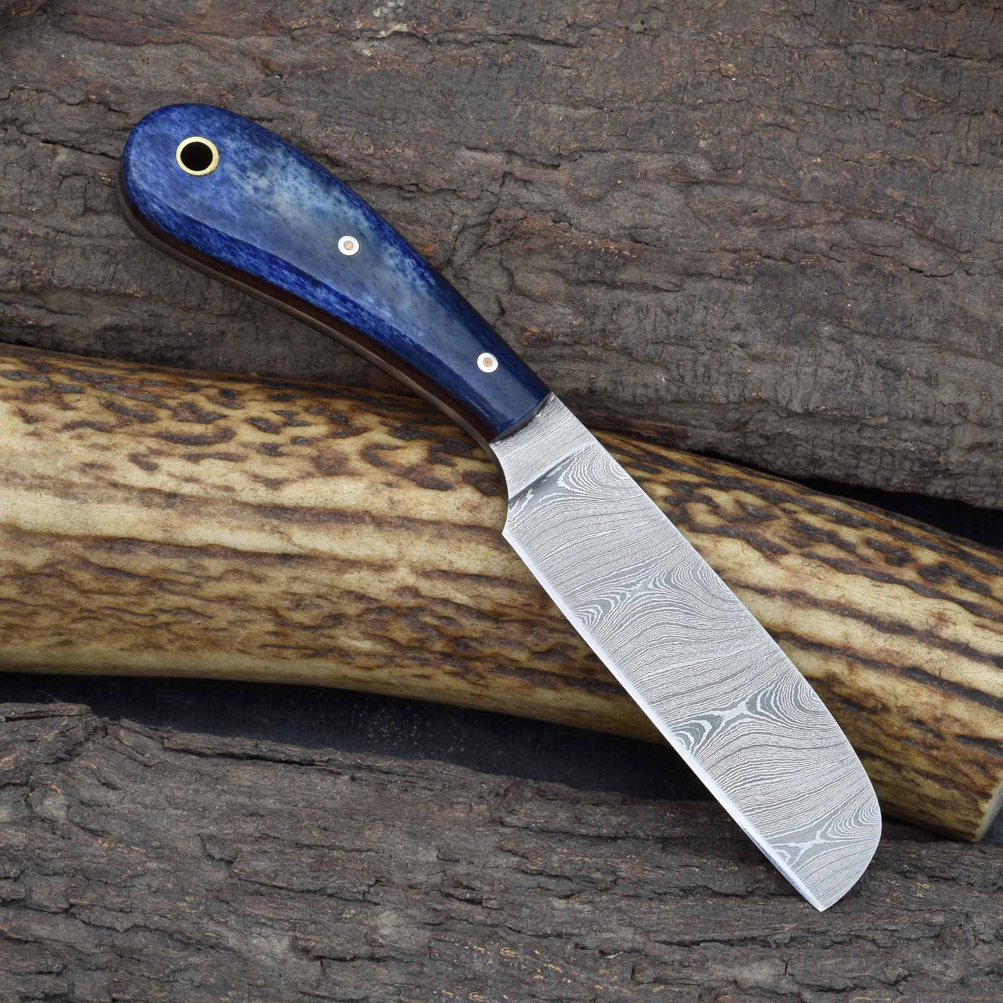 This knife is an excellent choice as a decorative Damascus veterinary blade, a practical blue bone fixed blade for livestock care, and a reliable field-ready castration tool for ranchers and farmers.
