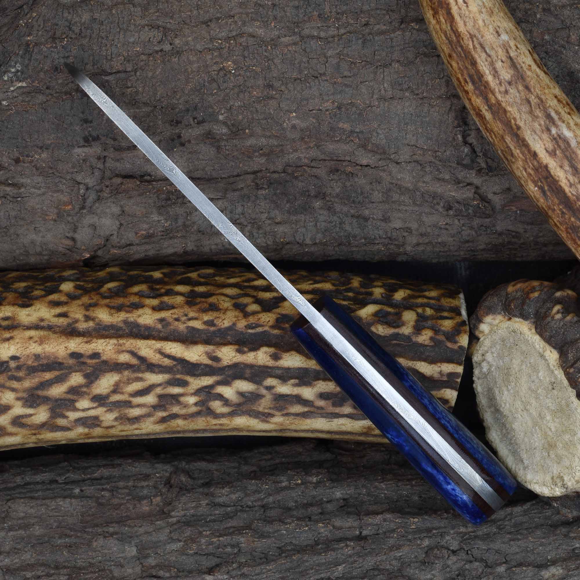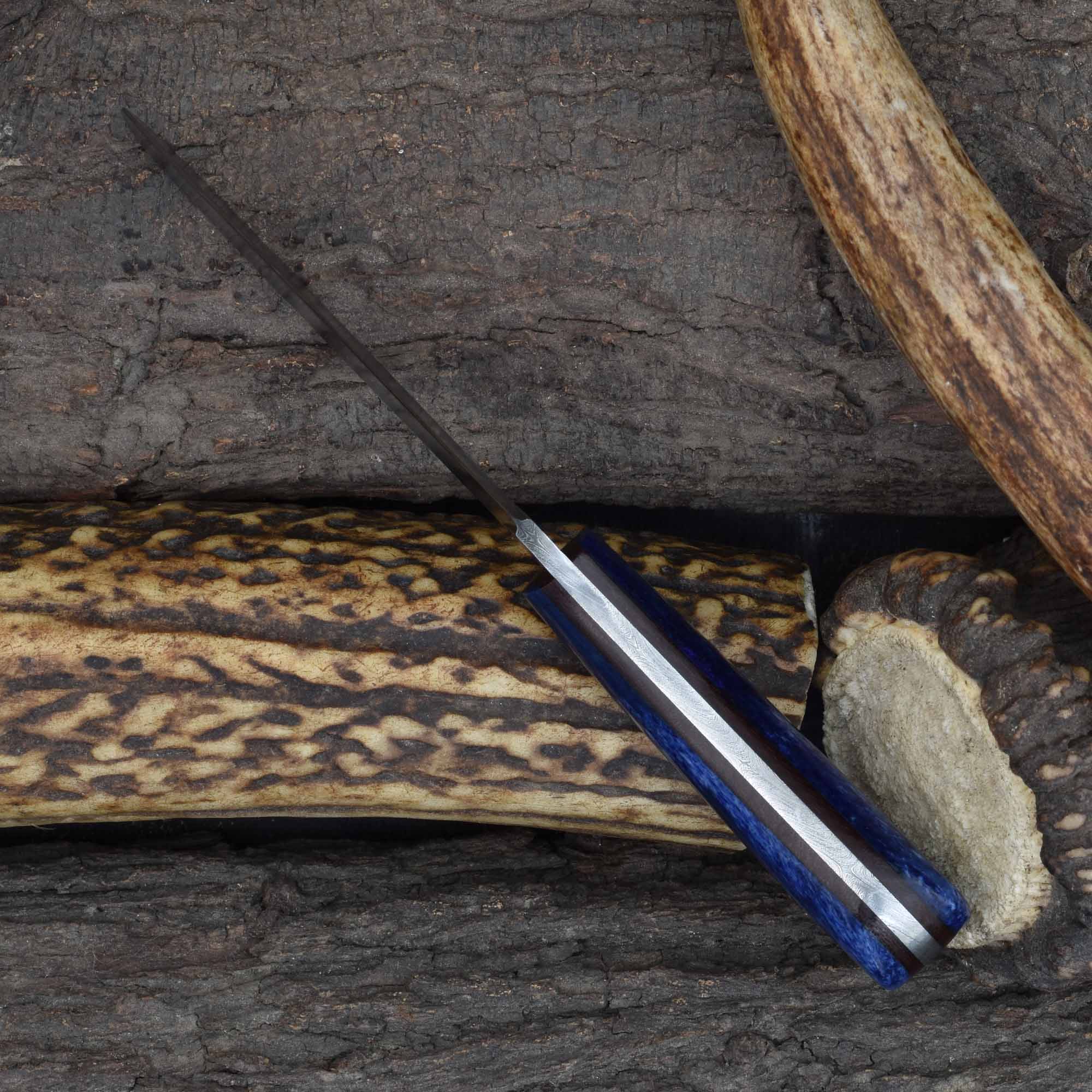 Designed for accuracy and comfort, the Knives Ranch Damascus castration knife with blue dyed cattle bone handle provides superior cutting precision in demanding veterinary and ranching tasks. The vibrant blue dyed cattle bone handle paired with a fiber liner offers an eye-catching look and a secure, ergonomic grip during extended use.