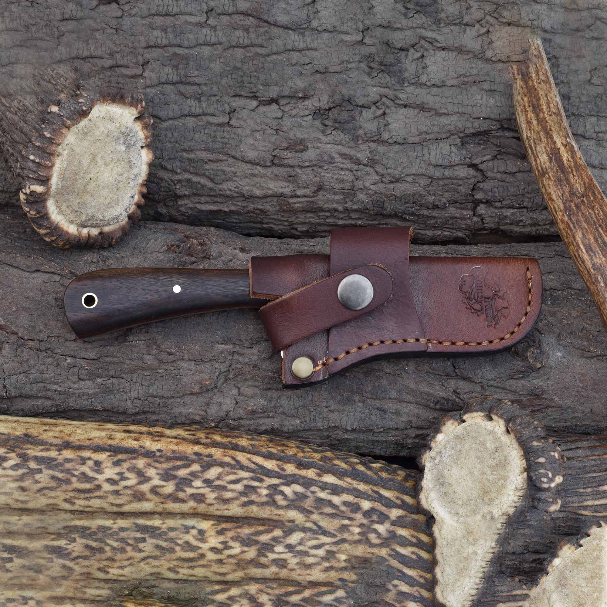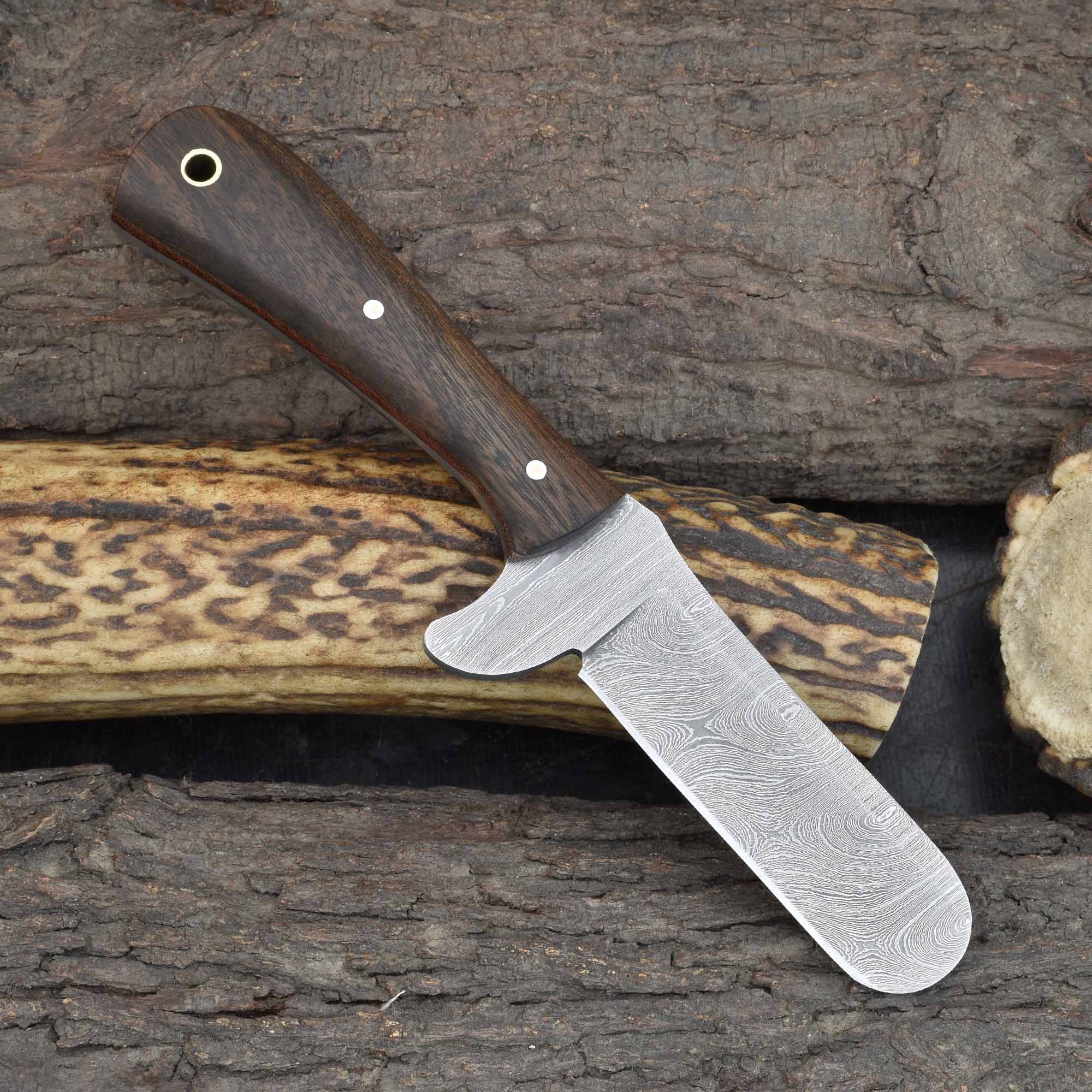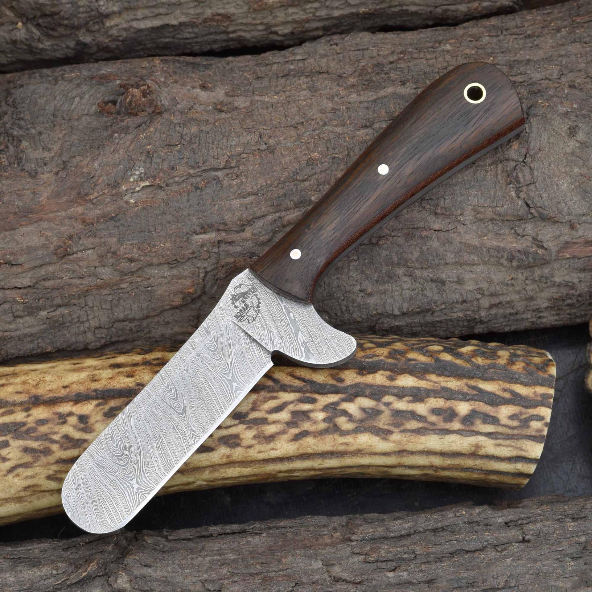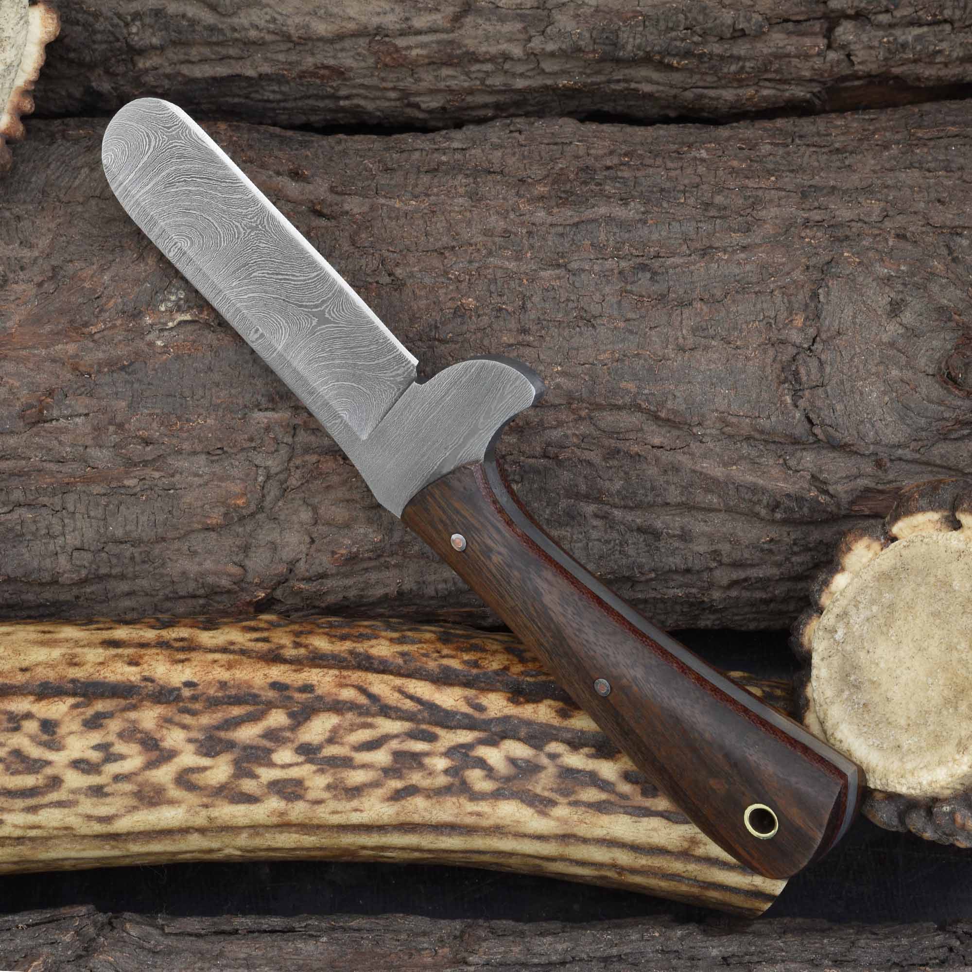 This expertly crafted tool serves as a trusted precision livestock castration blade, an essential artisan Damascus surgical knife for animal care, and a dependable rosewood-handled fixed blade for professional veterinarians.