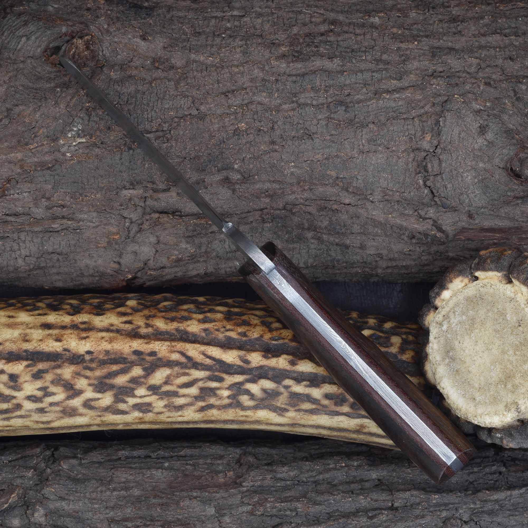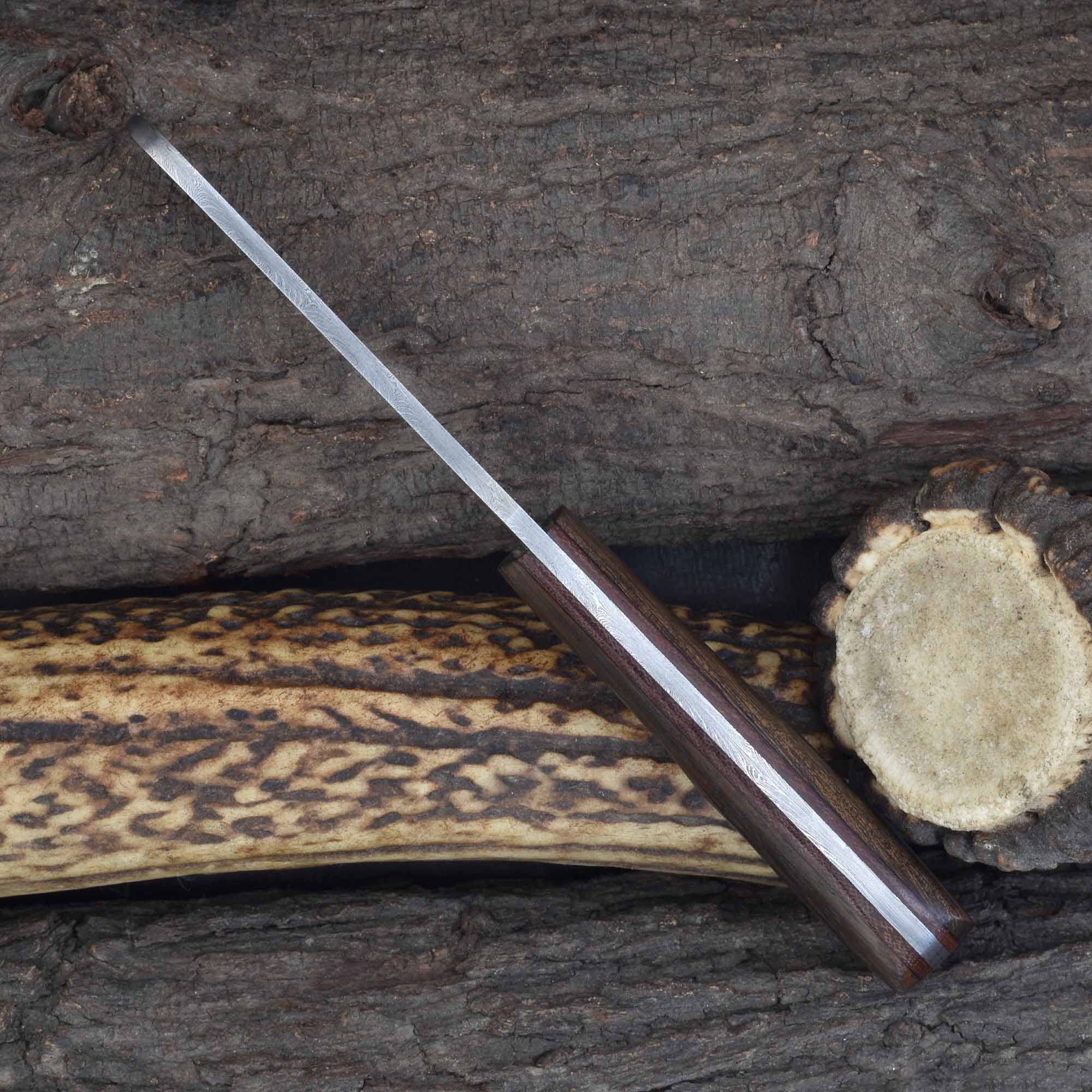 Deliver precision and confidence with the Knives Ranch handcrafted Damascus castration knife with stabilized rosewood grip. Built for meticulous work, this knife features a sharp 2-1/2" cutting edge paired with an ergonomic stabilized rosewood handle enhanced by a fiber liner for superior comfort and control during extended use. The integrated guard adds safety during delicate procedures.