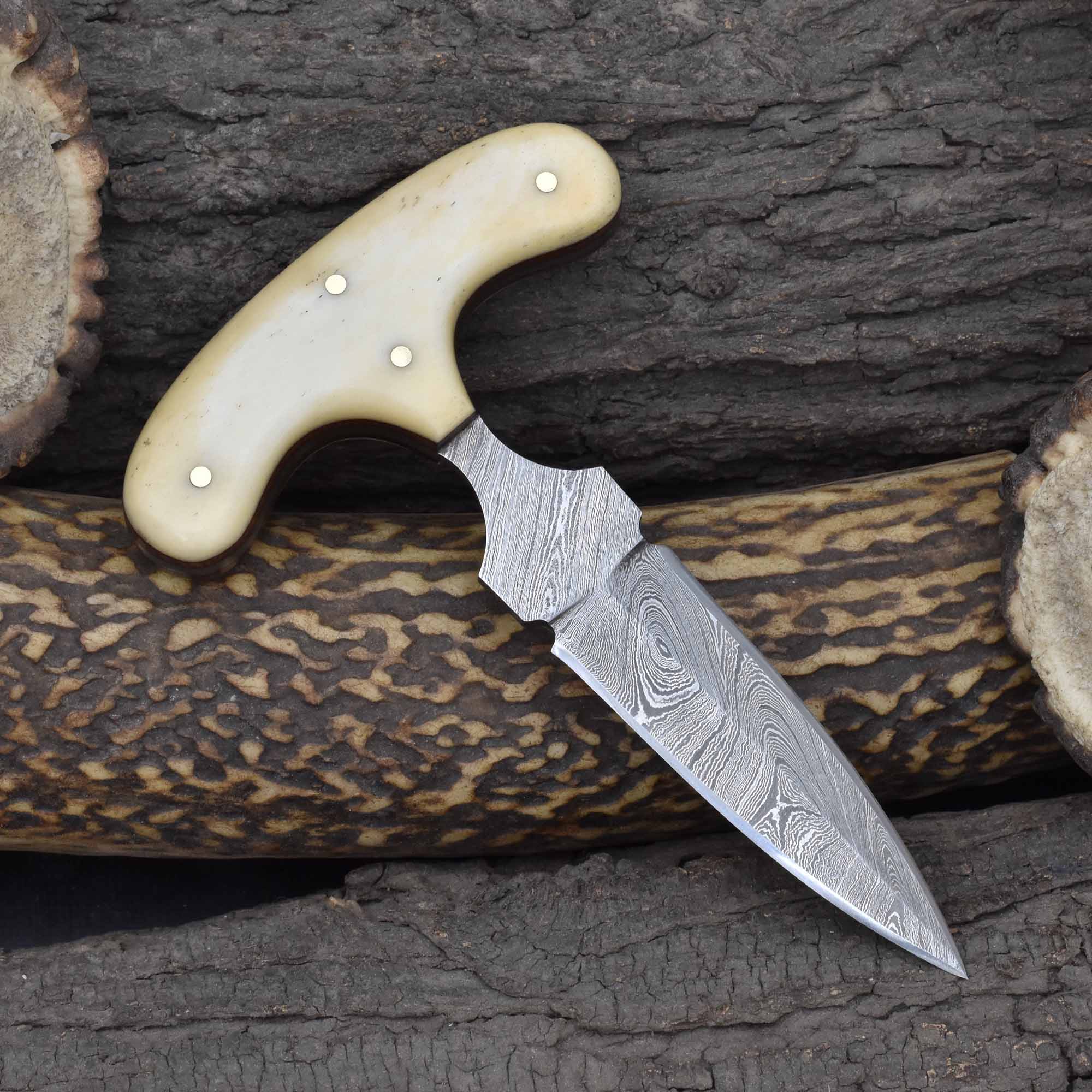 Whether for concealed protection or display, this knife stands out as a reliable Damascus compact defense dagger, a striking fixed blade with a bone handle for collectors, and a practical double-edged EDC push knife.