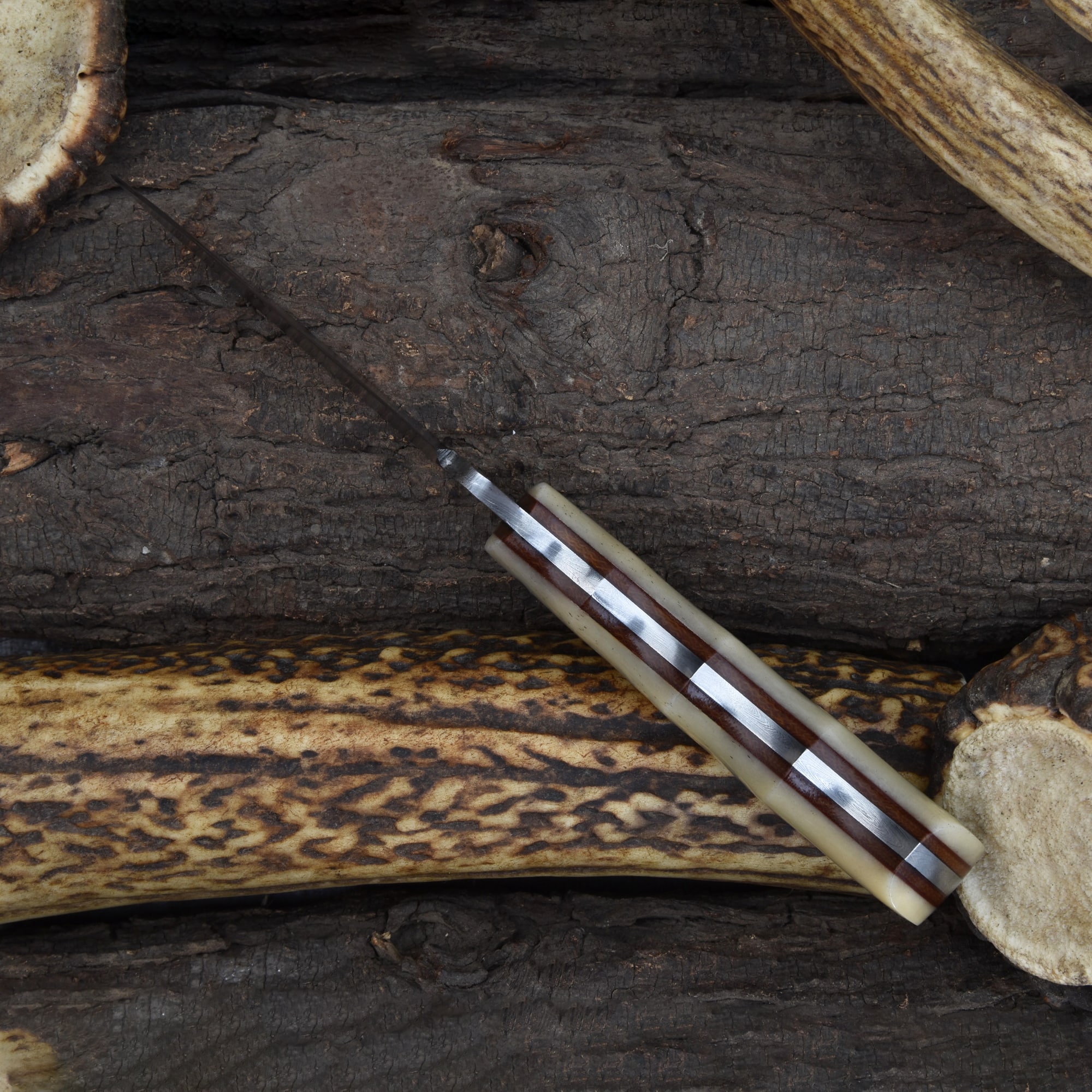 Combining heritage style with dependable performance, the Knives Ranch traditional Damascus hunting knife with cattle bone handle is built for hunters who value both craftsmanship and function. The smooth bone handle with a fiber liner offers a natural, secure grip ideal for precise work in the field.