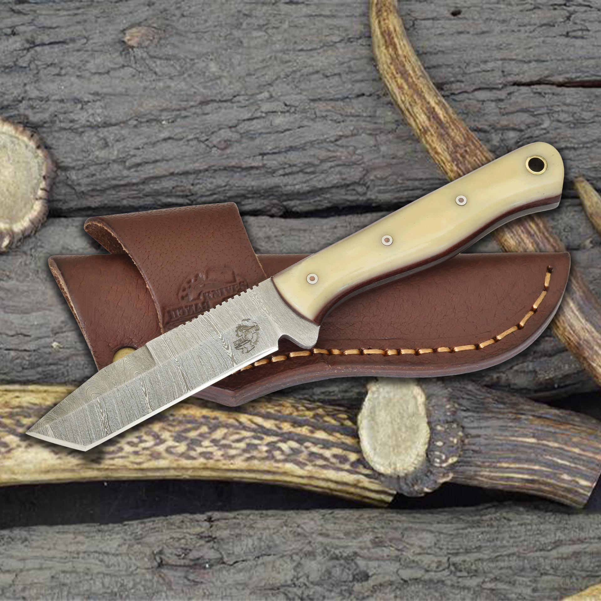 This everyday essential performs effortlessly as a compact fixed blade knife for utility carry, a tanto-style Damascus knife for work and travel, and a durable cow bone EDC knife with tactical edge.