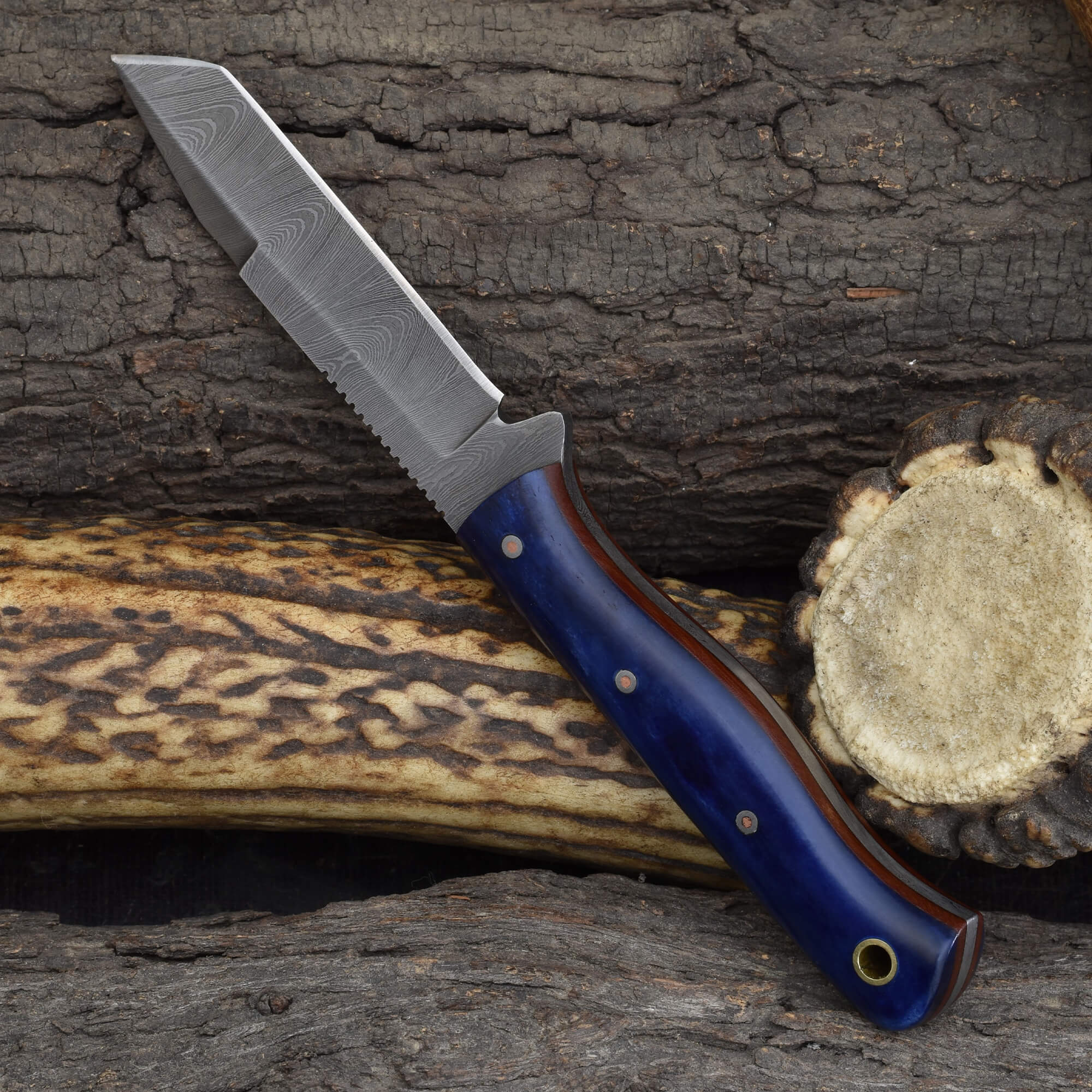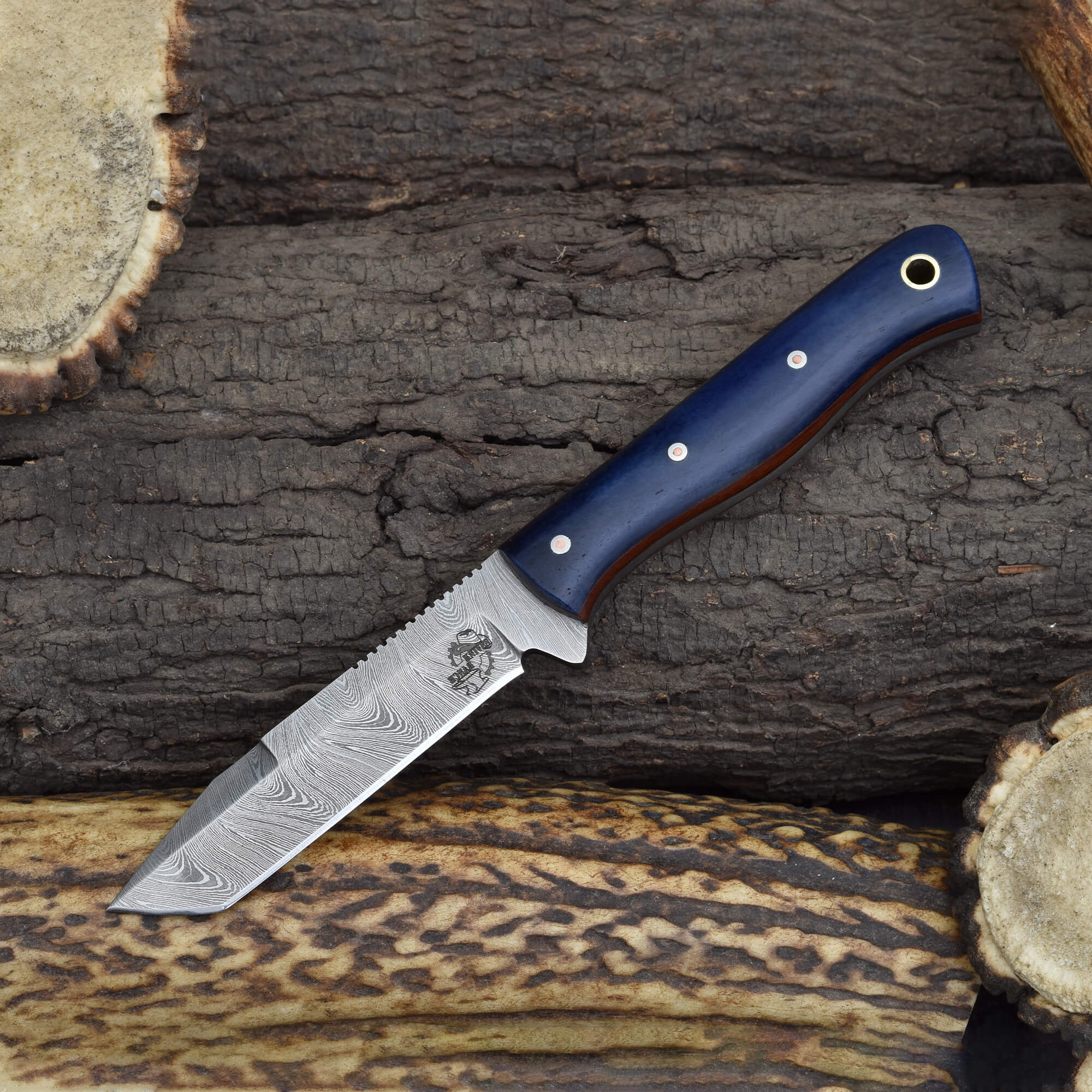 Combining style and precision, the Knives Ranch Damascus EDC tanto knife with dyed sheep bone handle is designed for everyday tasks requiring sharpness and reliability. Its 3-1/4" tanto blade excels at piercing and cutting, while the dyed sheep bone handle with fiber liner ensures comfort and a secure grip during use.