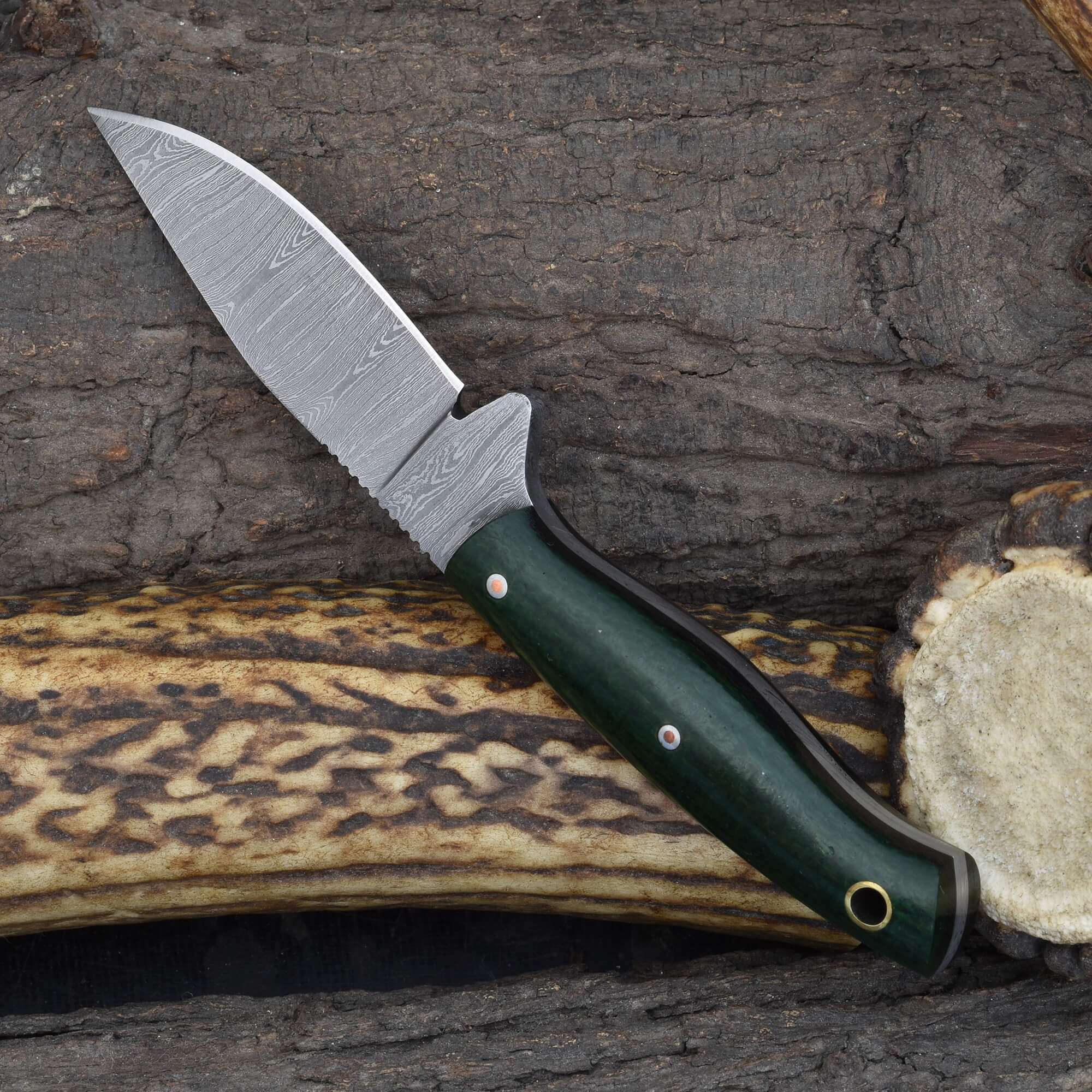 The Knives Ranch Damascus EDC knife with green burlap Micarta handle delivers precision cutting with its 2-5/8" Damascus steel edge, tailored for everyday carry. The kale green burlap Micarta handle with fiber liner offers a textured, secure grip, making it a reliable choice for daily tasks in both urban and outdoor settings.