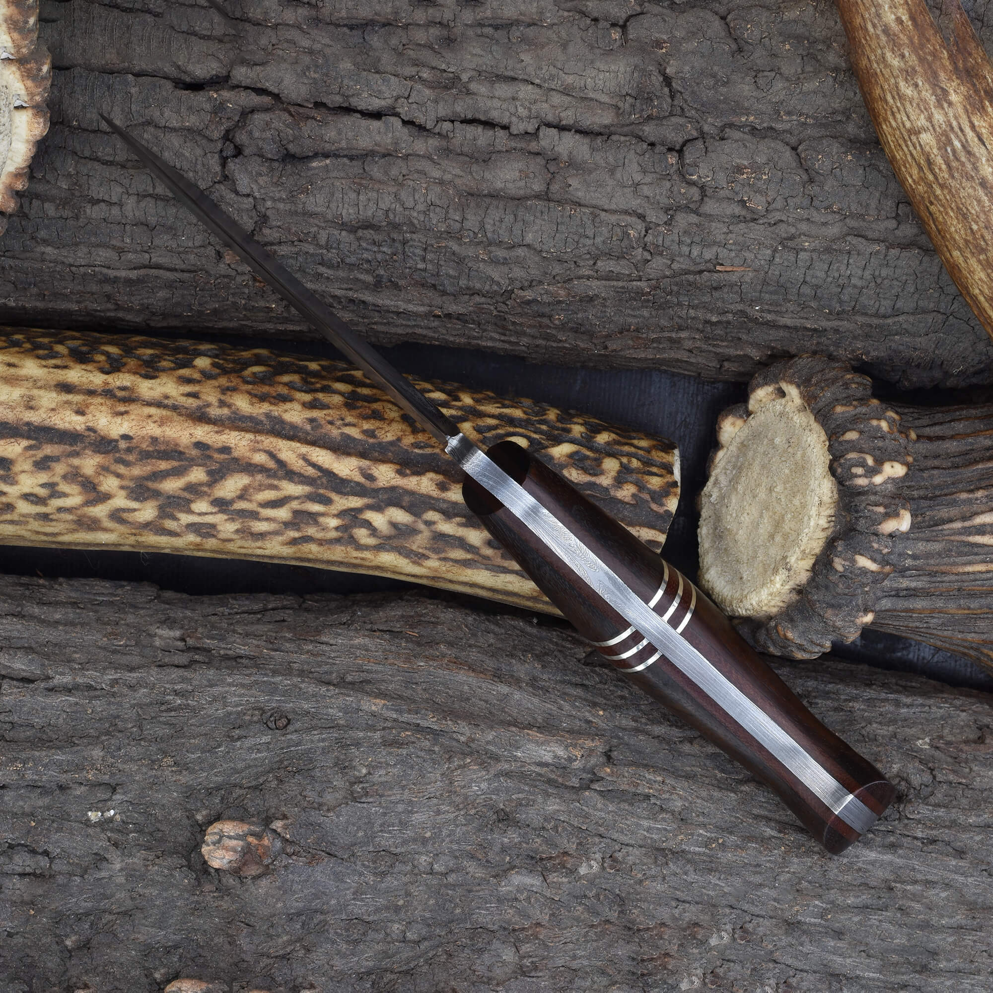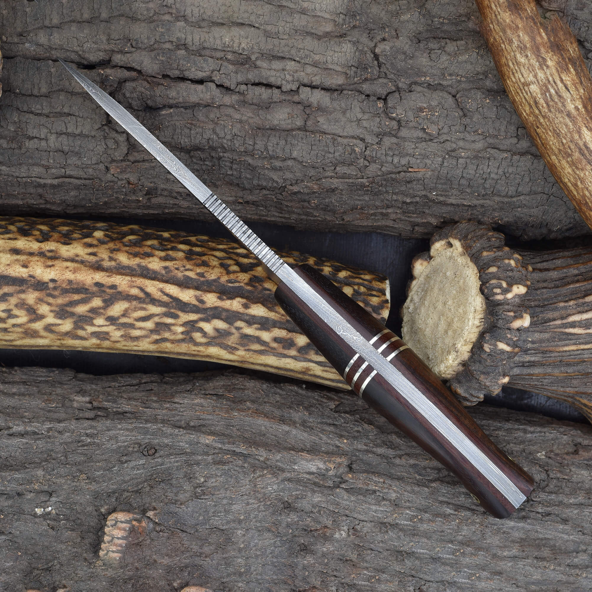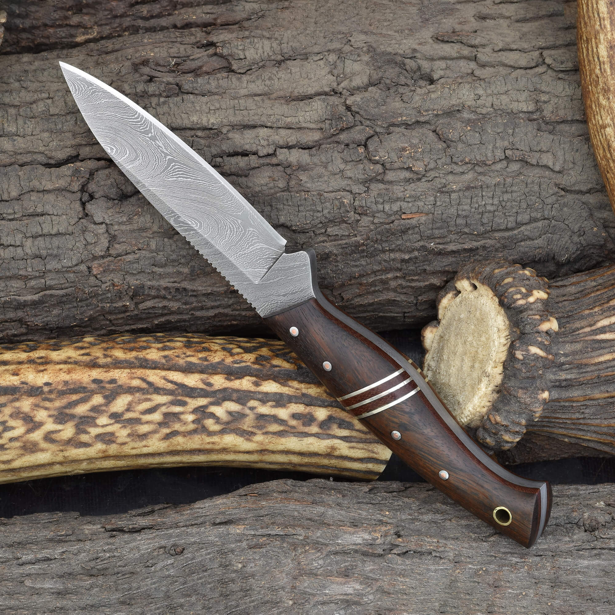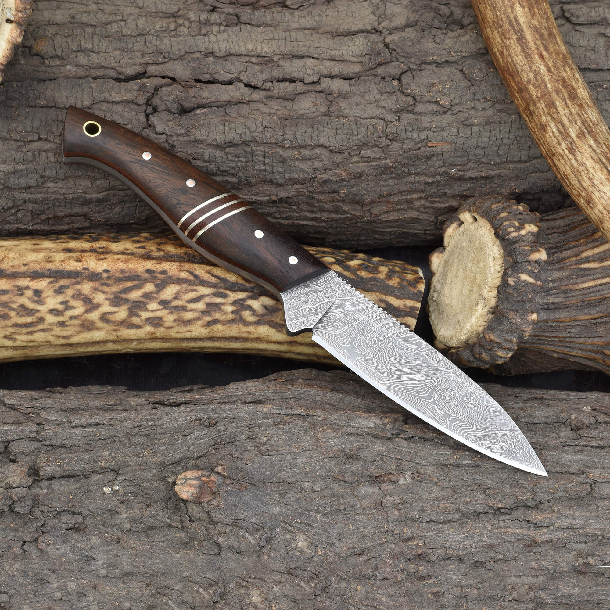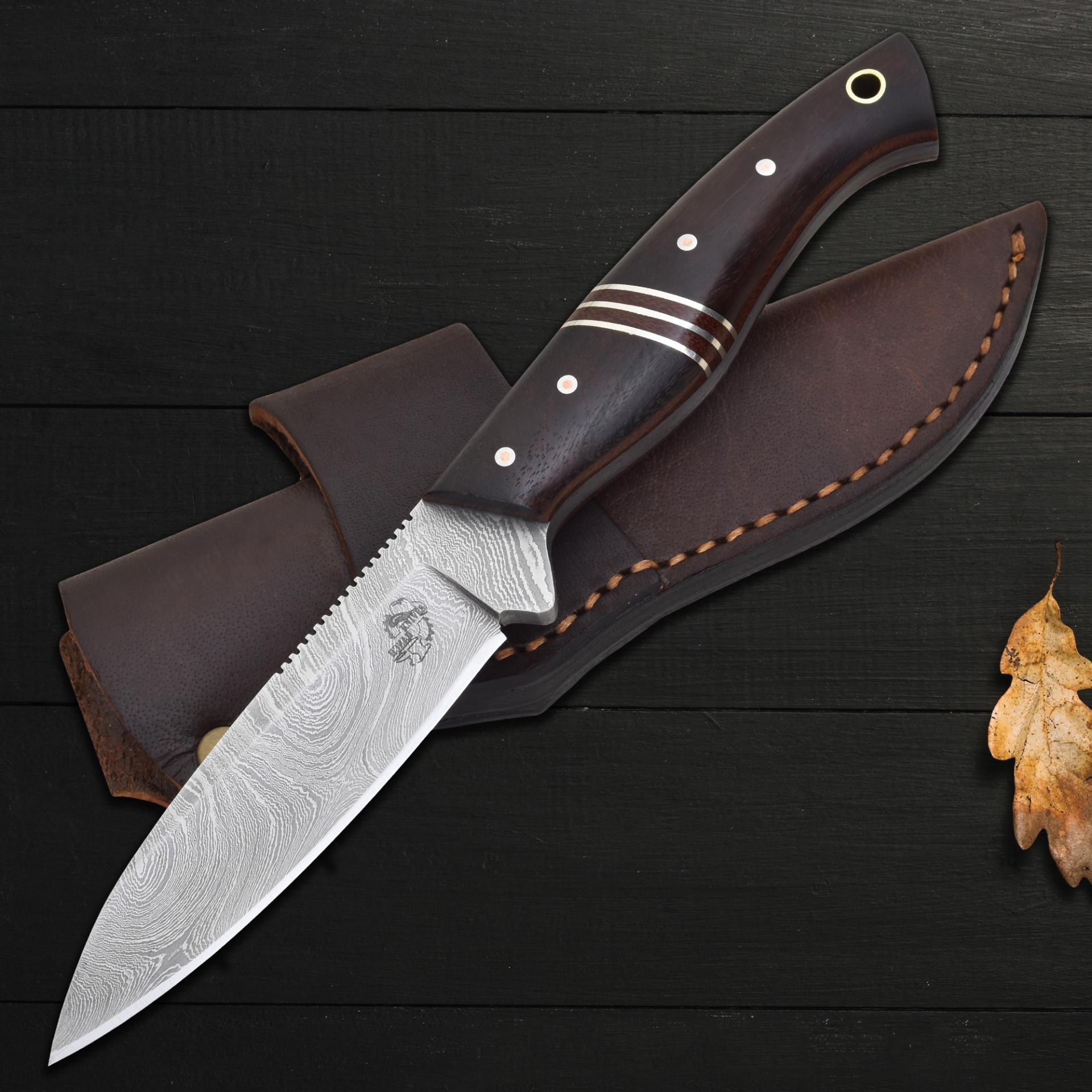 This knife is a dependable fixed blade Damascus hunting knife, a refined rosewood-accented blade for field use, and a durable precision Damascus steel outdoor knife.