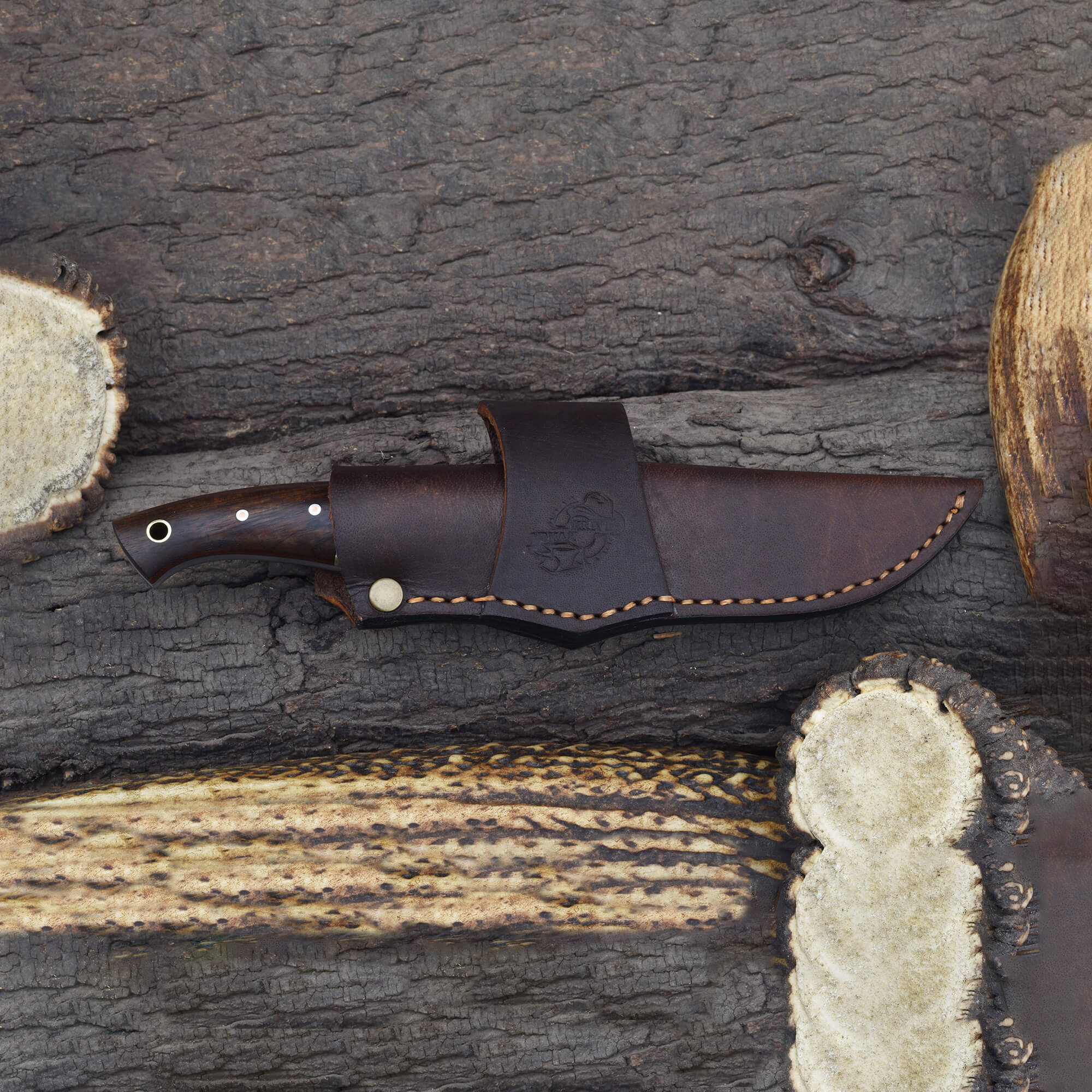 The Knives Ranch Damascus hunting knife with Rosewood accents offers exceptional precision with a 3-3/4" cutting edge forged from high-quality Knives Ranch Damascus Steel (5160/4340). Its robust design suits a variety of outdoor and hunting tasks, while the stabilized Rosewood handle with nickel silver and brown fiber inserts provides excellent grip and style.
