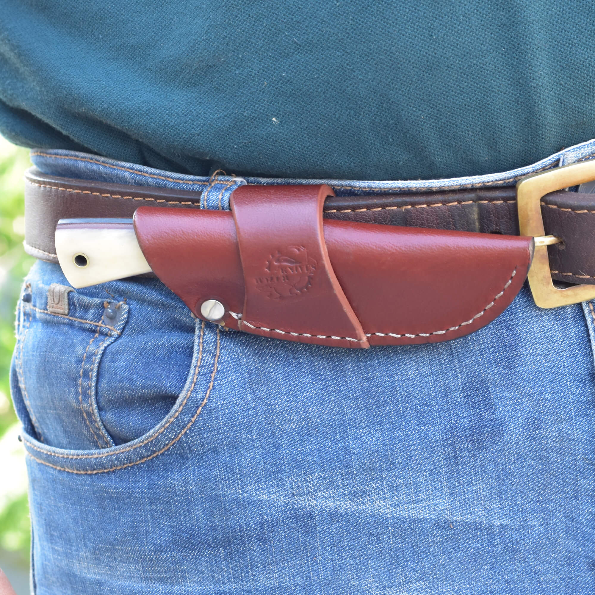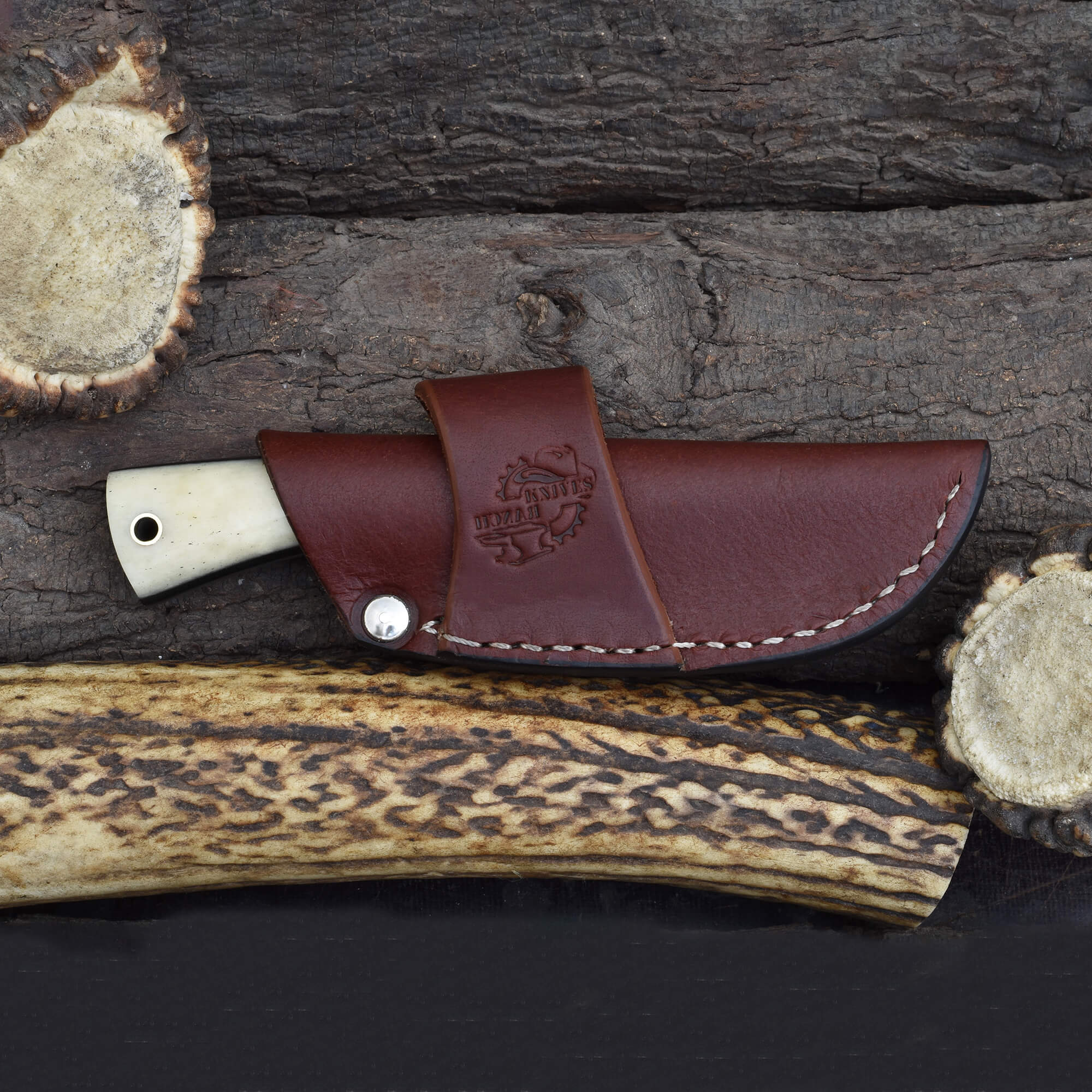 Compact, reliable, and designed for outdoor tasks, the Knives Ranch Damascus Hunting Knife features a 3" Damascus steel blade with excellent sharpness and edge retention. With no bolster, the bone handle with fiber liner offers a secure and comfortable grip, making it ideal for hunting and fieldwork. The knife comes with a Vegetable Tanned Leather horizontal crossdraw sheath for easy access and convenient carry in any situation.