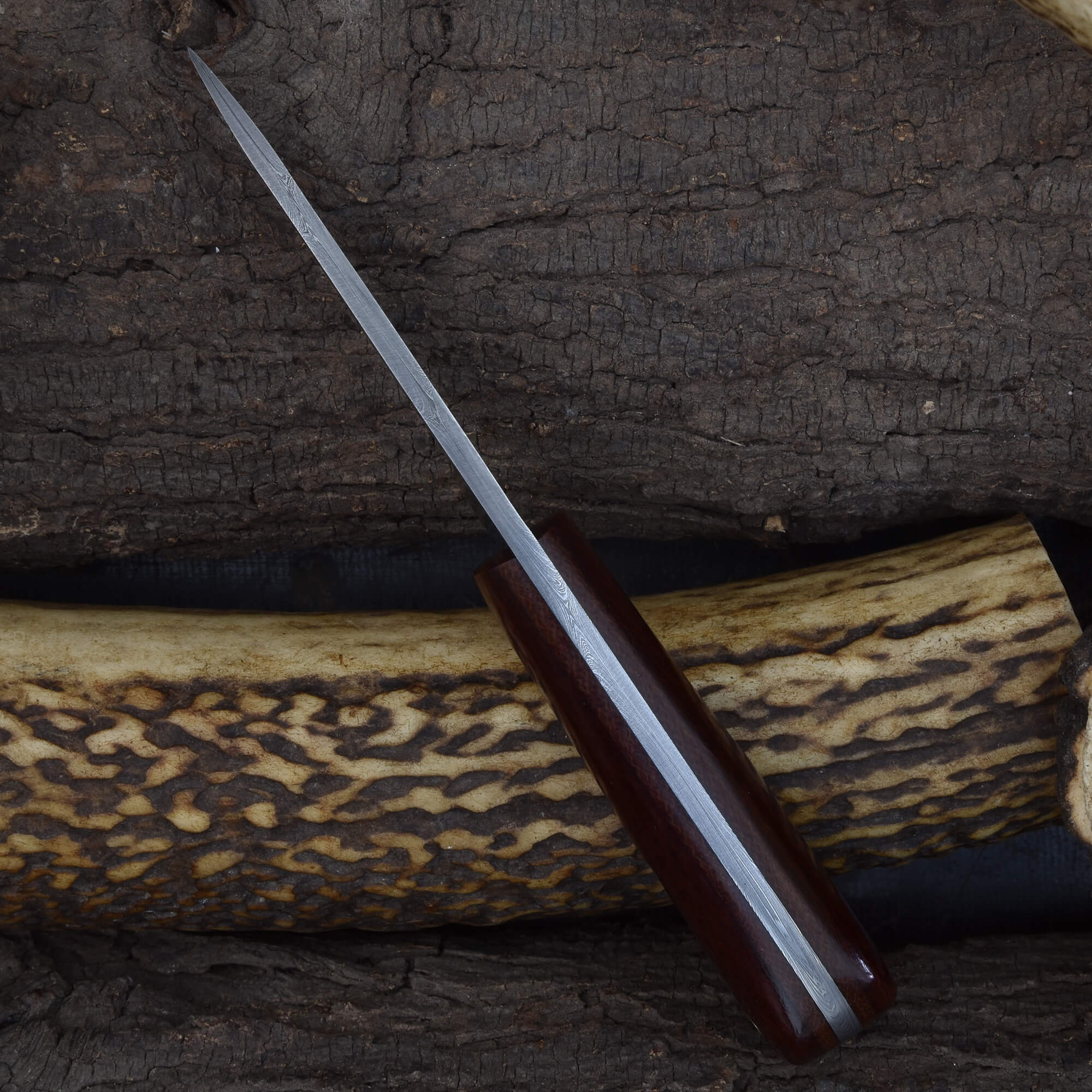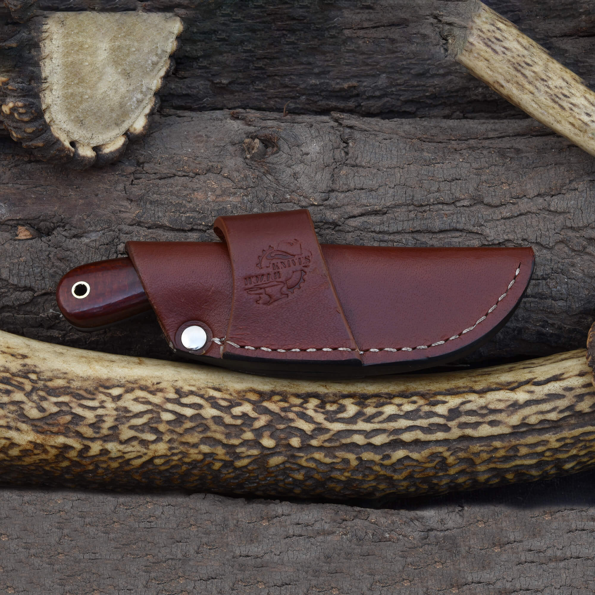 Compact, versatile, and built for everyday carry, the Knives Ranch Damascus EDC Hunting Knife delivers performance in a streamlined design. The 2-3/4" Damascus steel blade ensures excellent sharpness, edge retention, and durability for hunting and utility tasks. With no bolster for a lightweight feel, the knife features a striking scarlet dyed burlap micarta handle with a G10 fiber liner, offering both comfort and durability in the hand. Paired with a vegetable-tanned leather horizontal crossdraw sheath, this knife is quick to access and designed for carry convenience.