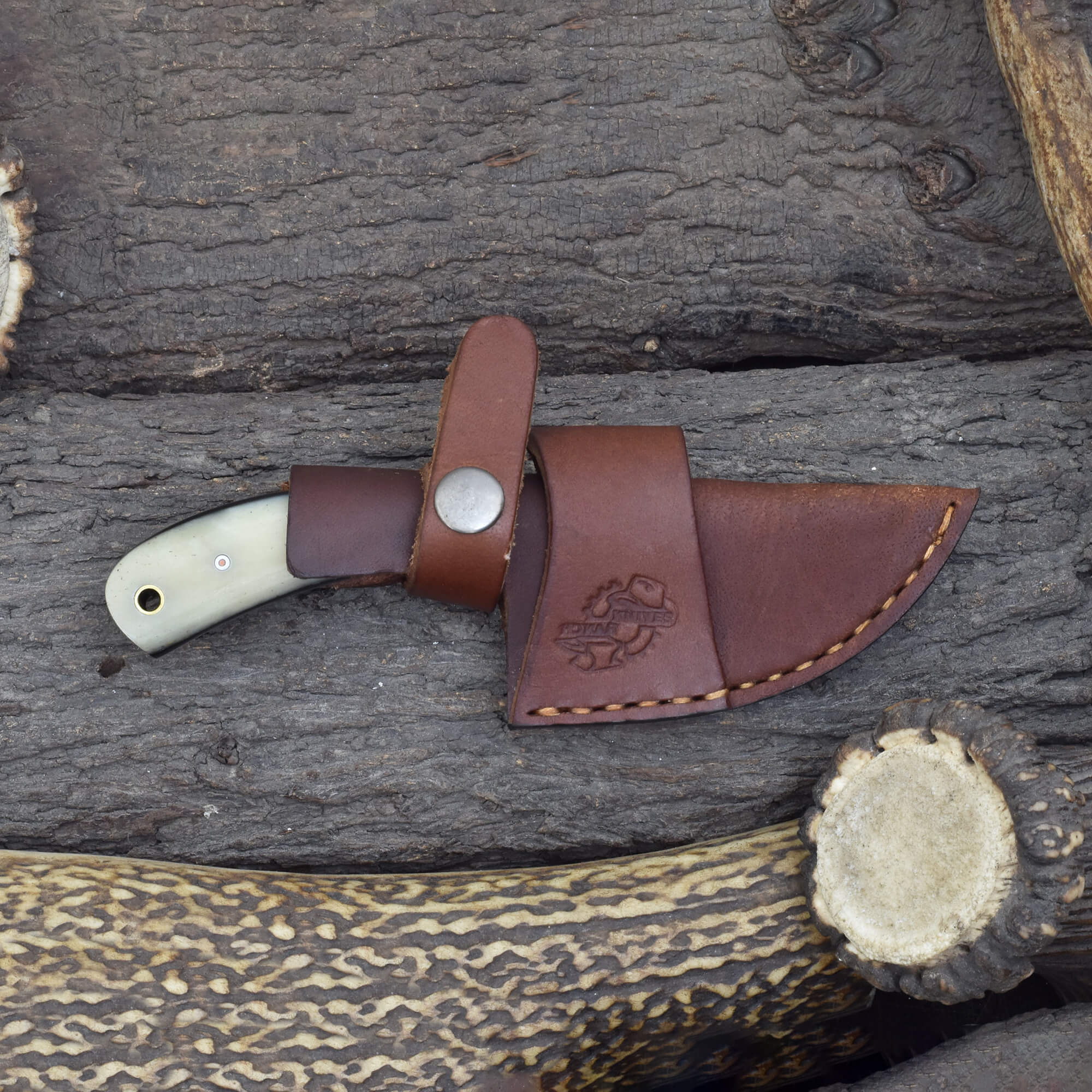 Precision, durability, and elegance combine in the Knives Ranch Damascus Skinning Knife. The 3-1/4" Damascus steel blade delivers excellent sharpness and edge retention, perfect for skinning and field tasks. With no bolster, the cattle bone handle with fiber liner provides a comfortable, secure grip while showcasing natural character. Complete with a vegetable-tanned leather dual-carry sheath (vertical and horizontal loops), this knife is ready for versatile use in the field.