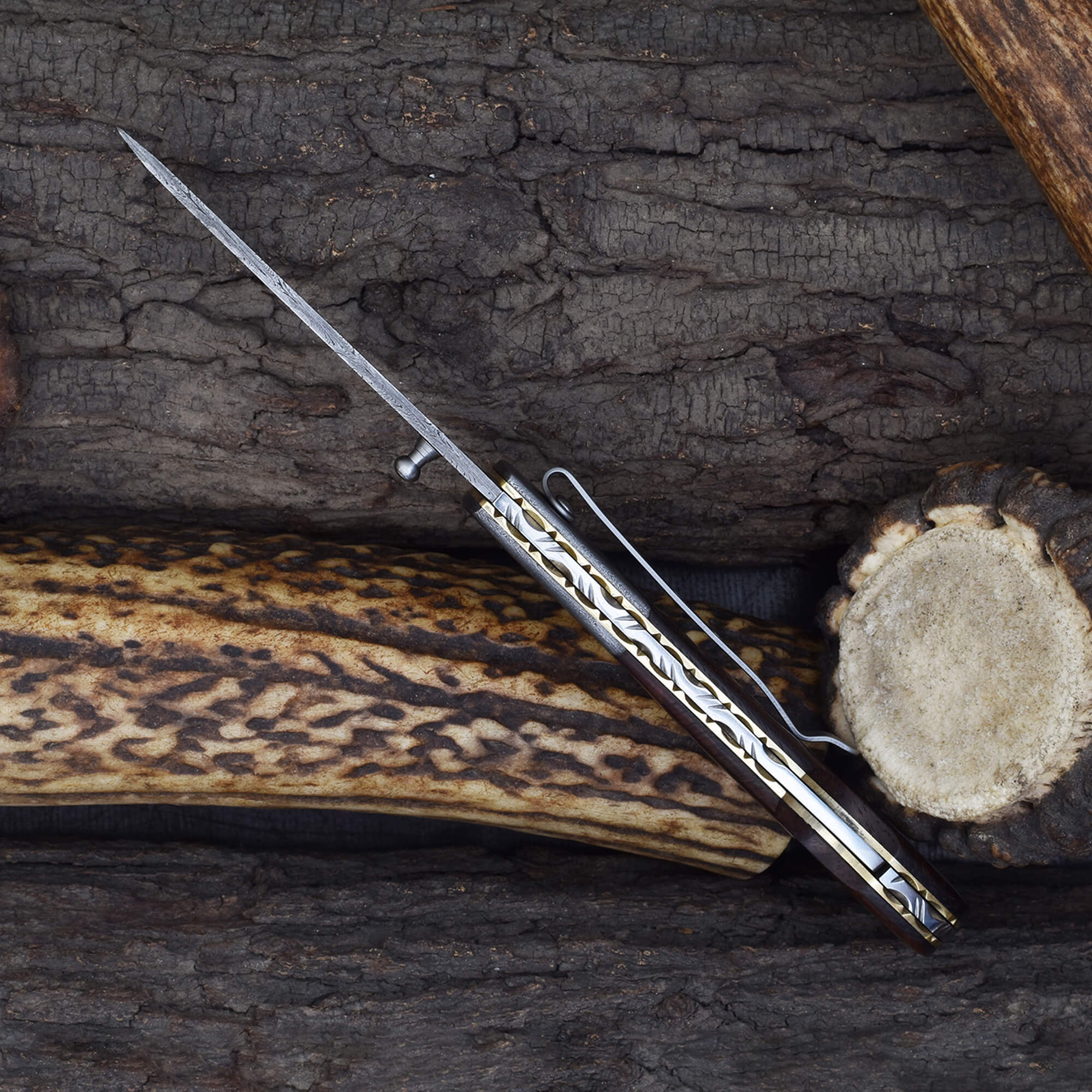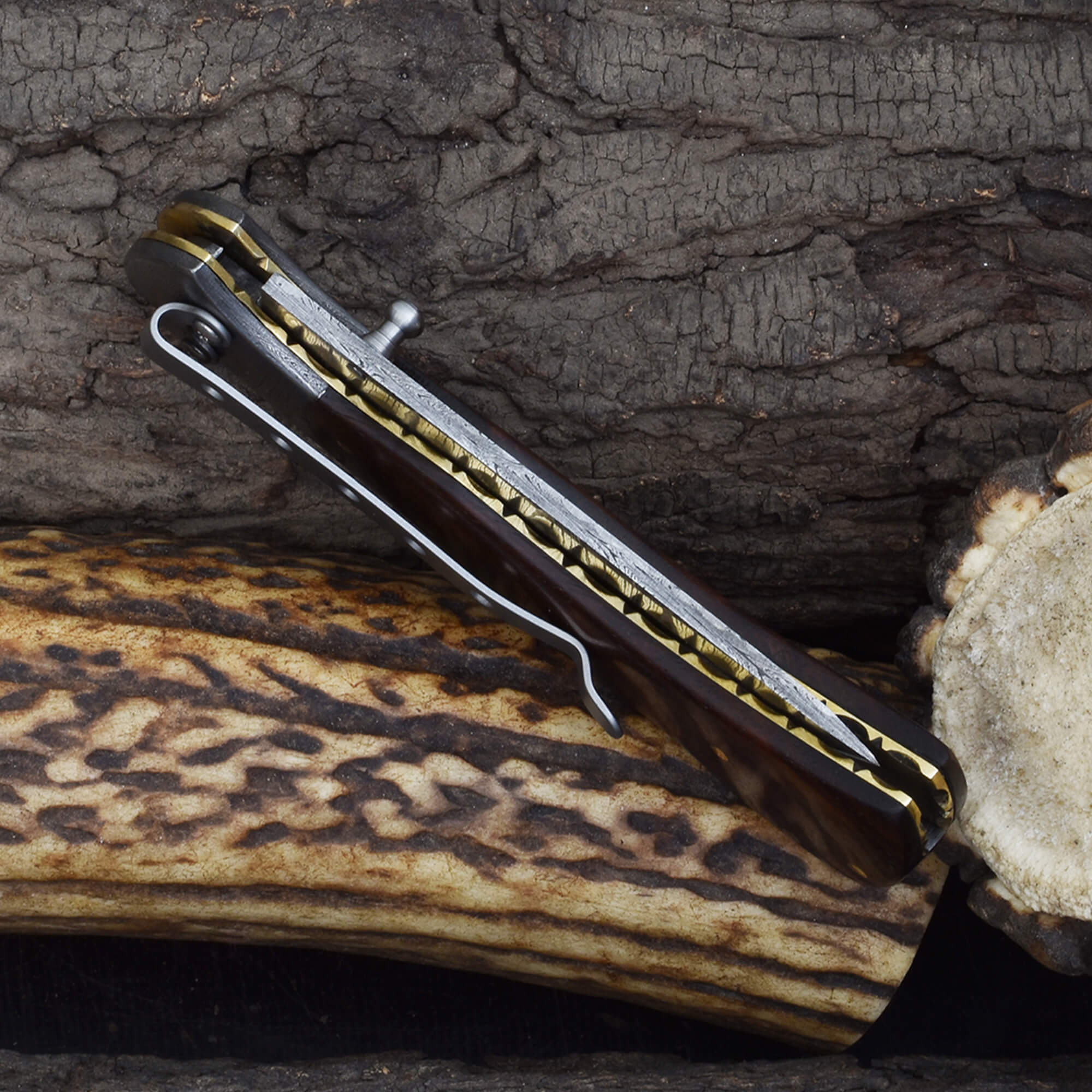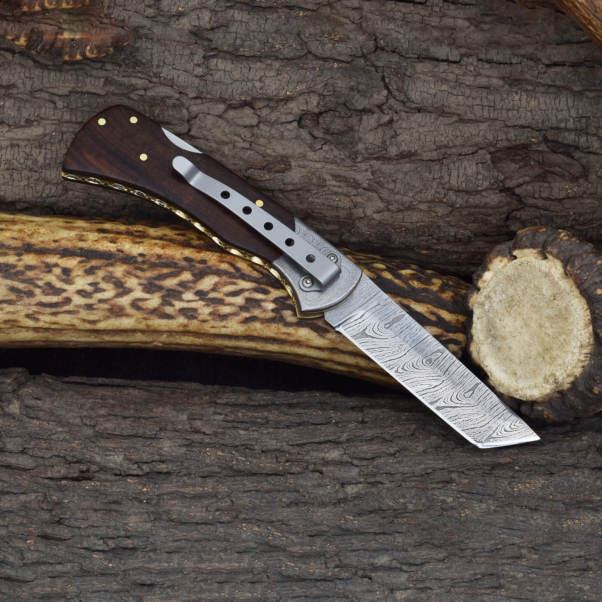 Ideal for everyday use, this knife is a reliable Damascus pocket knife with rosewood handle, a practical folding blade for daily carry, and a sturdy compact knife for outdoor and tactical tasks.