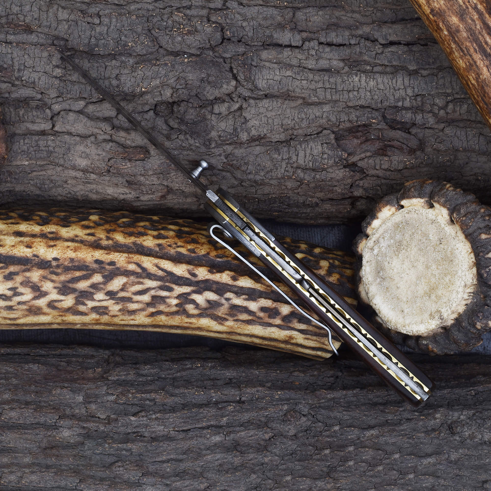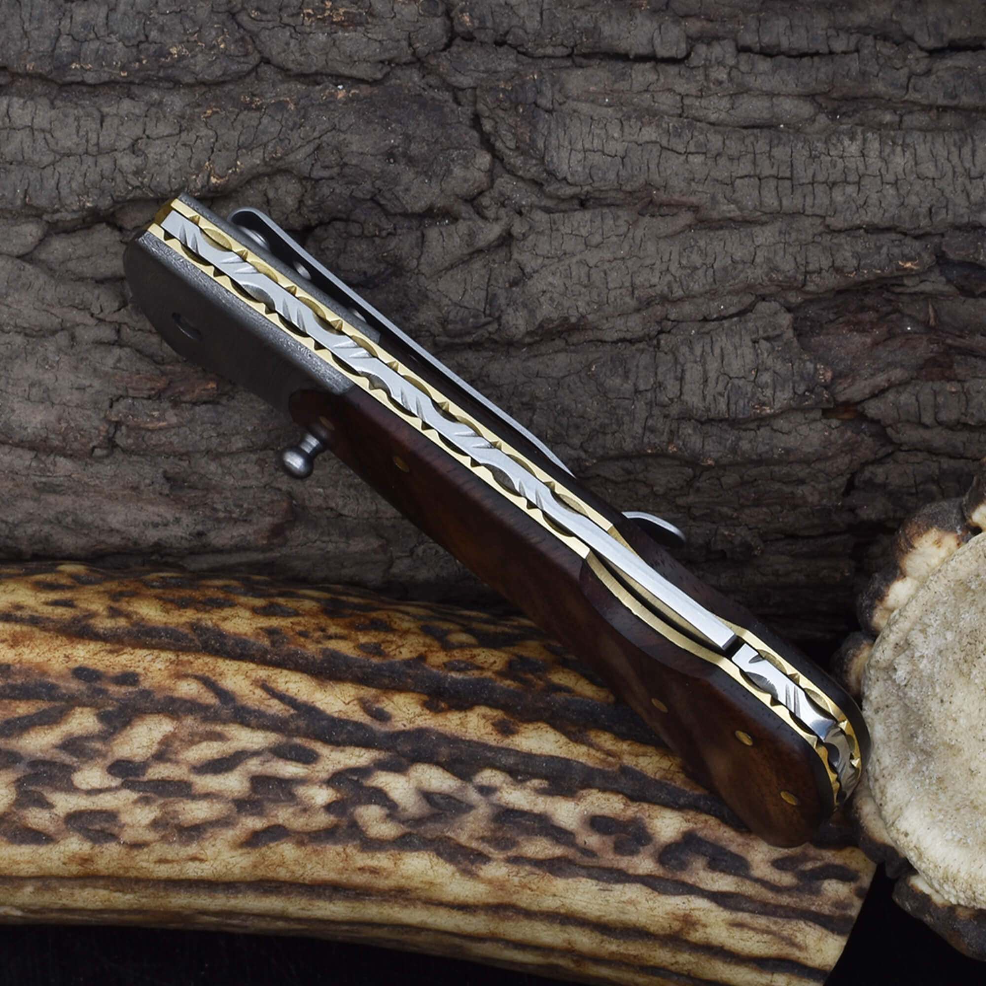 The Knives Ranch Damascus folding pocket knife with rosewood grip showcases expert craftsmanship with a 3" Damascus steel blade, designed for exceptional durability and sharpness. The Damascus steel bolster provides strength and balance, while the stabilized Rosewood handle ensures a comfortable and secure grip.