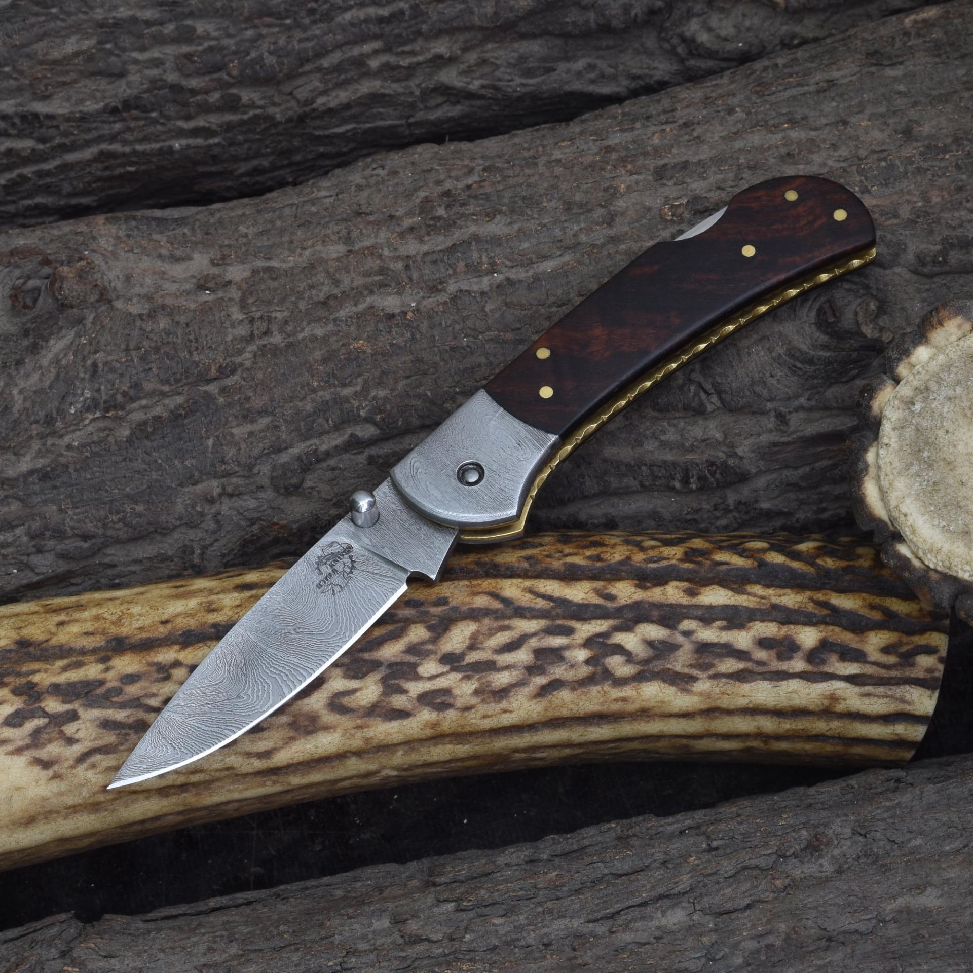 This knife is a refined Damascus pocket knife with rosewood handle, an efficient folding blade for everyday use, and a reliable compact knife suited for outdoor and tactical needs.