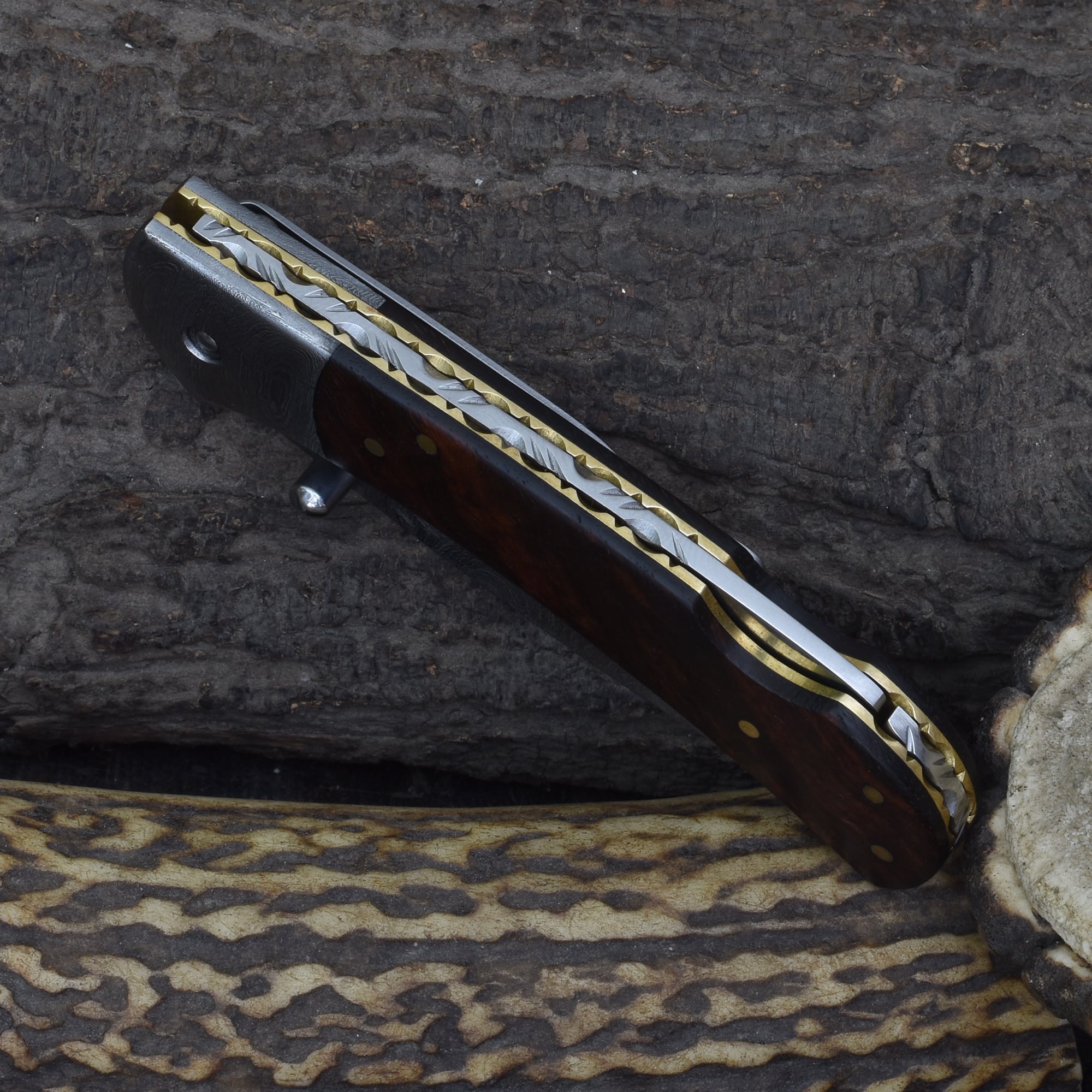 The Knives Ranch Damascus folding pocket knife with rosewood handle offers precision and durability in a compact design. Its 3" Damascus steel blade features exceptional sharpness and resilience, complemented by a Damascus steel bolster for enhanced strength. The stabilized Rosewood handle provides a comfortable and elegant grip.
