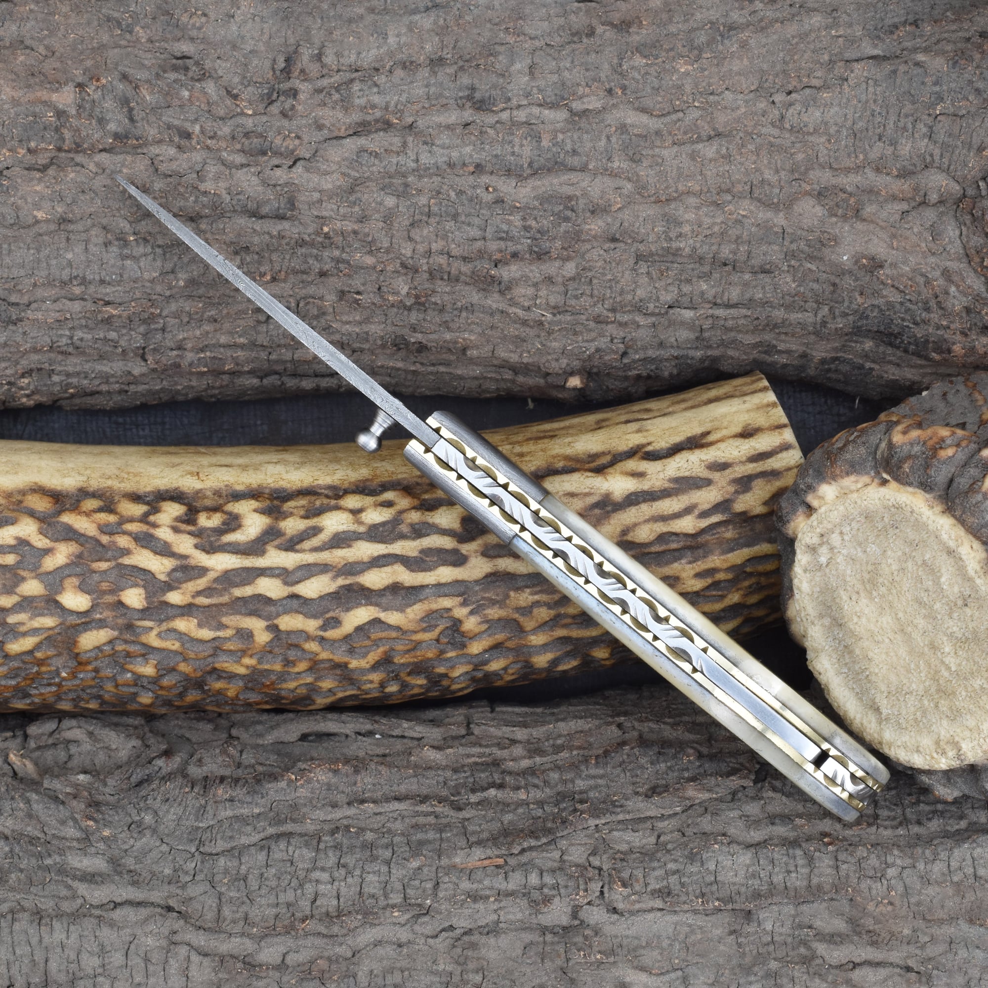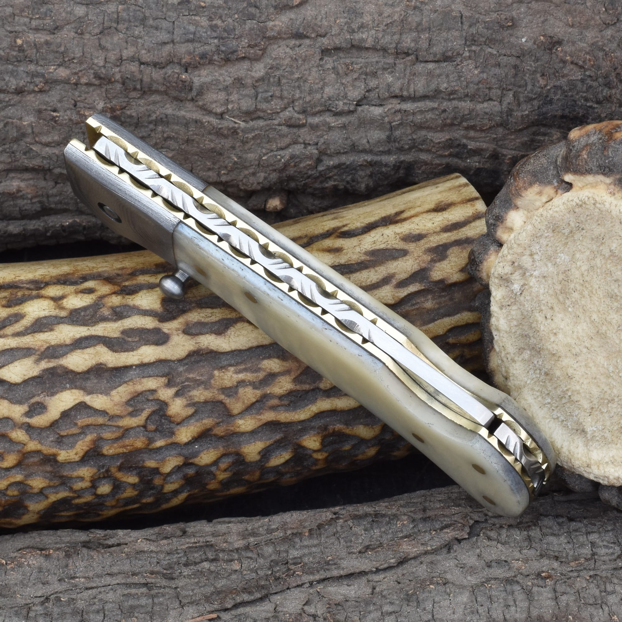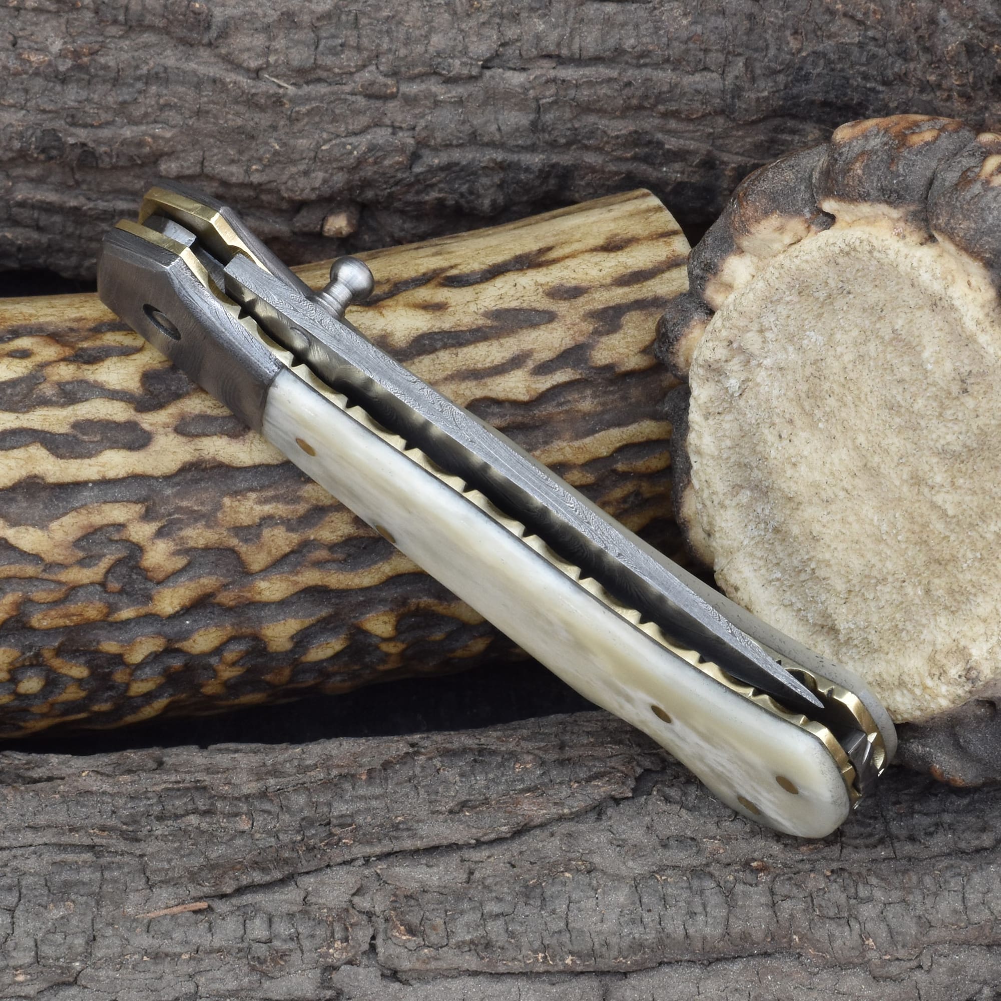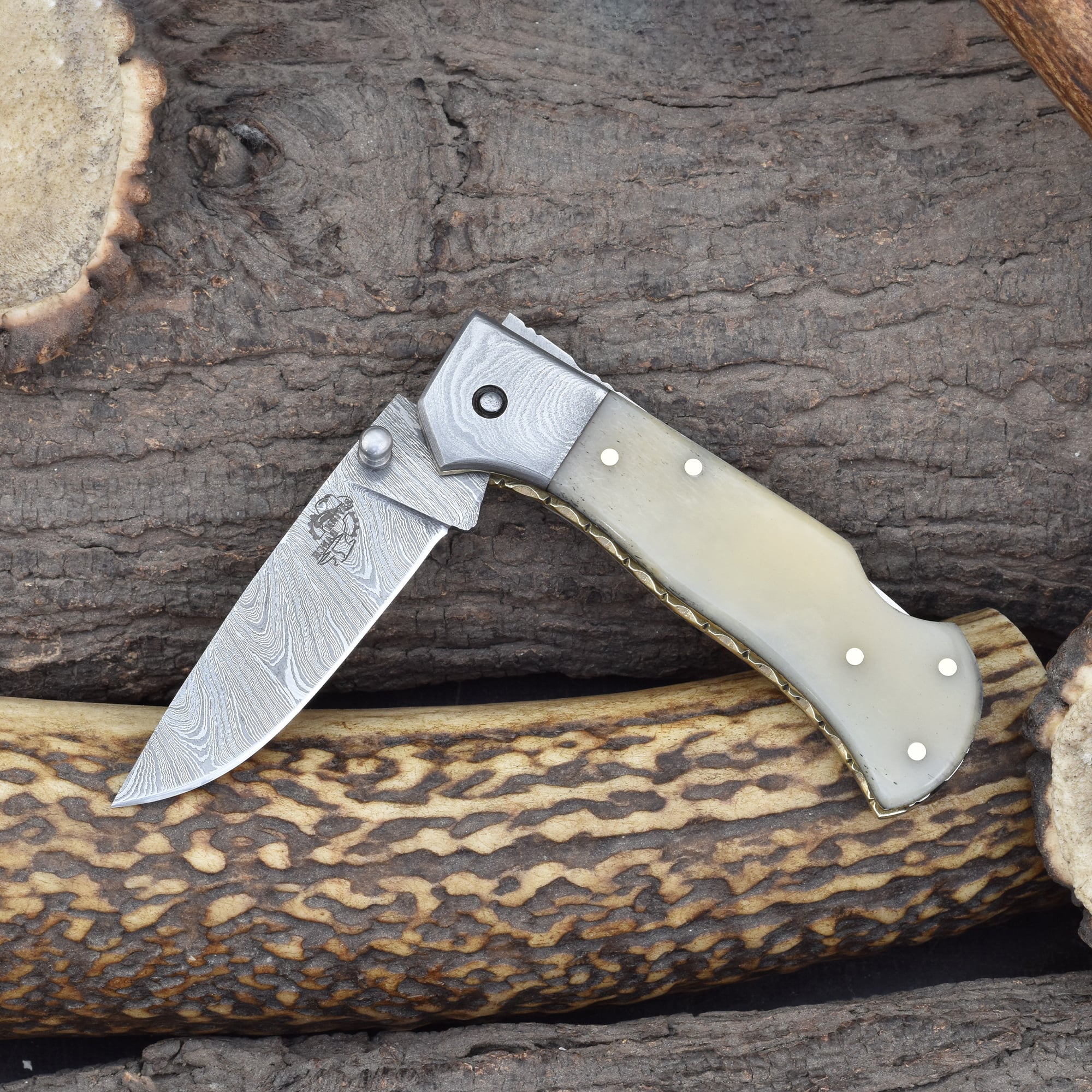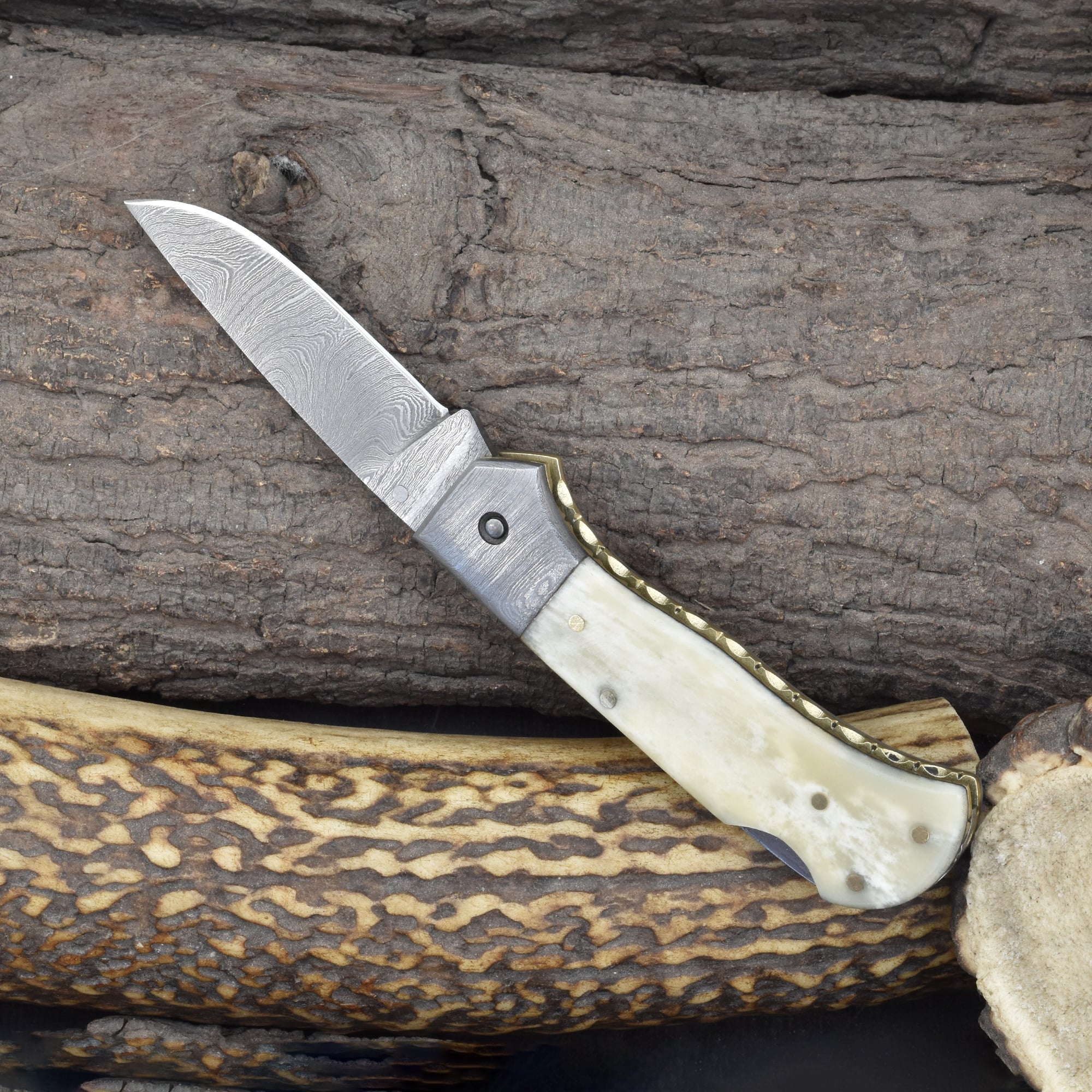 Knives Ranch Folding EDC Knife with Bone Handle and Damascus Steel Blade