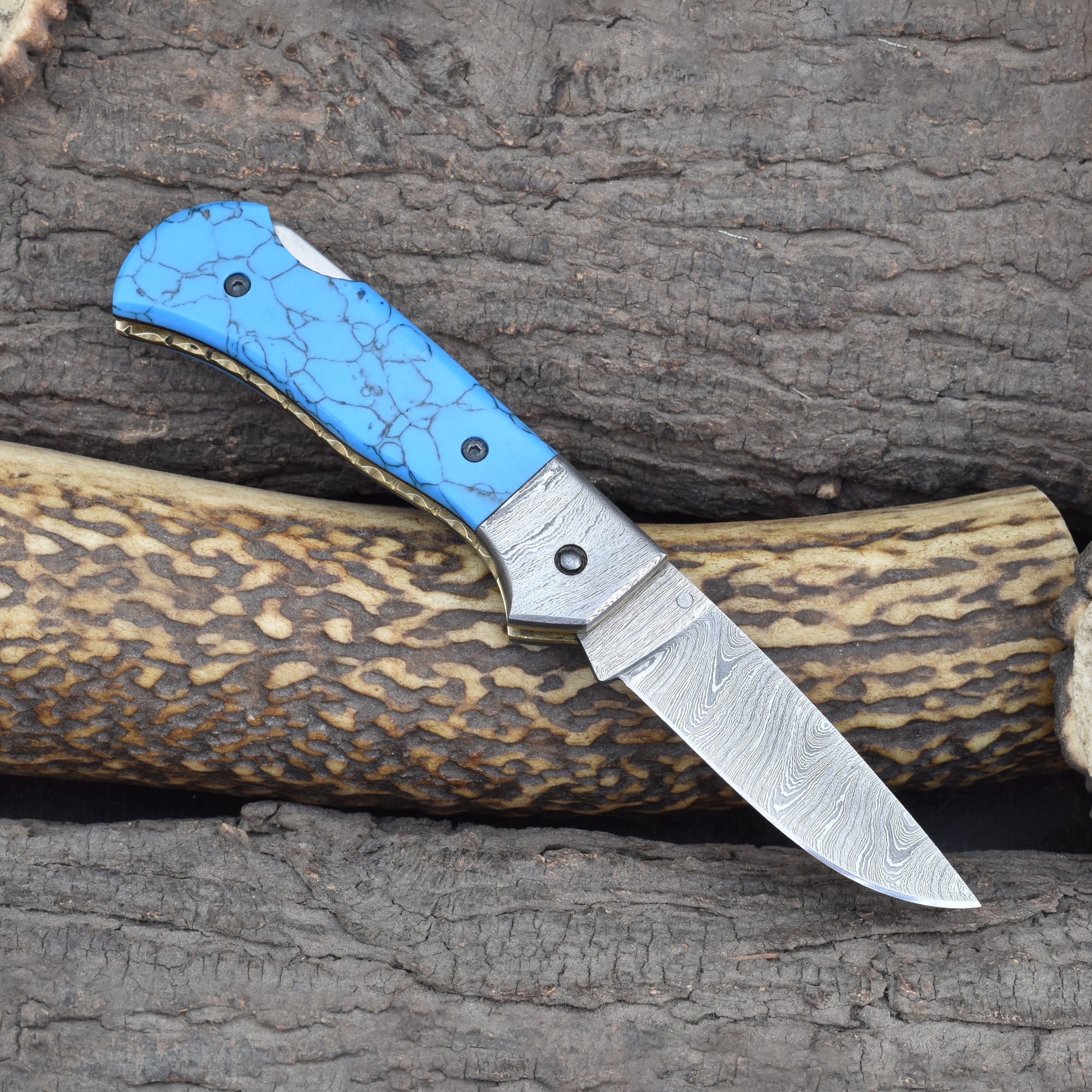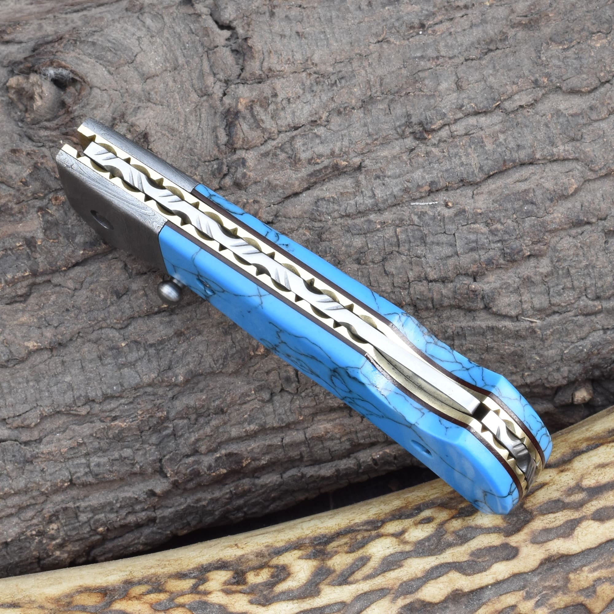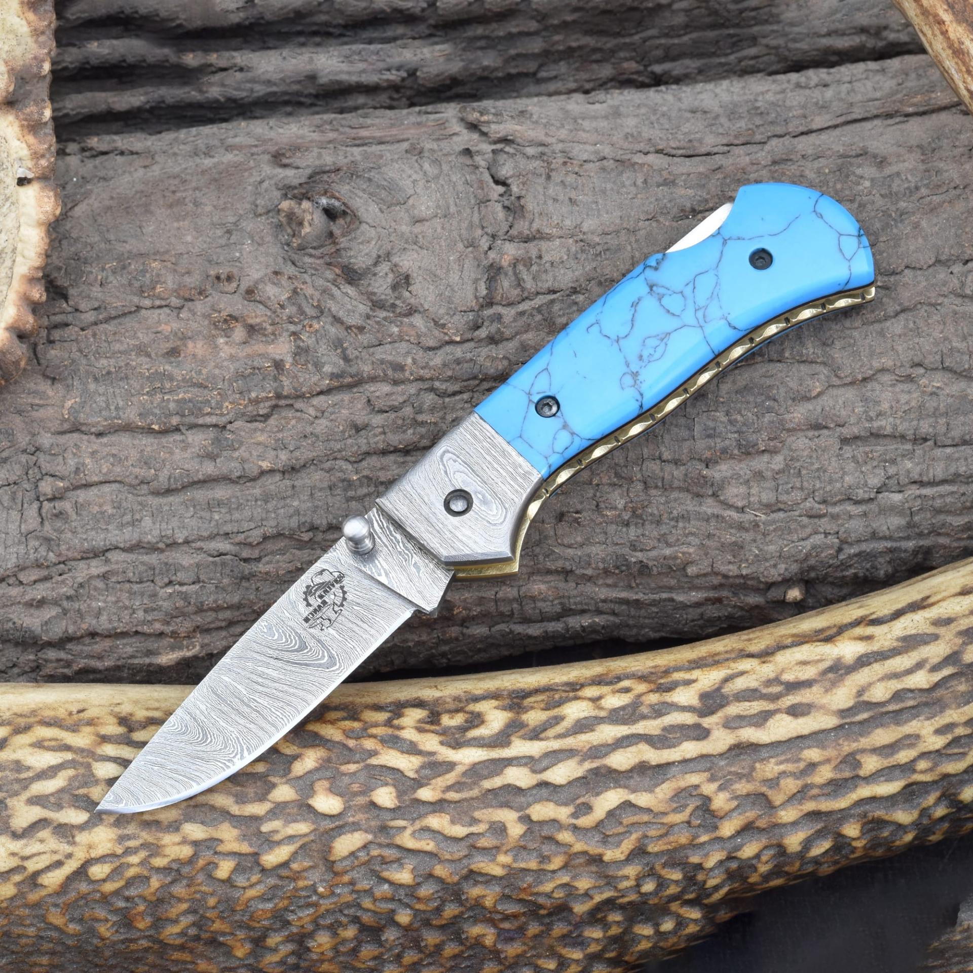 Knives Ranch Folding EDC Knife with Turquoise Composite Handle and Damascus Steel Blade