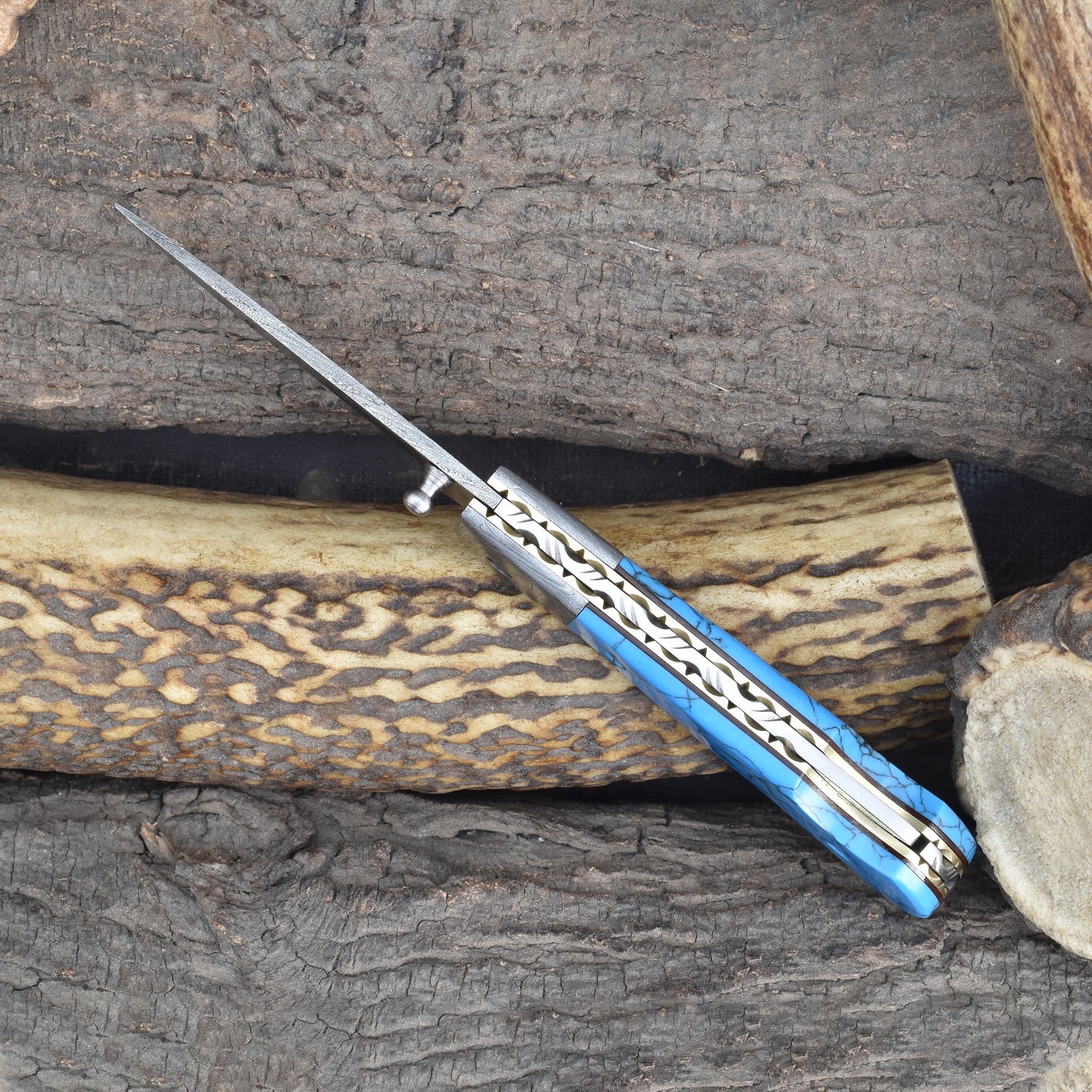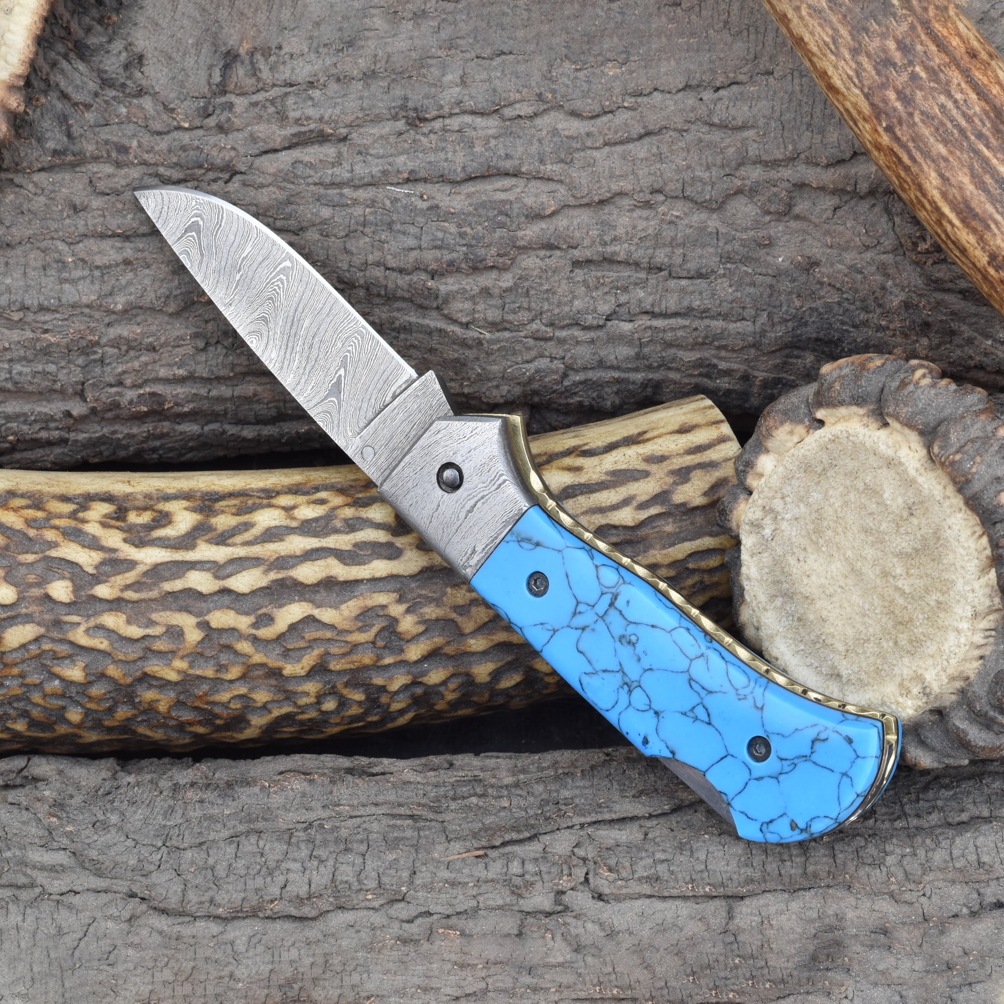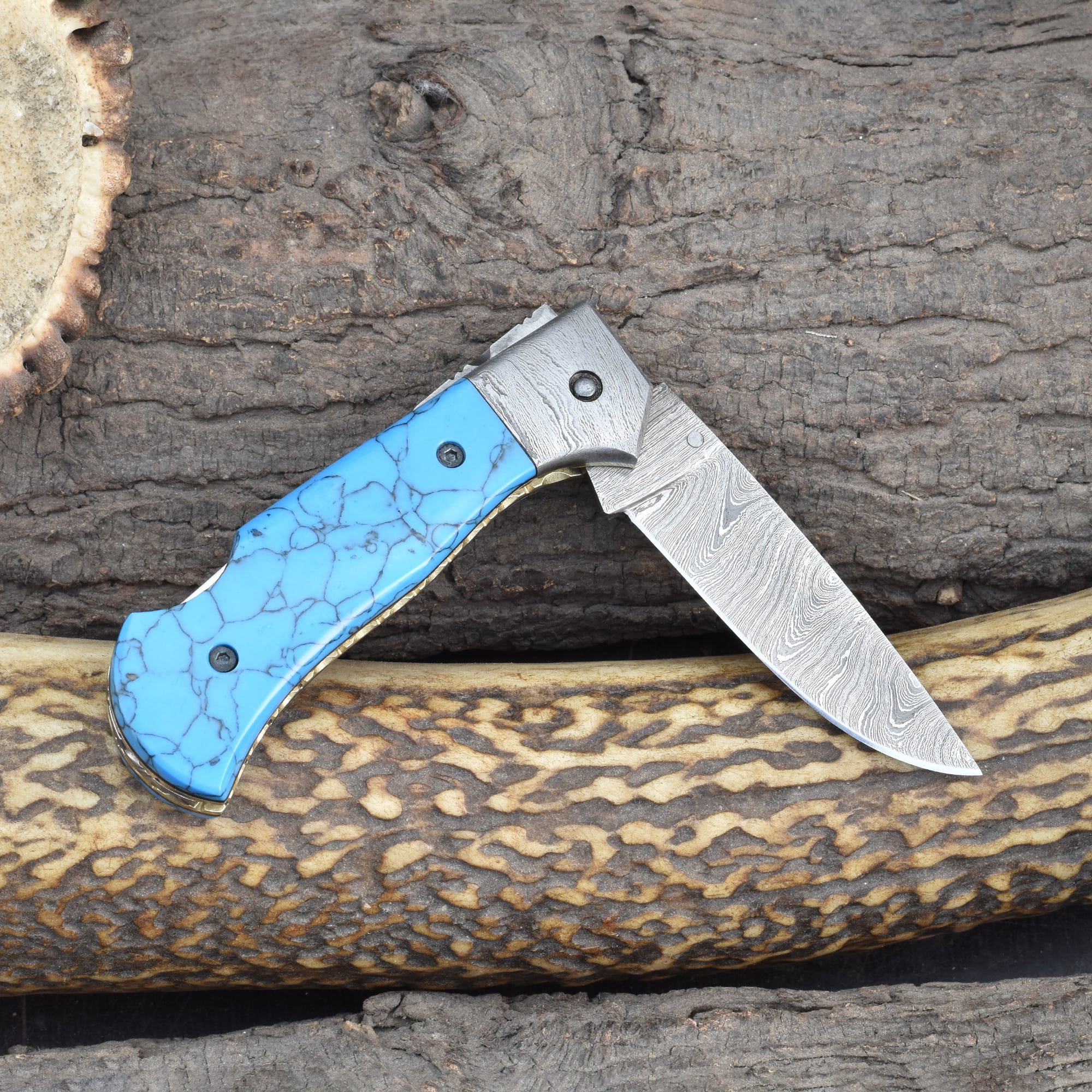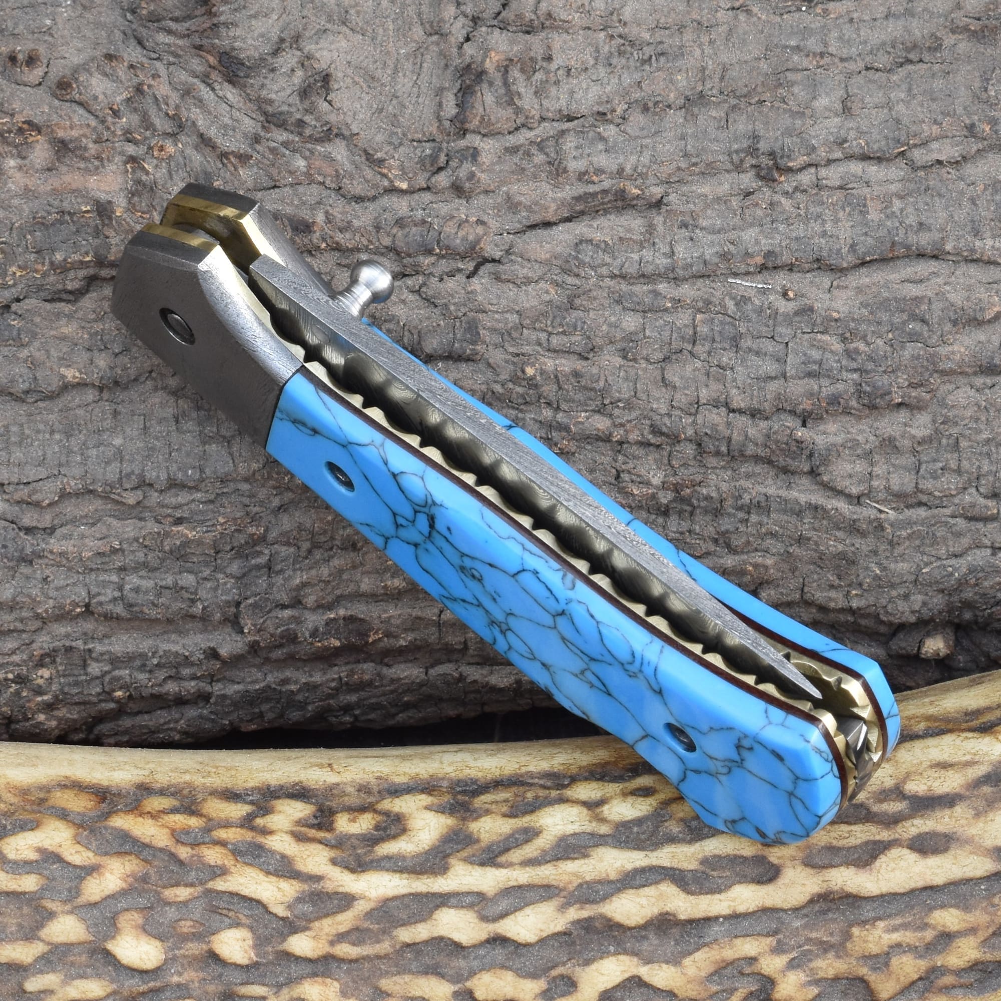 Knives Ranch Folding EDC Knife with Turquoise Composite Handle and Damascus Steel Blade