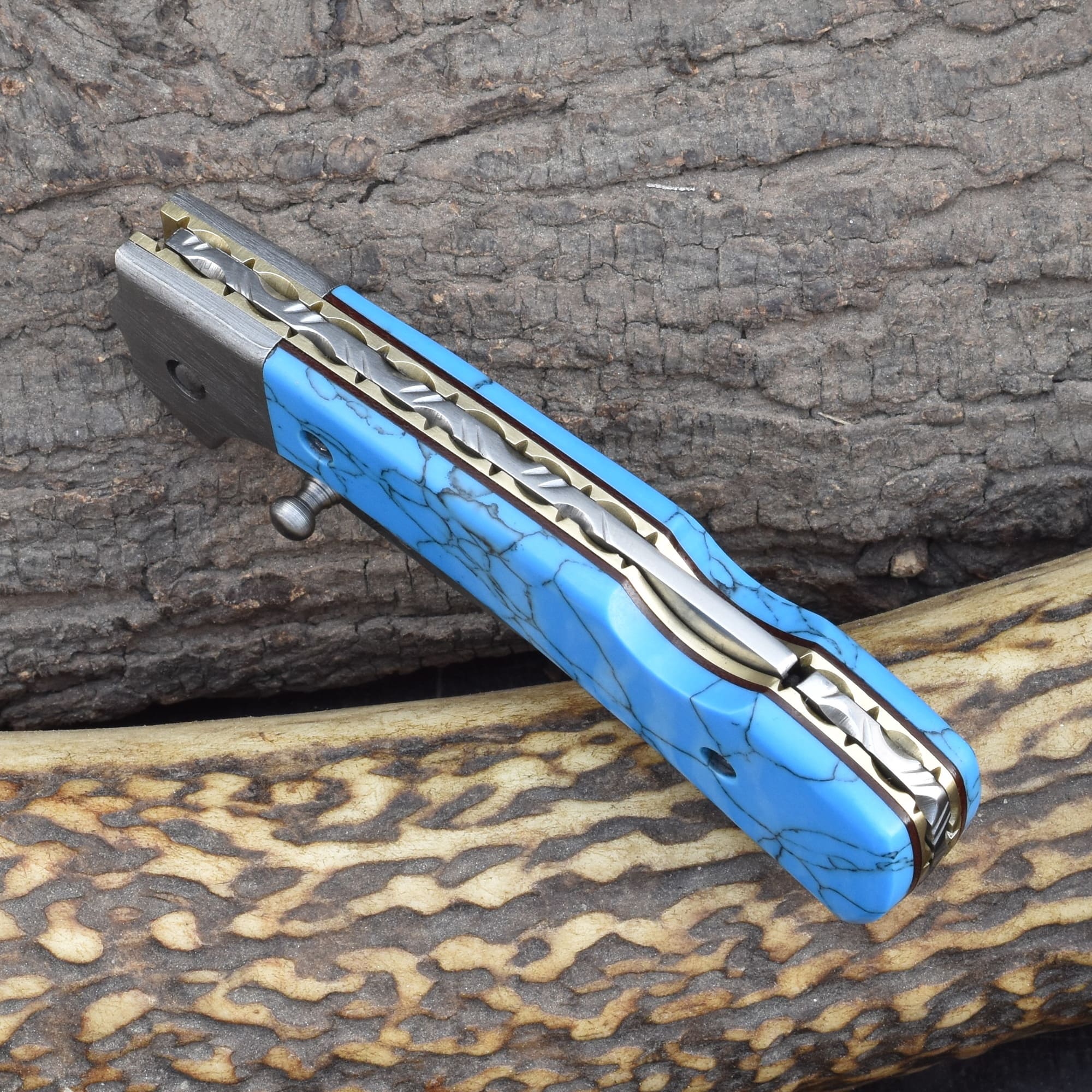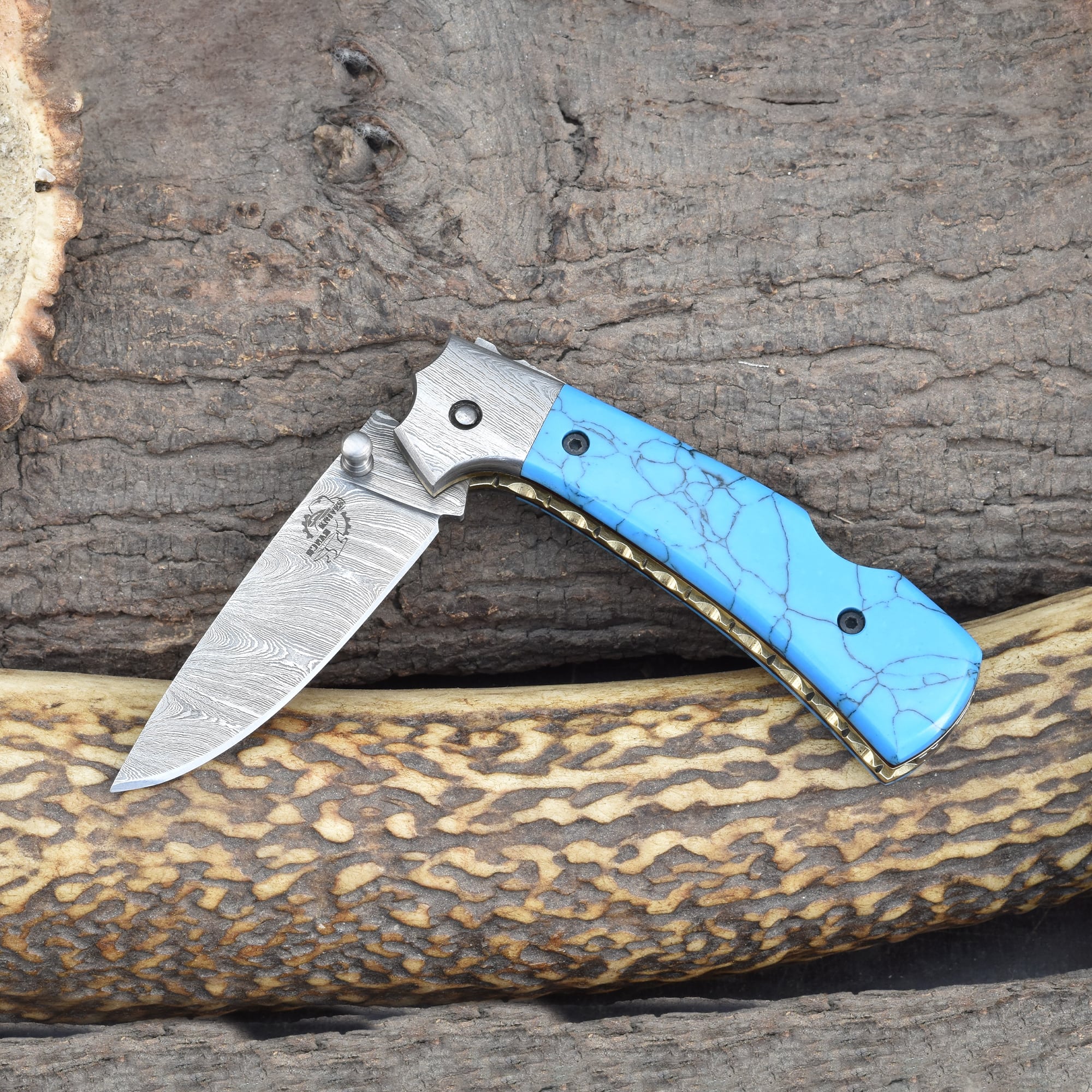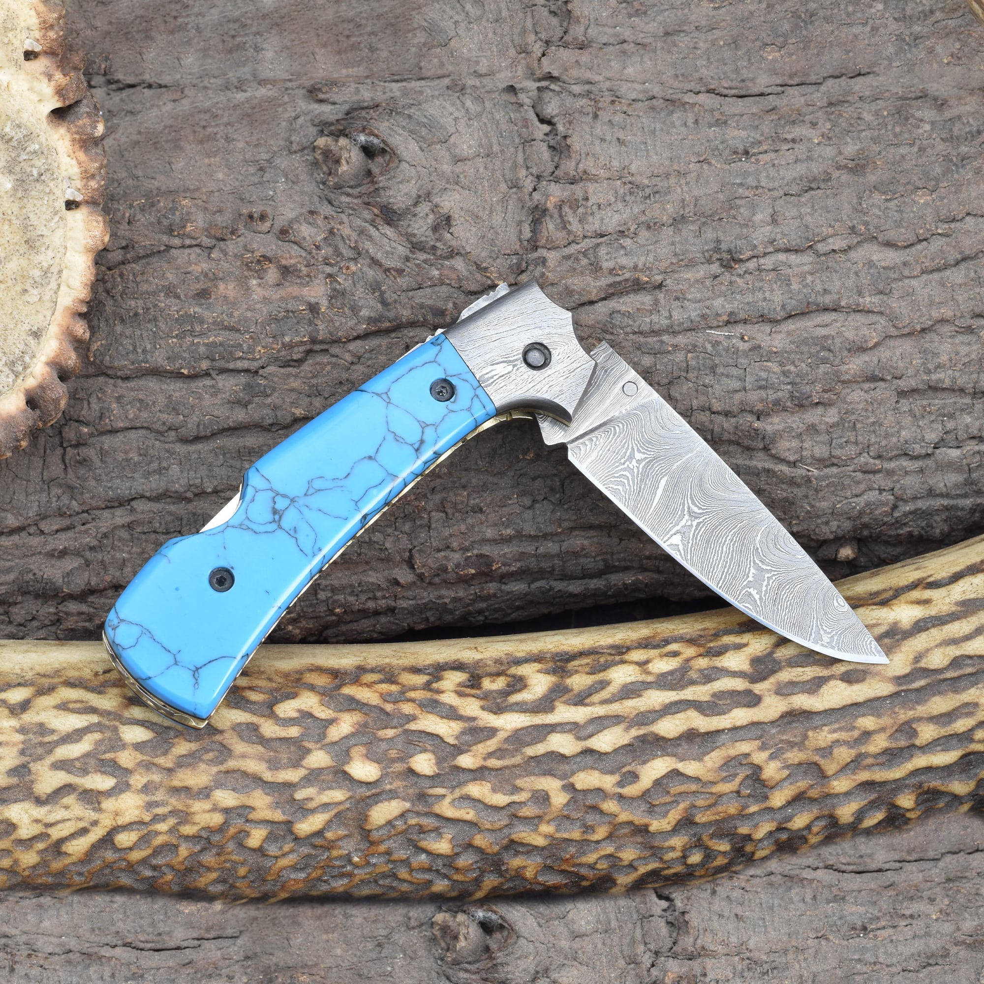 Knives Ranch Folding EDC Knife with Torquise Composite Handle and Damascus Steel Blade