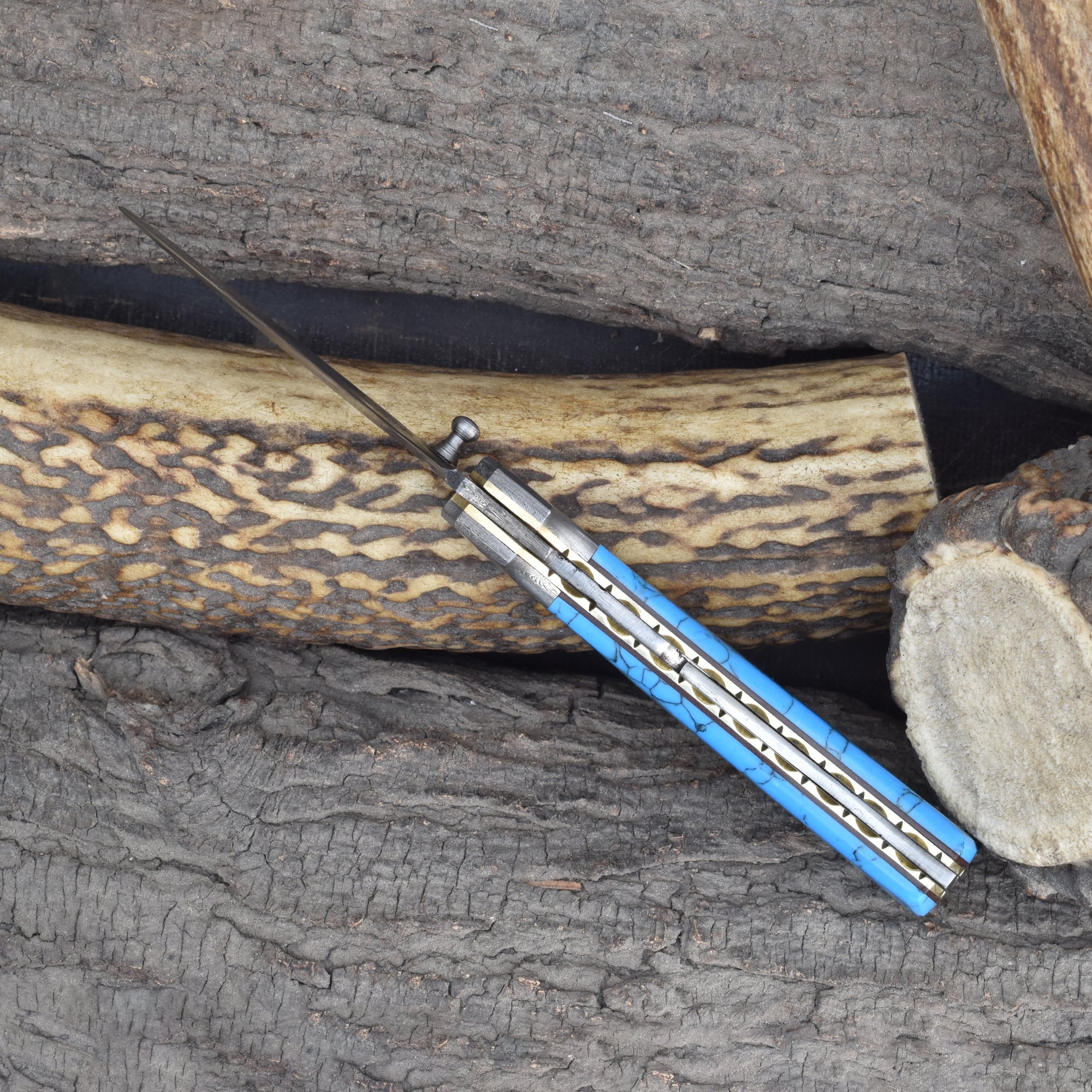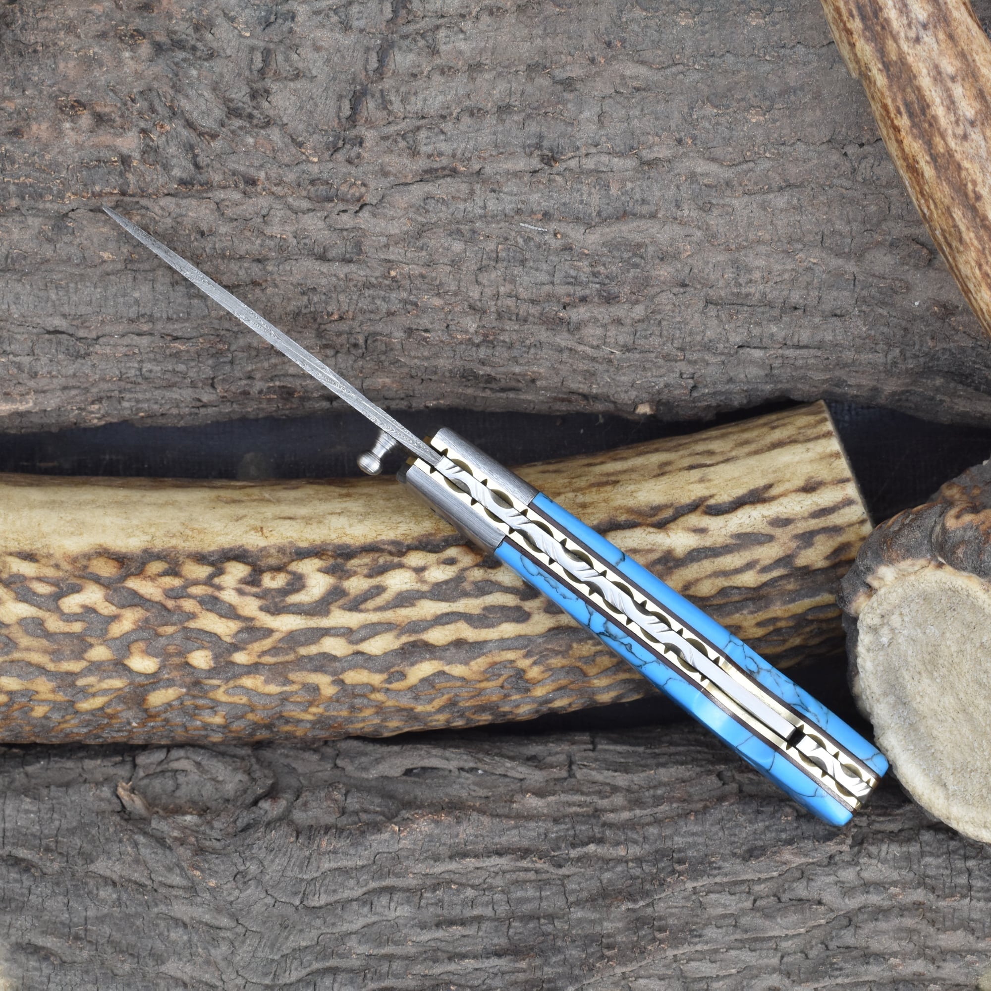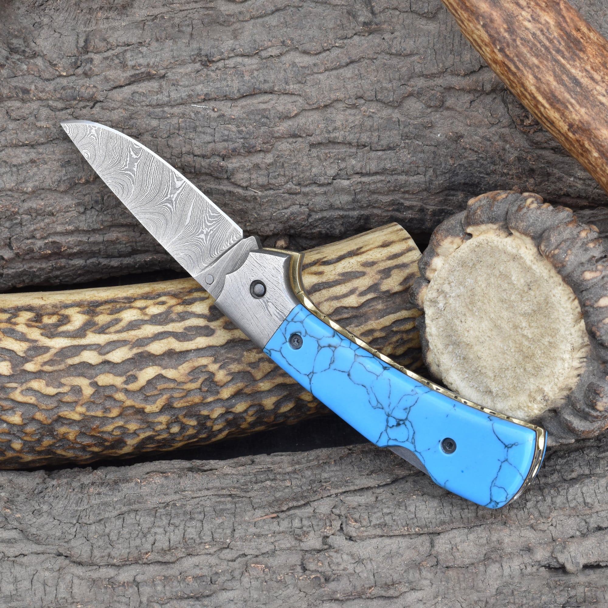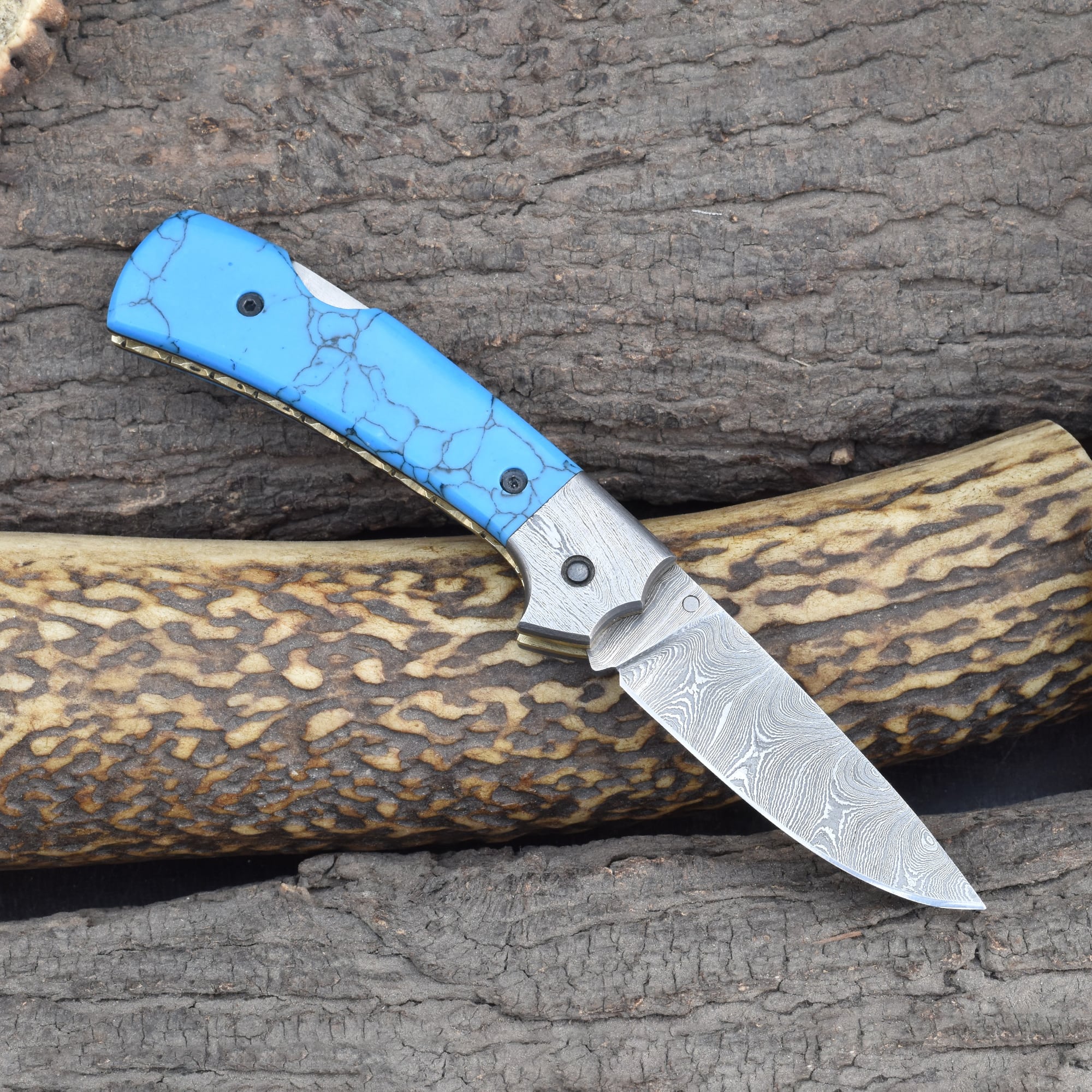 Knives Ranch Folding EDC Knife with Torquise Composite Handle and Damascus Steel Blade