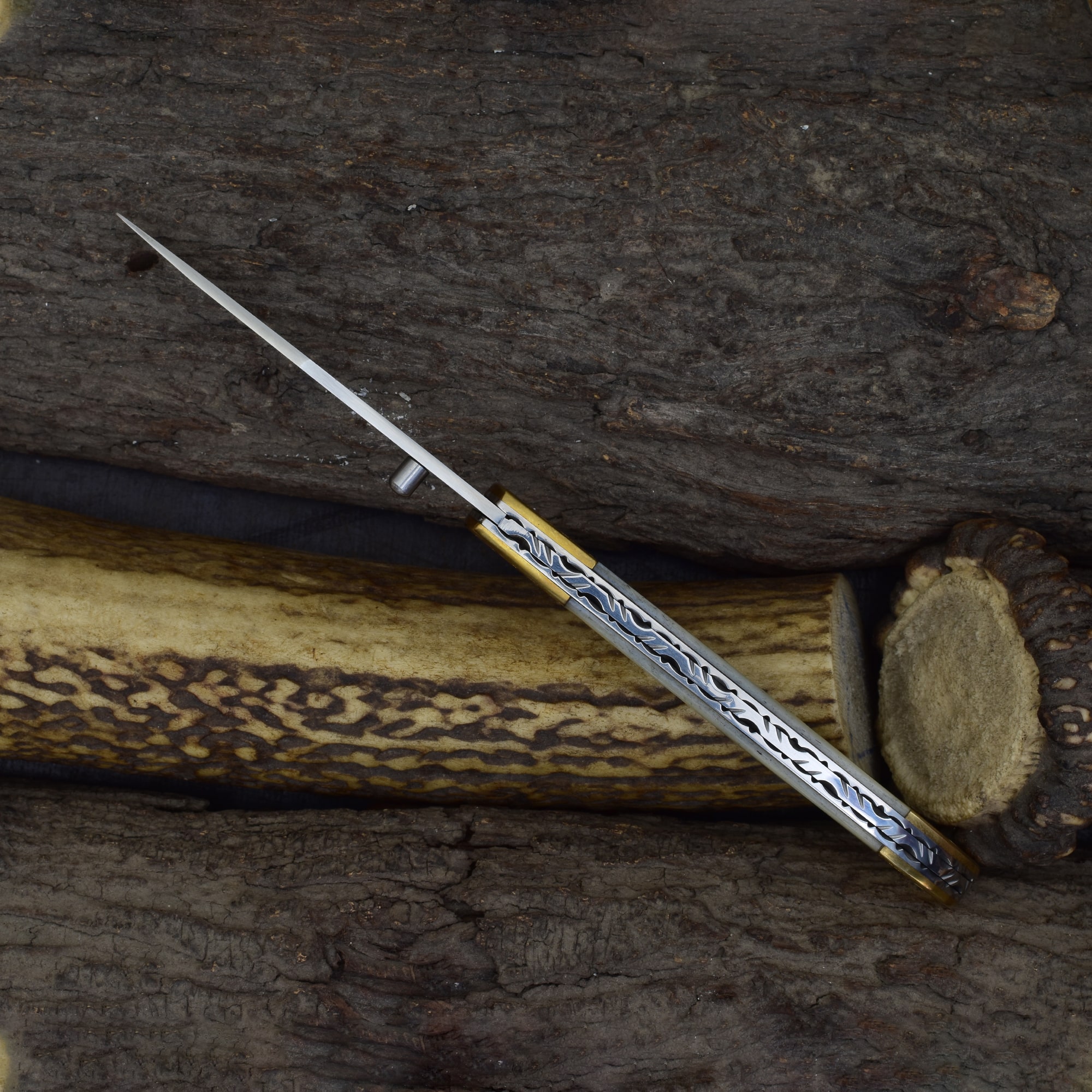 The Knives Ranch Reaper Damascus Folding Knife delivers precision, durability, and style in a compact design. Featuring a 3-1/4" Knives Ranch Exclusive Stainless steel blade, this folding knife offers unmatched strength and sharpness .The Cattle Shin Bone handle provides a distinctive look with a secure, comfortable grip, while the Stainless Steel bolster enhances durability and elegance.