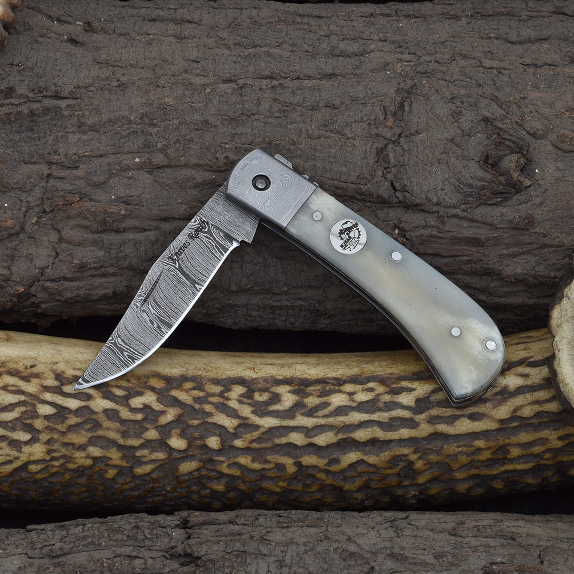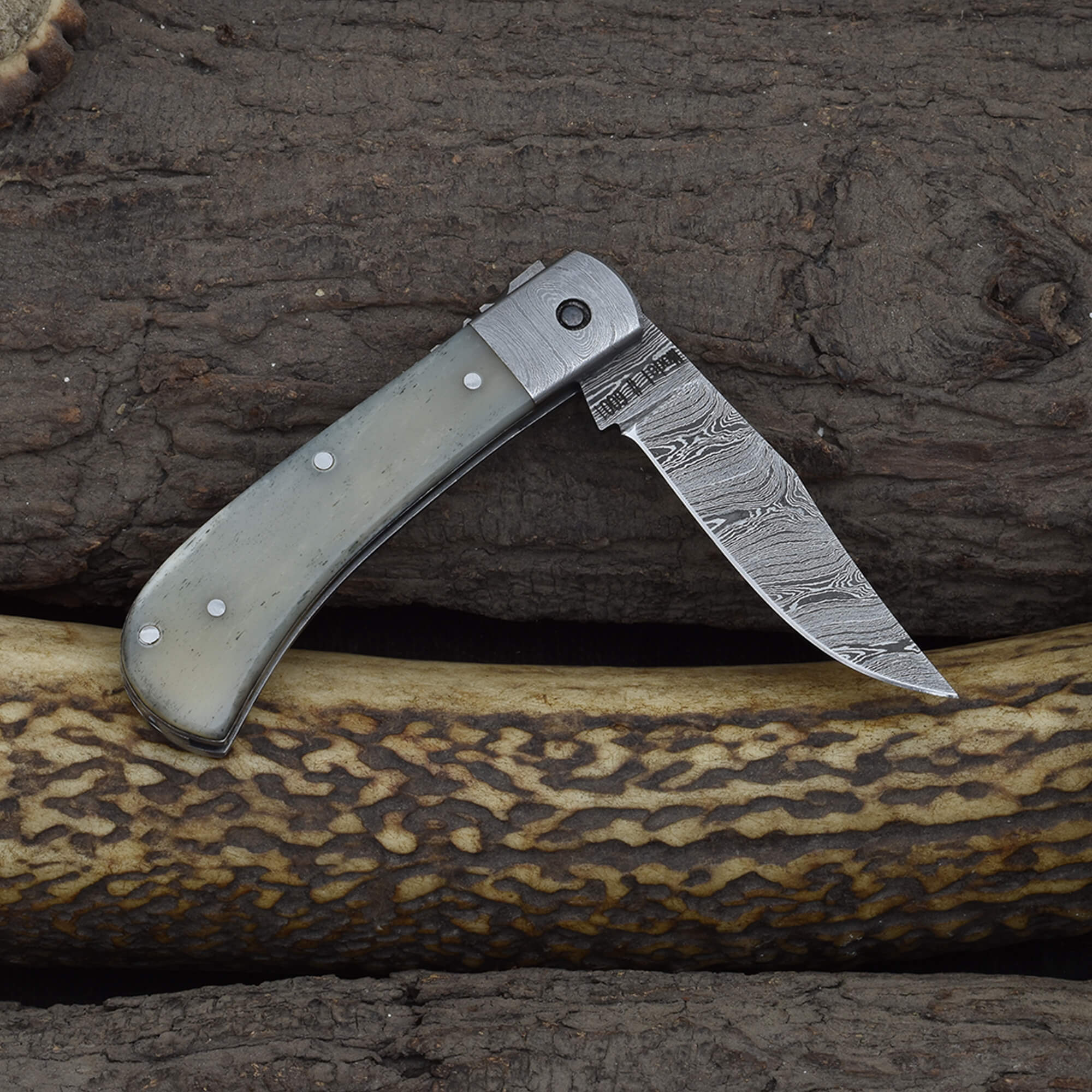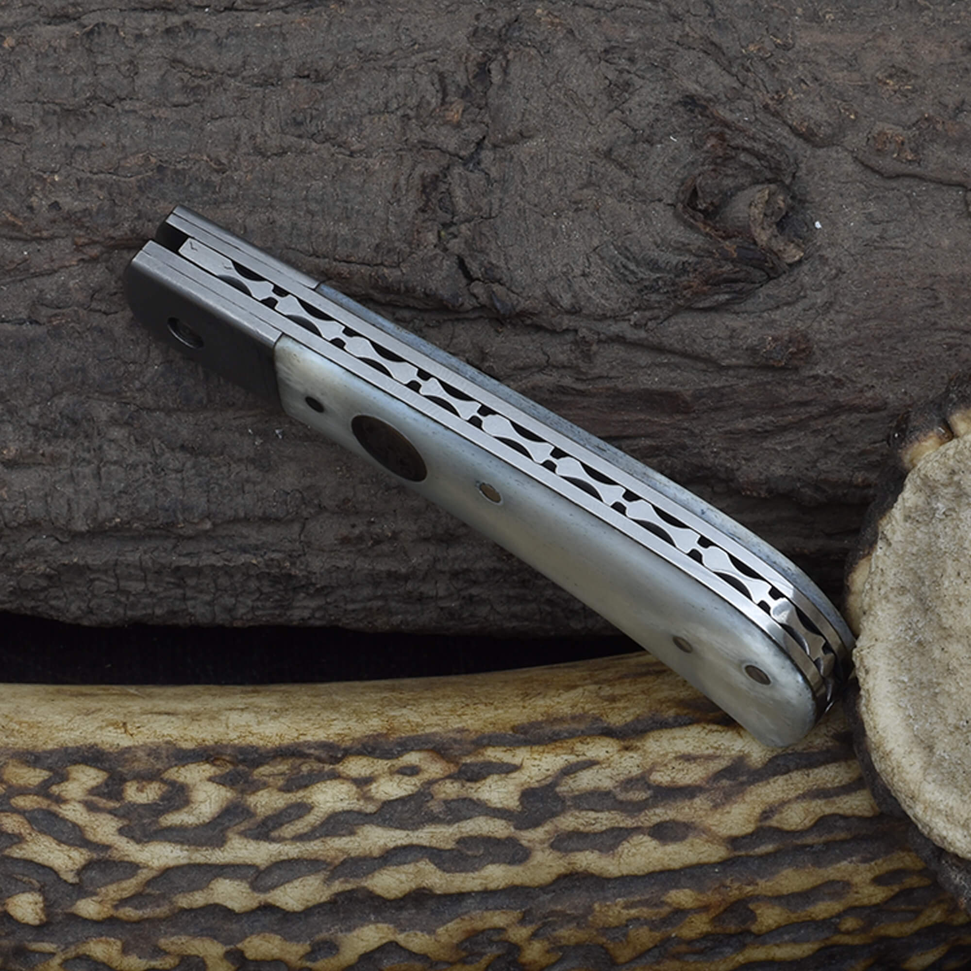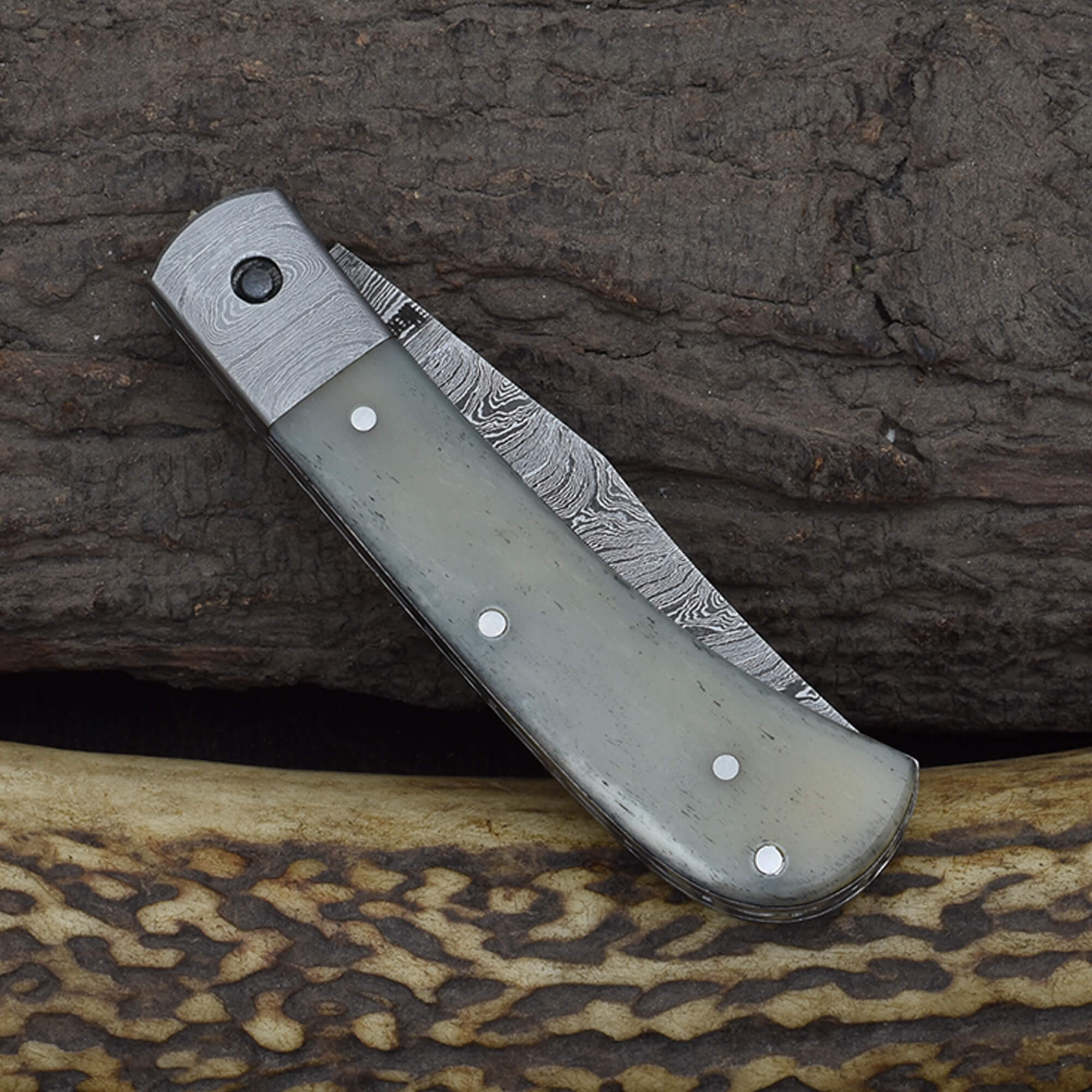 Crafted for traditional pocket knife lovers, this Damascus bone slip joint pocket knife offers a blend of classic charm and cutting-edge durability. Featuring Damascus steel blade, heat-treated in a vacuum furnace, it delivers exceptional sharpness and reliability for everyday use. The bone handle with stainless steel bolsters gives it a timeless, handcrafted appearance while providing a comfortable and firm grip. This knife is compact, functional, and designed for those who appreciate elegant craftsmanship