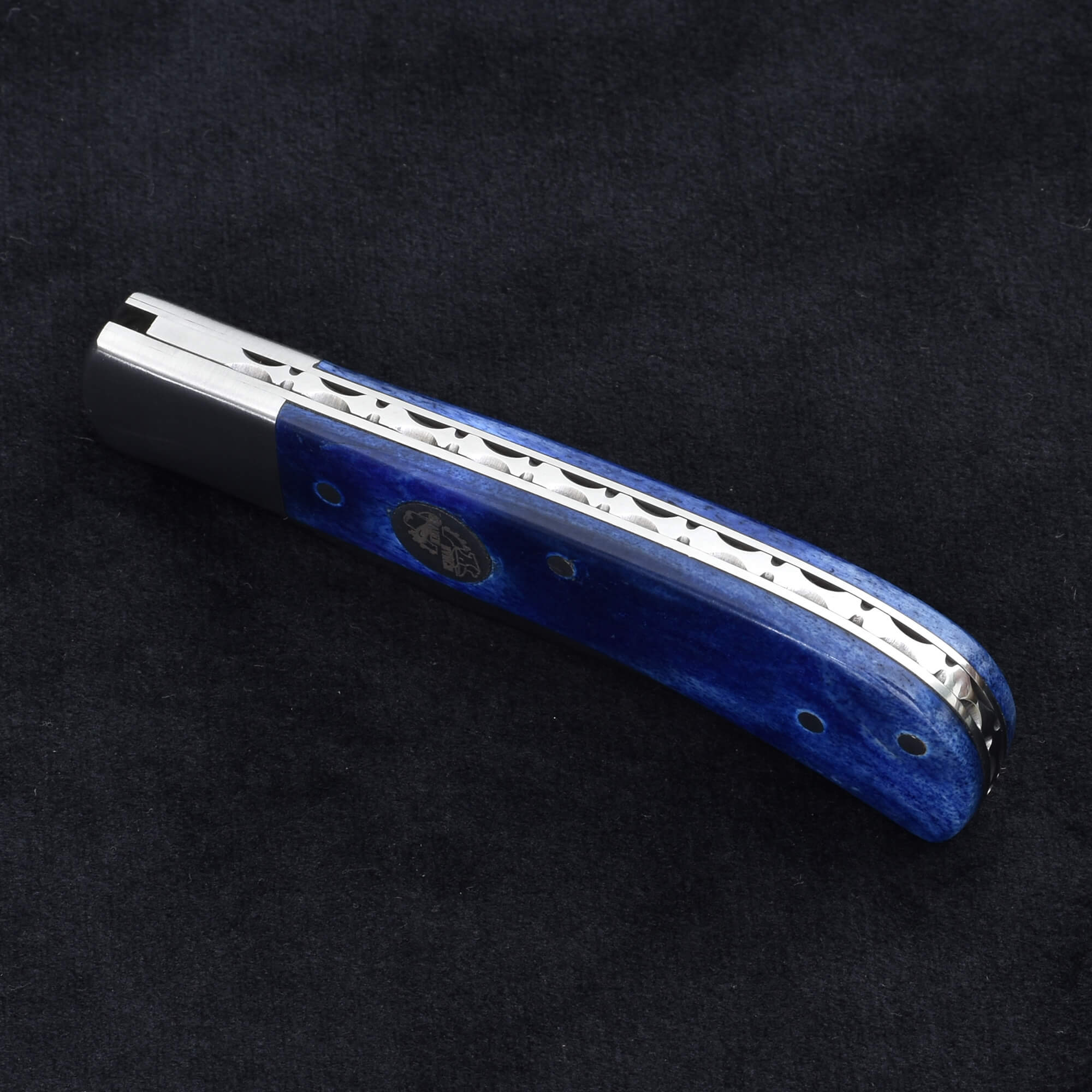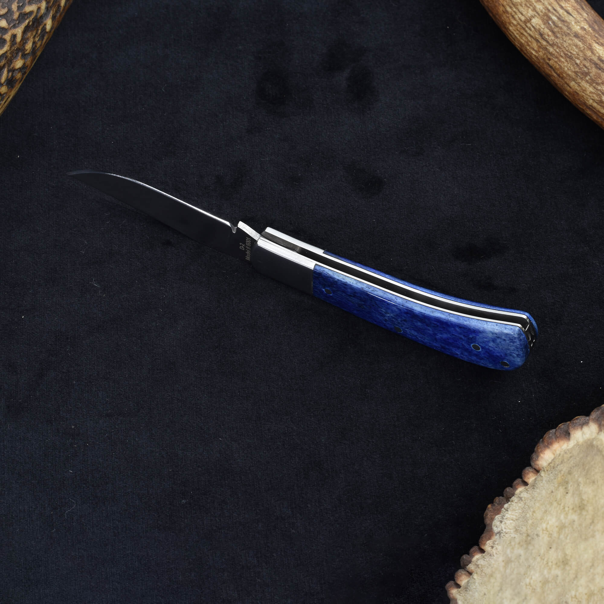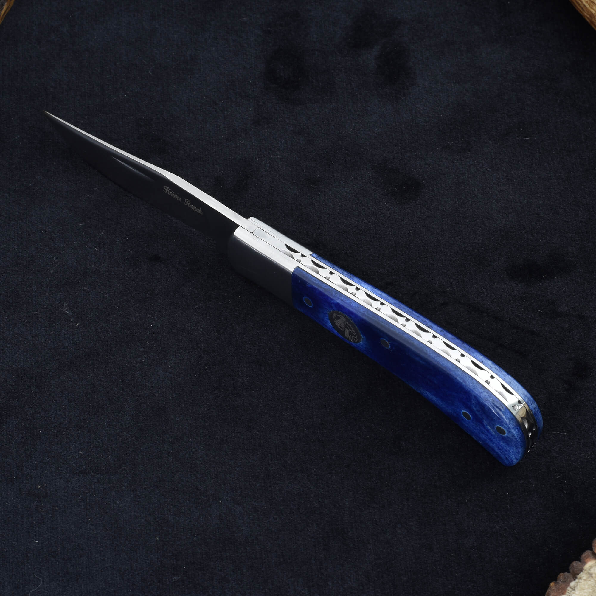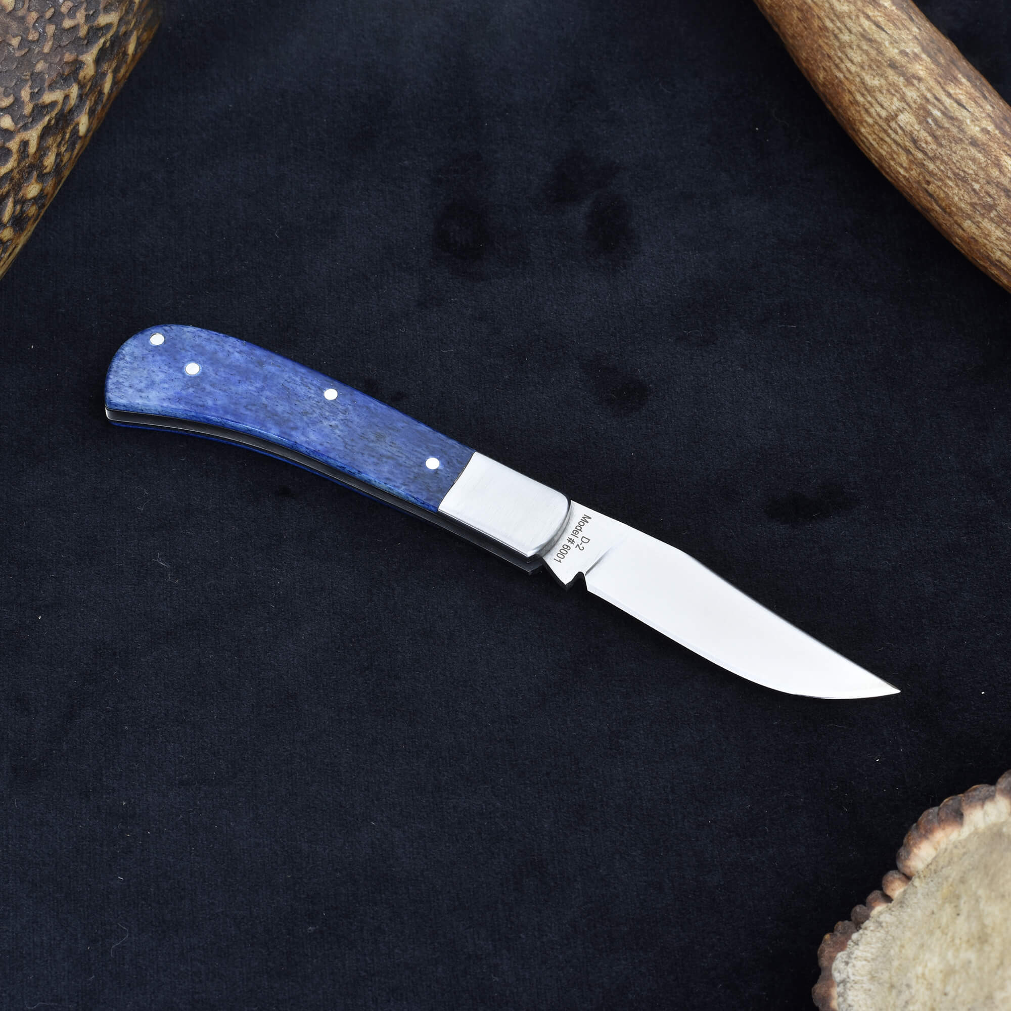 Compact and stylish, the Knives Ranch Folding Pocket Knife combines durability with refined craftsmanship. The 2-5/8” blade, forged from 420-J2 stainless steel, is expertly heat treated in a vacuum furnace for superior sharpness and long-lasting performance. Its slip joint design allows smooth, reliable operation, while the stainless steel bolster adds both strength and a sleek finish. The blue dyed bone handle provides a unique, comfortable grip with eye-catching appeal. Complete with a Vegetable Tanned Leather leather belt-mount pouch, this knife offers secure and convenient carry wherever you go.