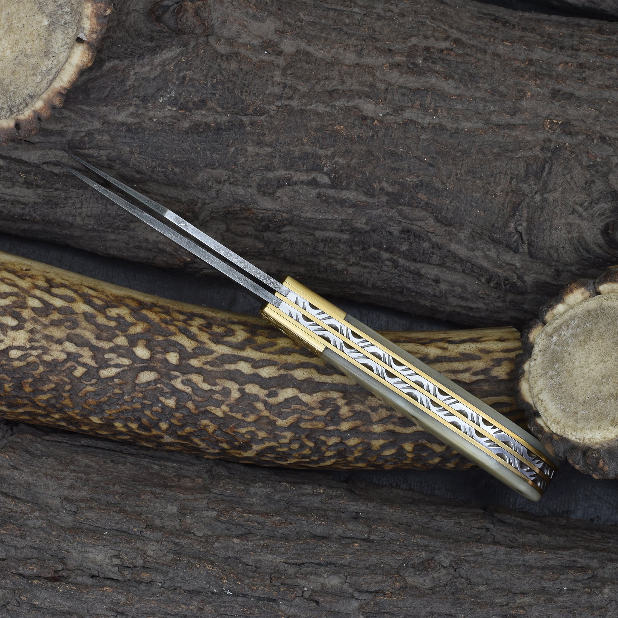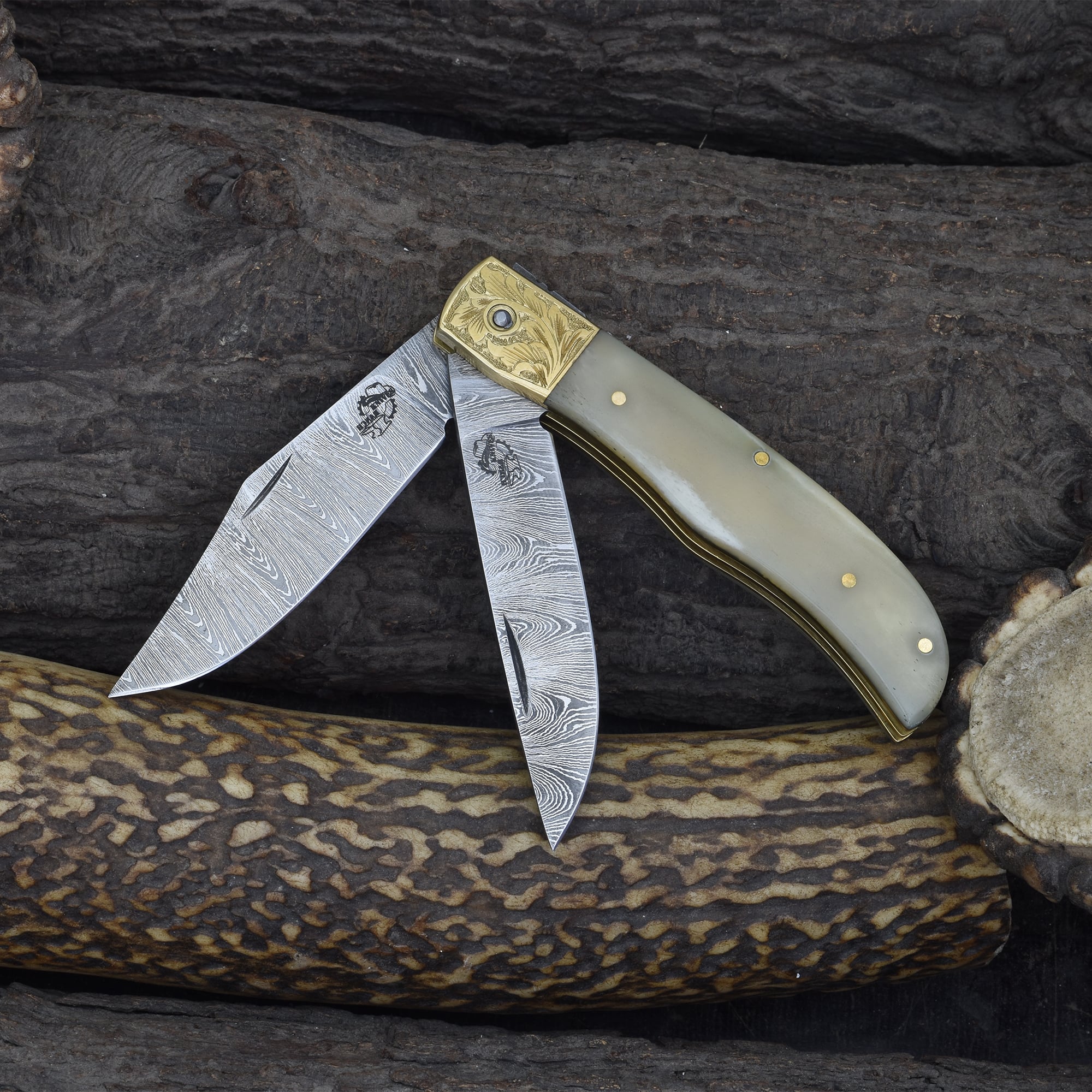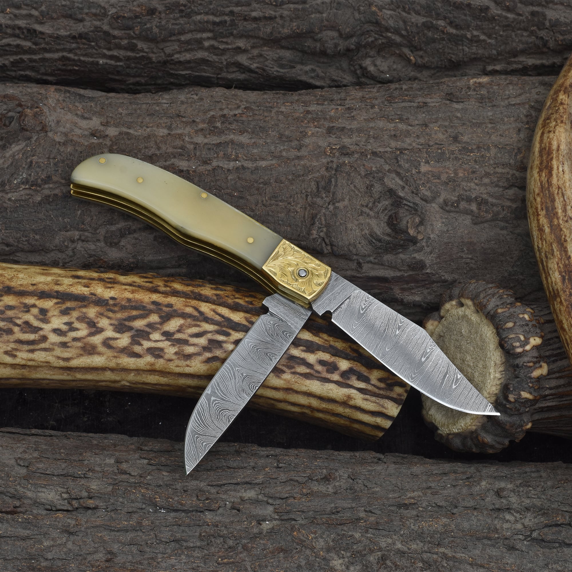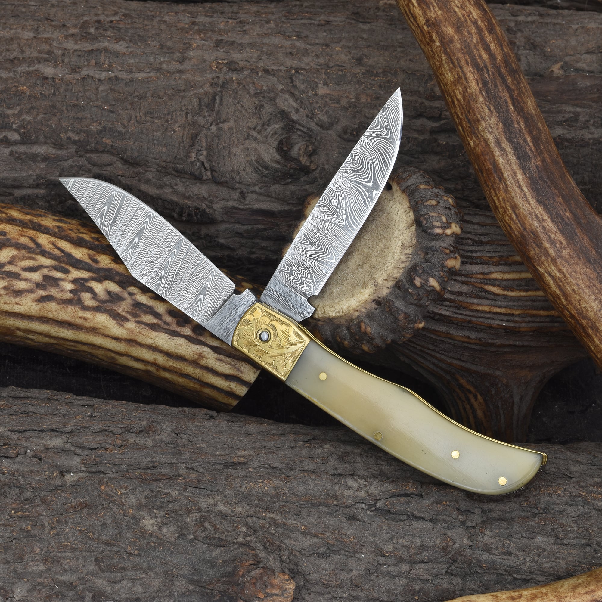 Knives Ranch Damascus Double Blade Folding Knife with Bone Handle and Vertical Belt Pouch