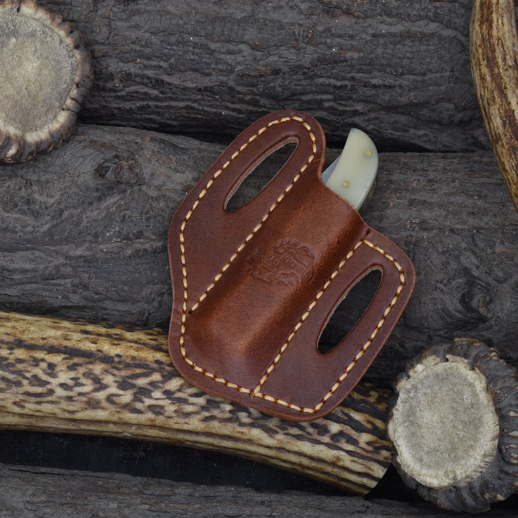 Experience the perfect blend of tradition and utility with the Knives Ranch Damascus Double Blade Folding Knife. This compact knife features two 3" blades forged from premium Damascus steel with a 3/32" thickness, ensuring sharpness and durability for everyday tasks. The Damascus brass bolsters add strength and a refined aesthetic, while the classic bone handle offers a comfortable and secure grip. When closed, the knife measures 4" and fits snugly in the durable Vegetable Tanned Leather vertical belt pouch for convenient and safe carry.